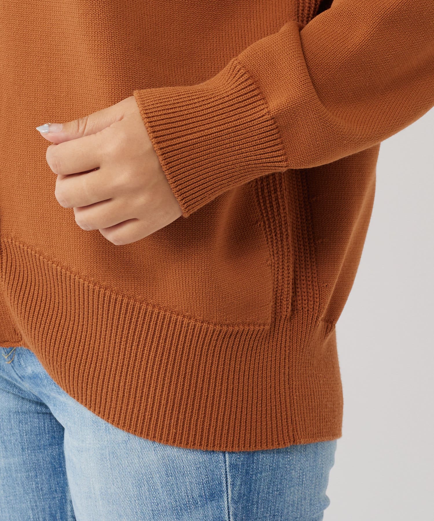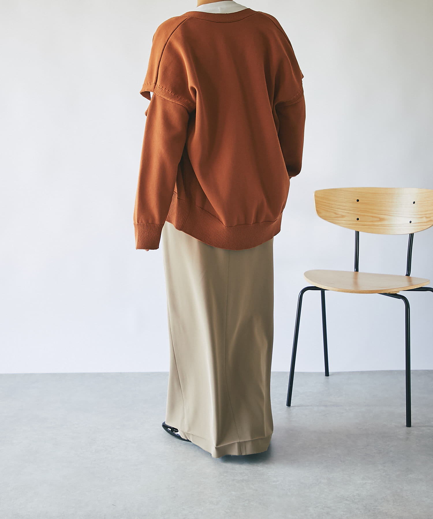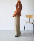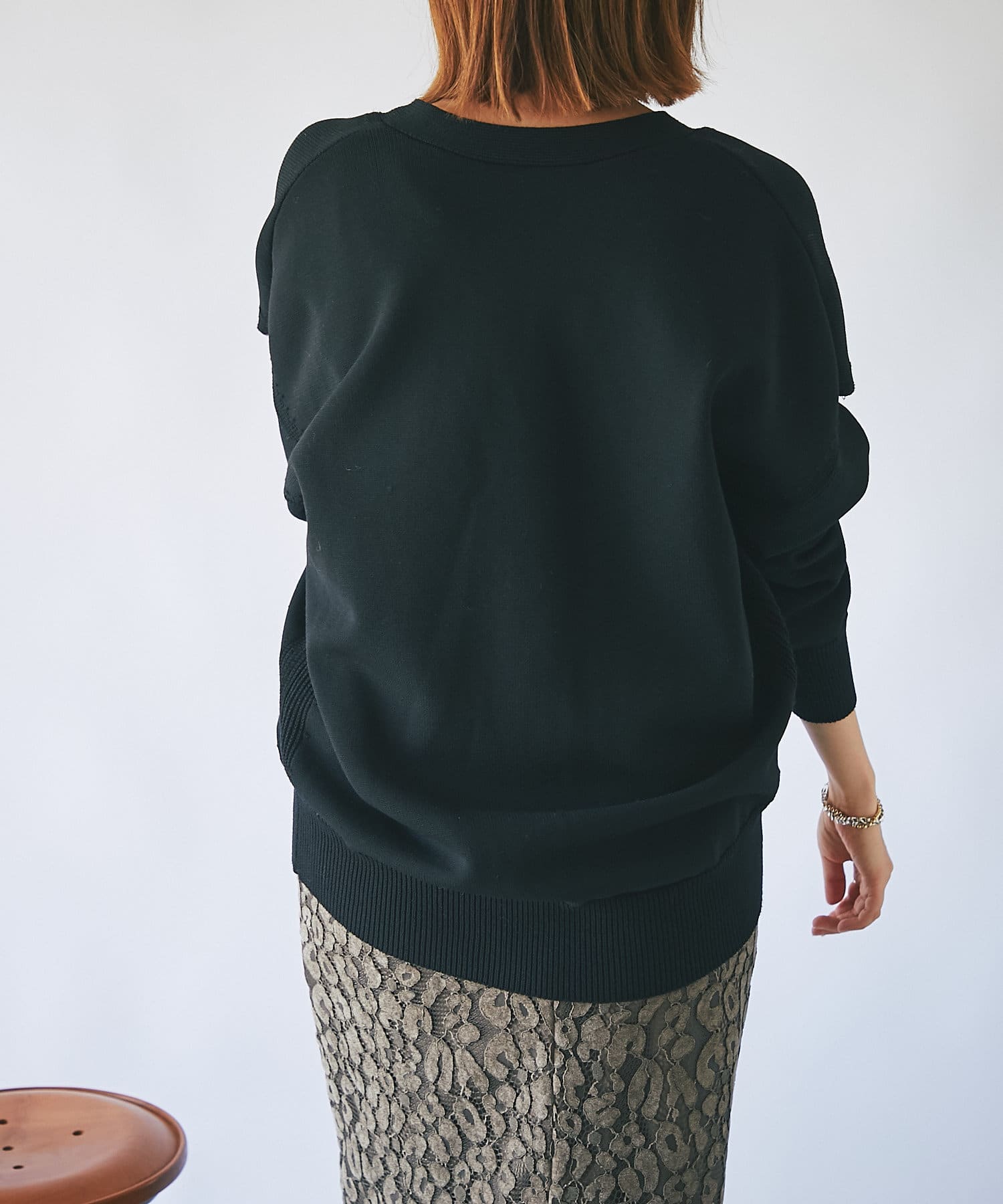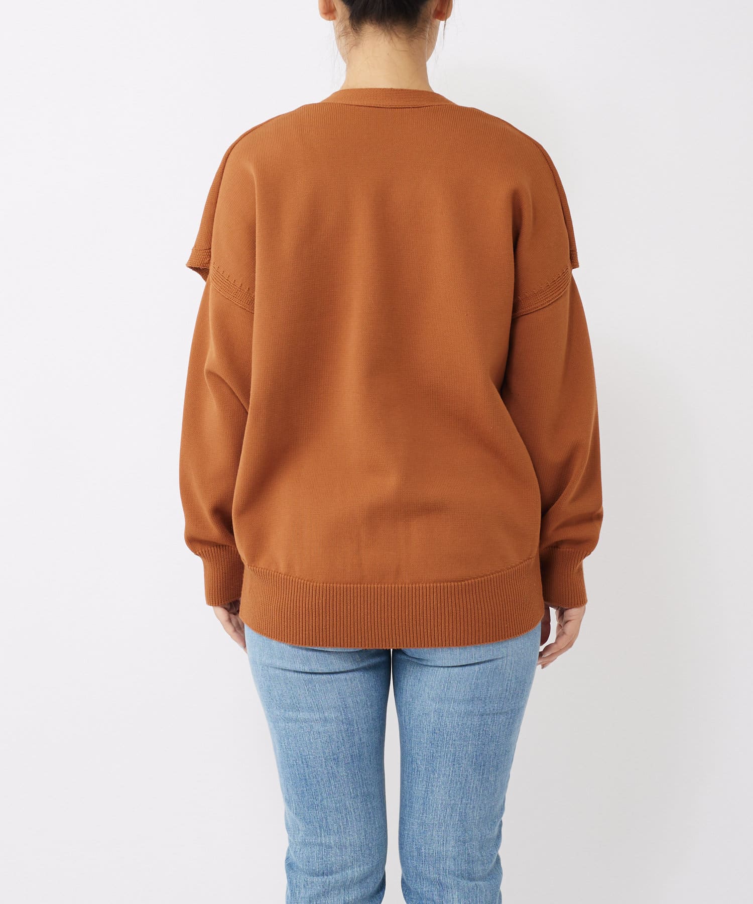 軽量でハリのある編み地とオーバーサイズな仕立ては着用することで立体的で丸みのあるシルエットを生み出します。                                                                     やや深めのVネック開きはデコルテラインをすっきり見せ女性らしさを演出。