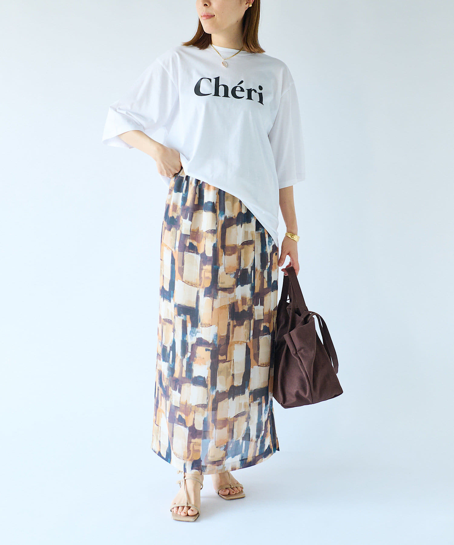 また、シンプルなデザインを引き立たせる柄スカートなども相性抜群。