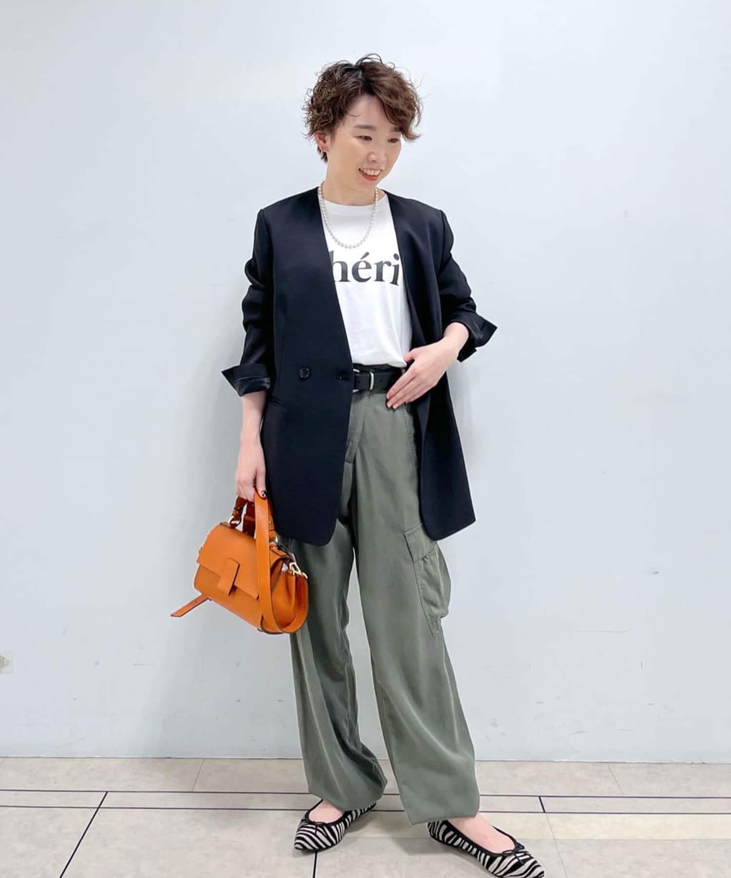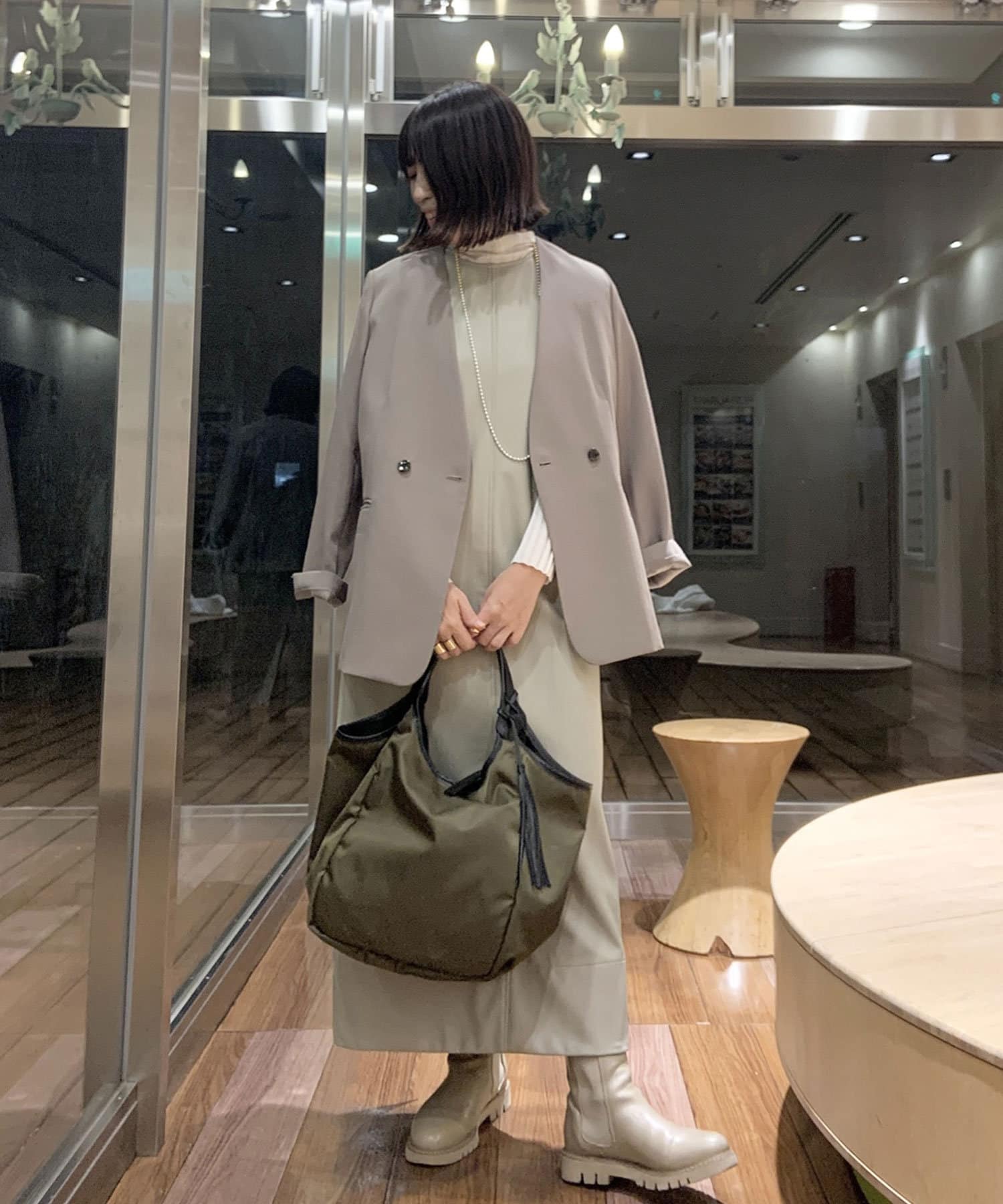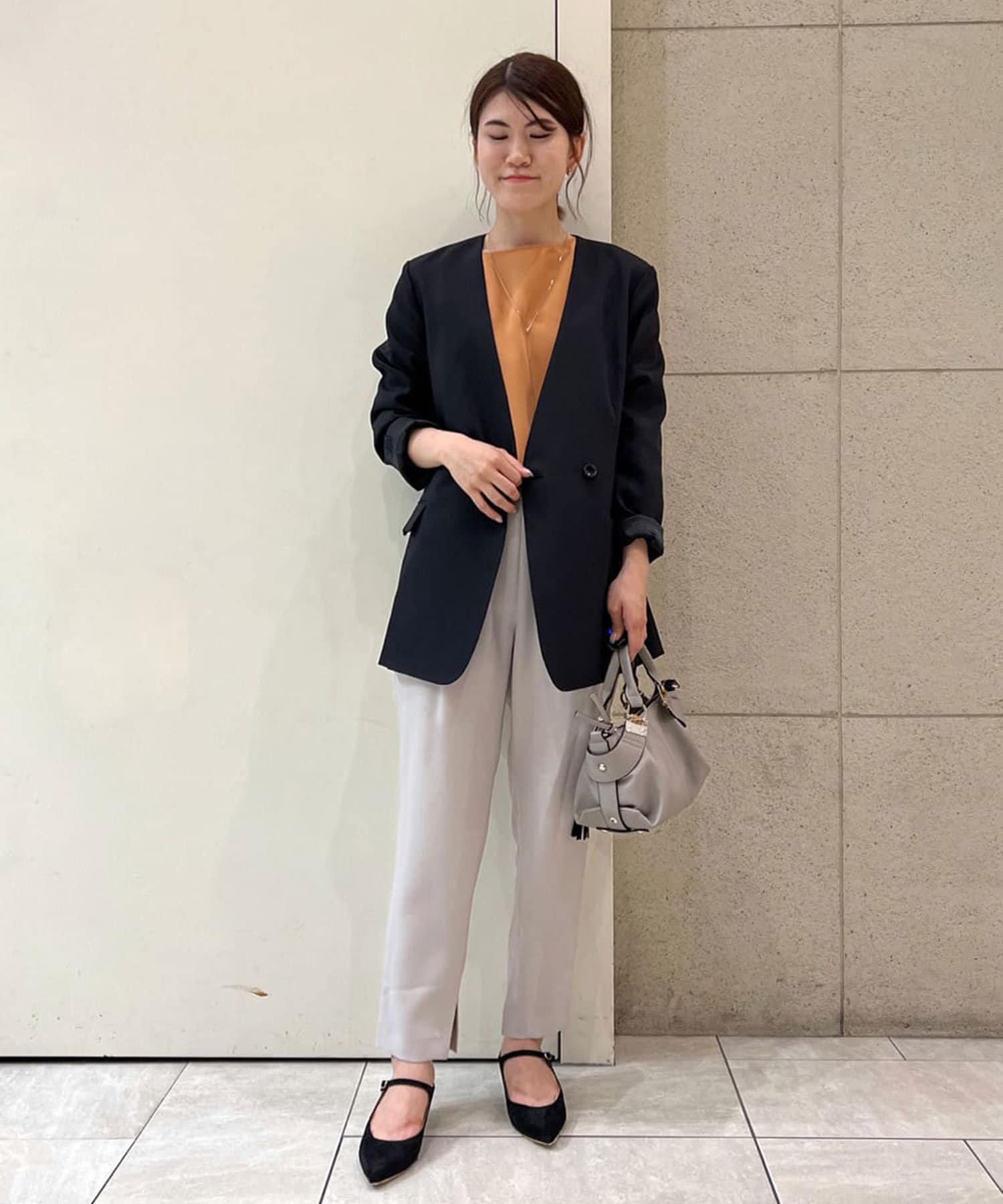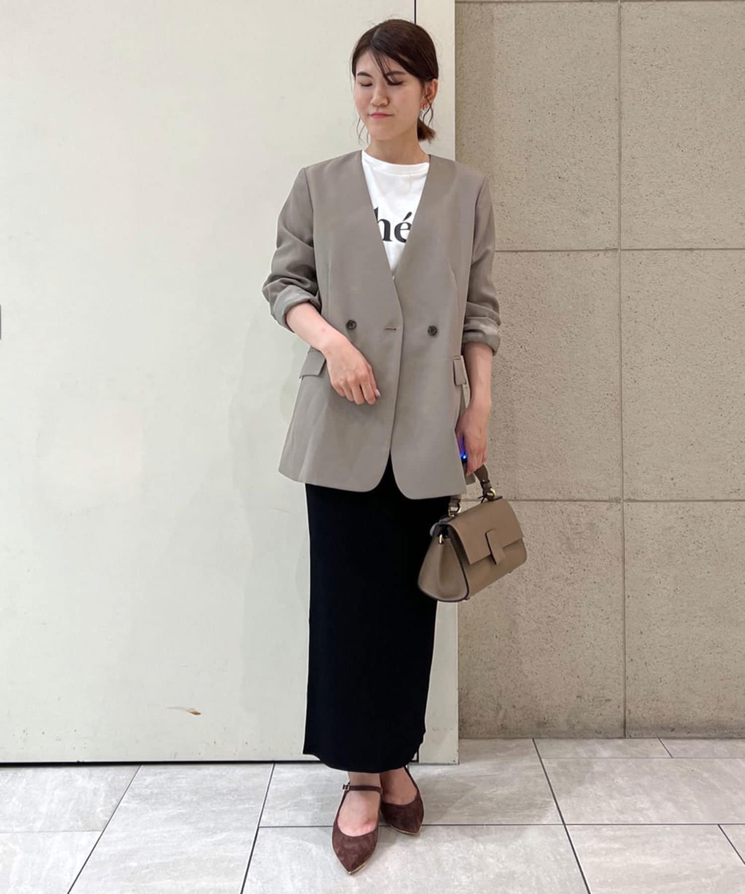 襟元がすっきりしているのでインナーのブラウスを合わせて、きれいめコーデがおすすめです。