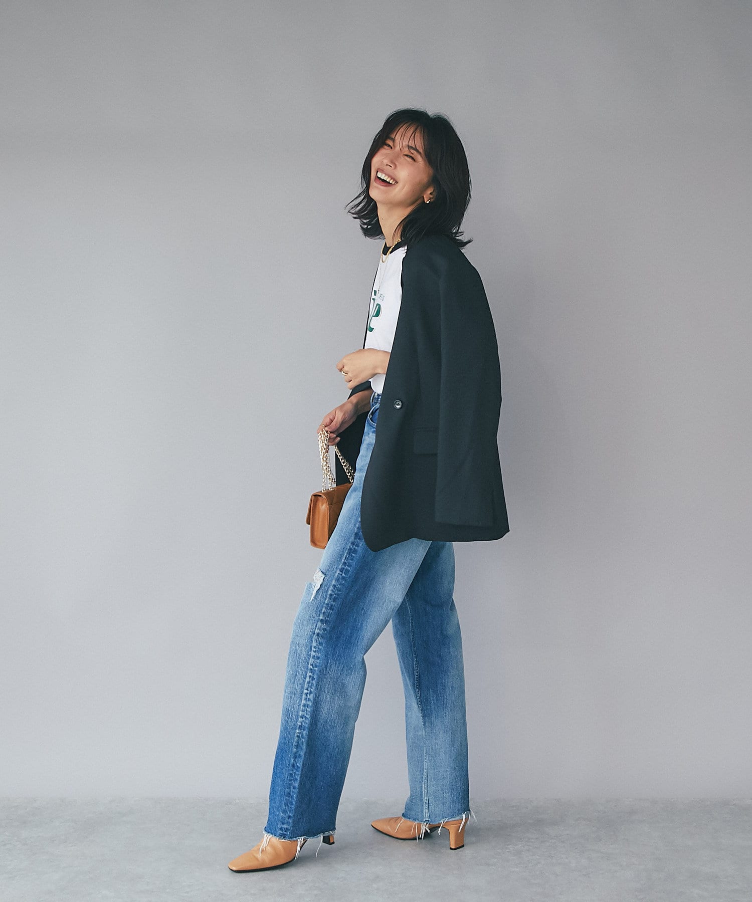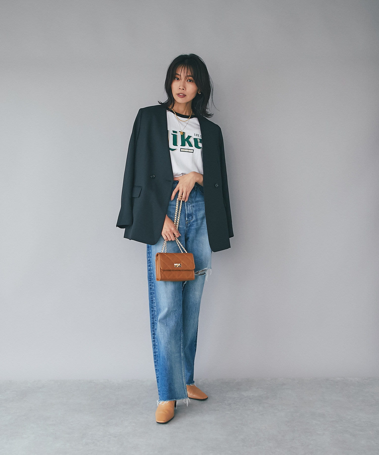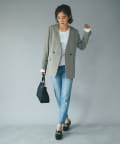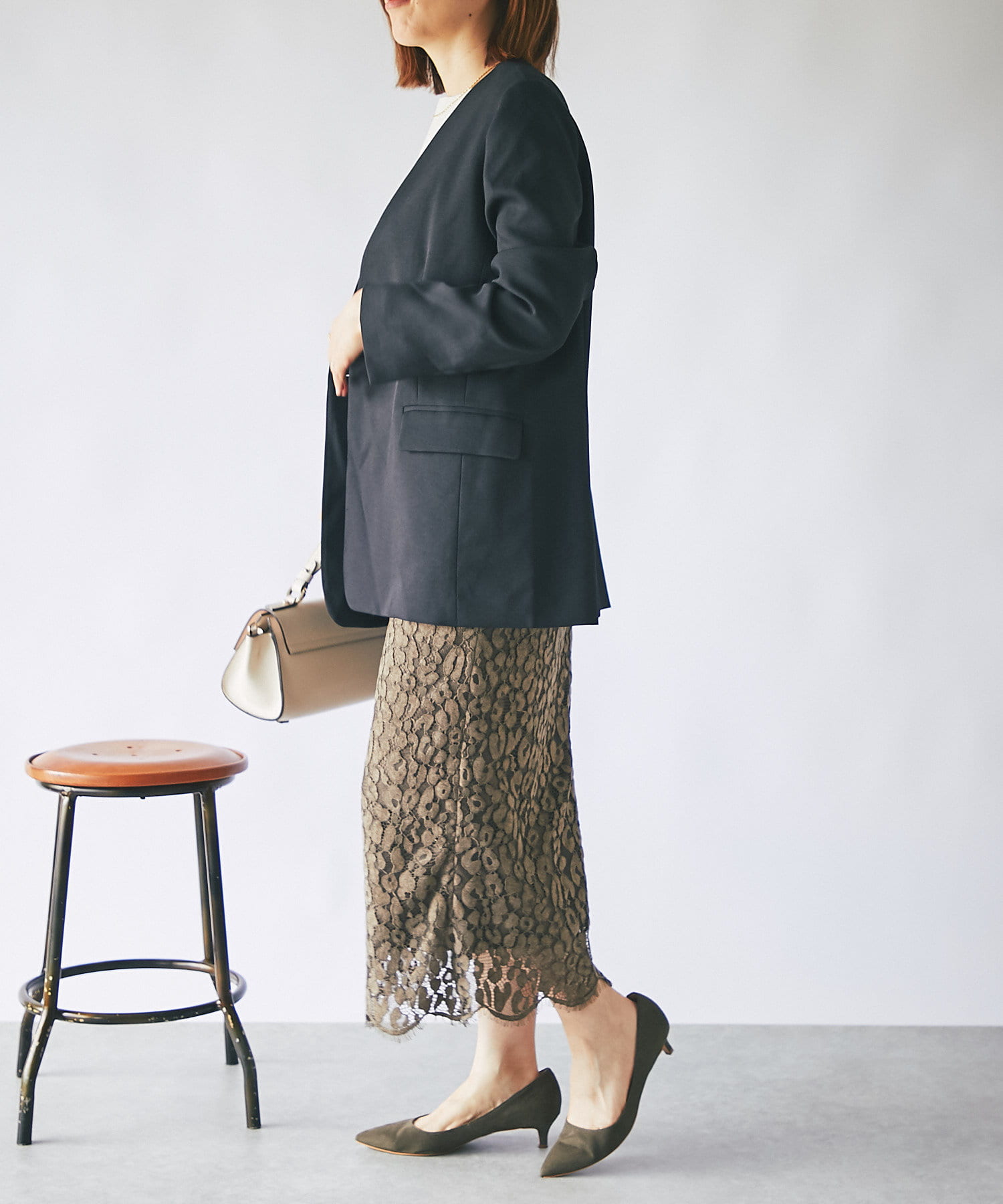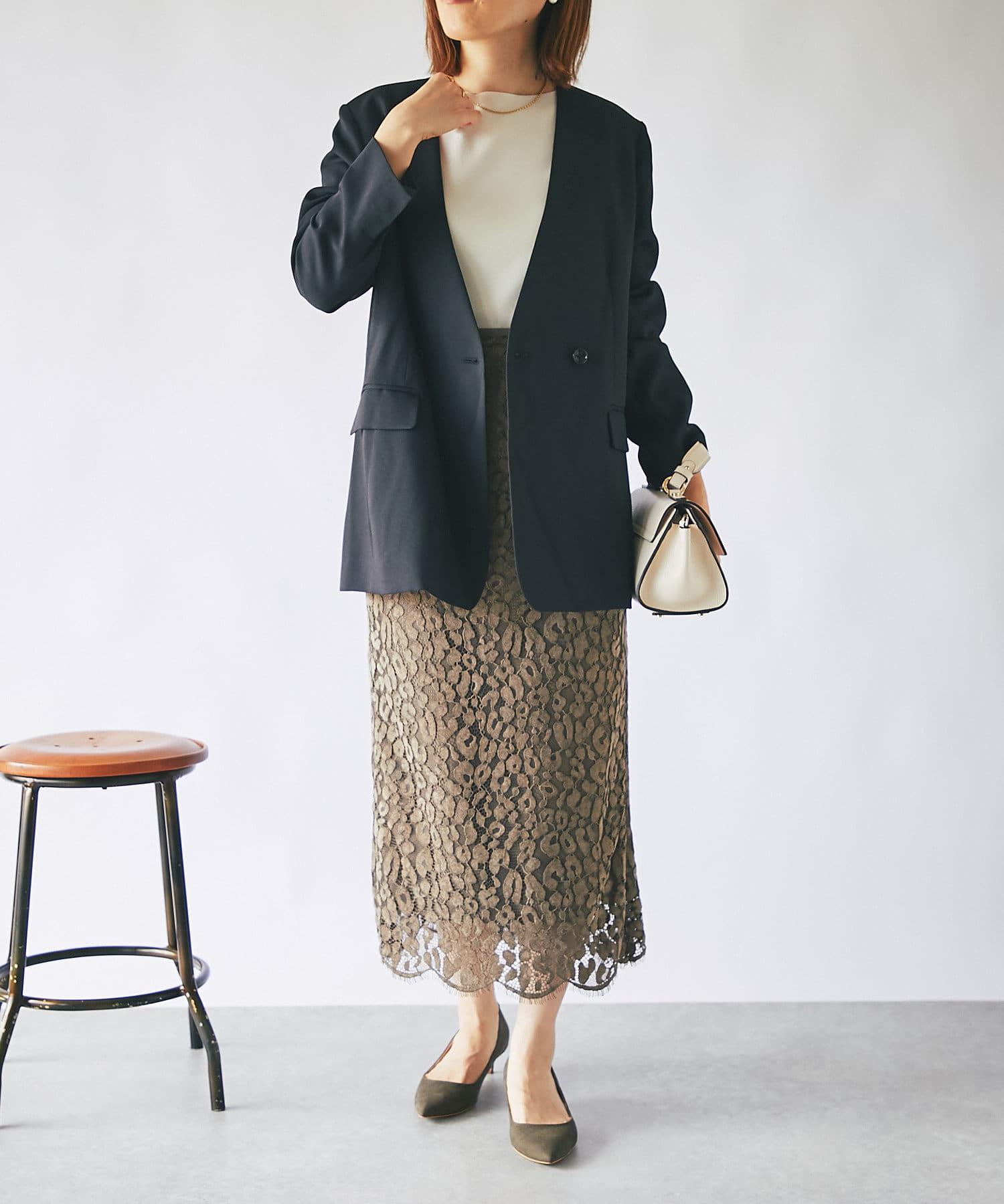 襟元がすっきりしているのでインナーのブラウスを合わせて、きれいめコーデがおすすめです。