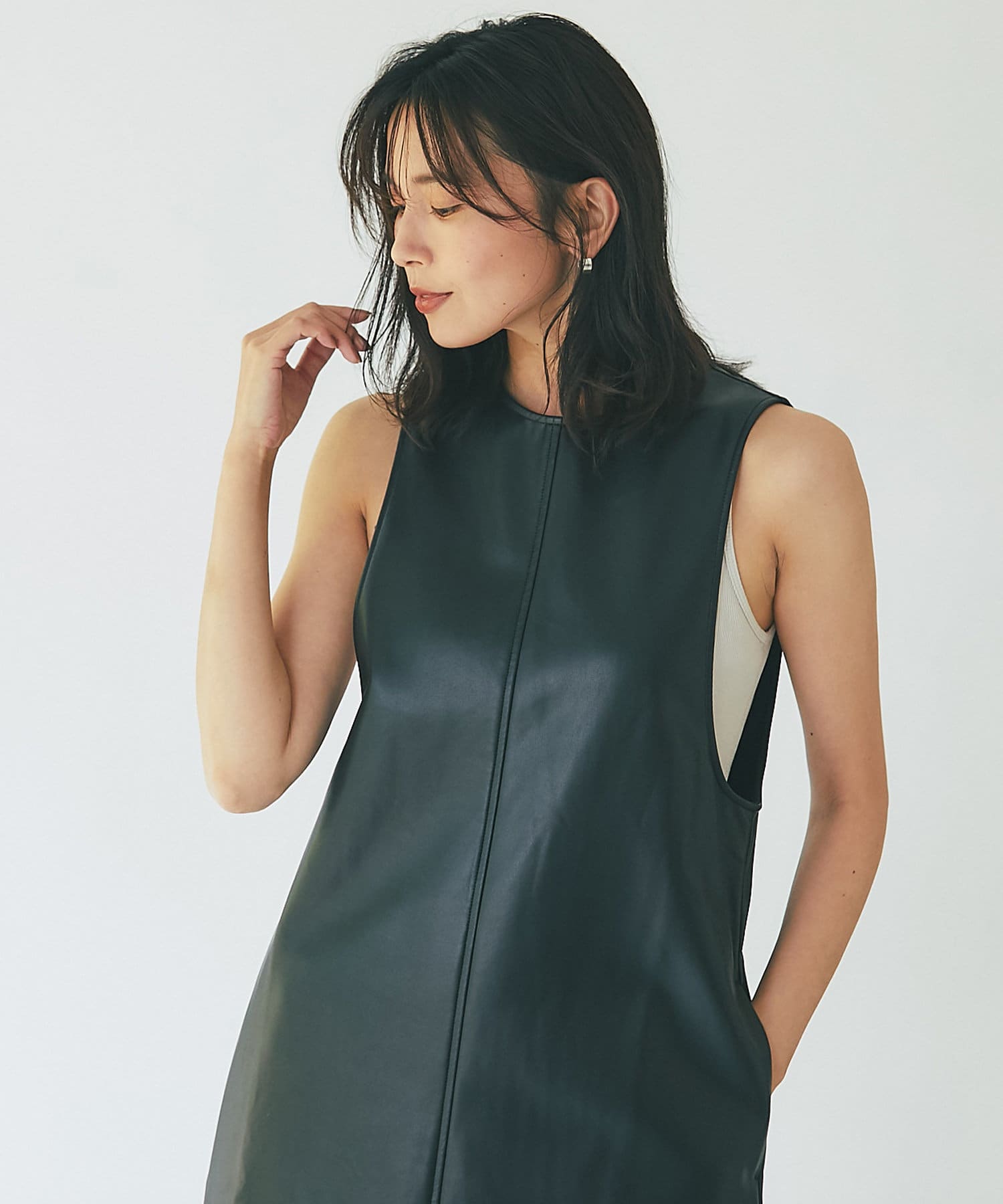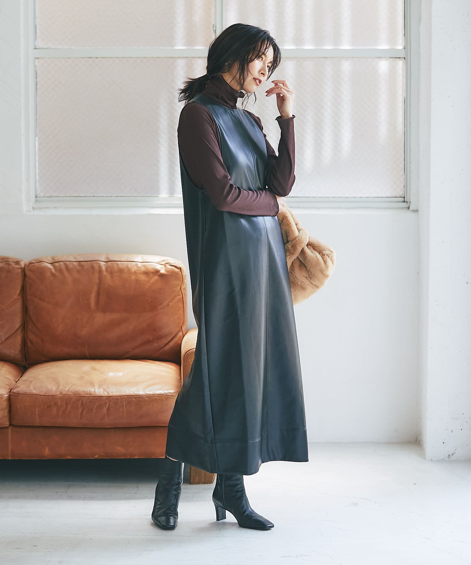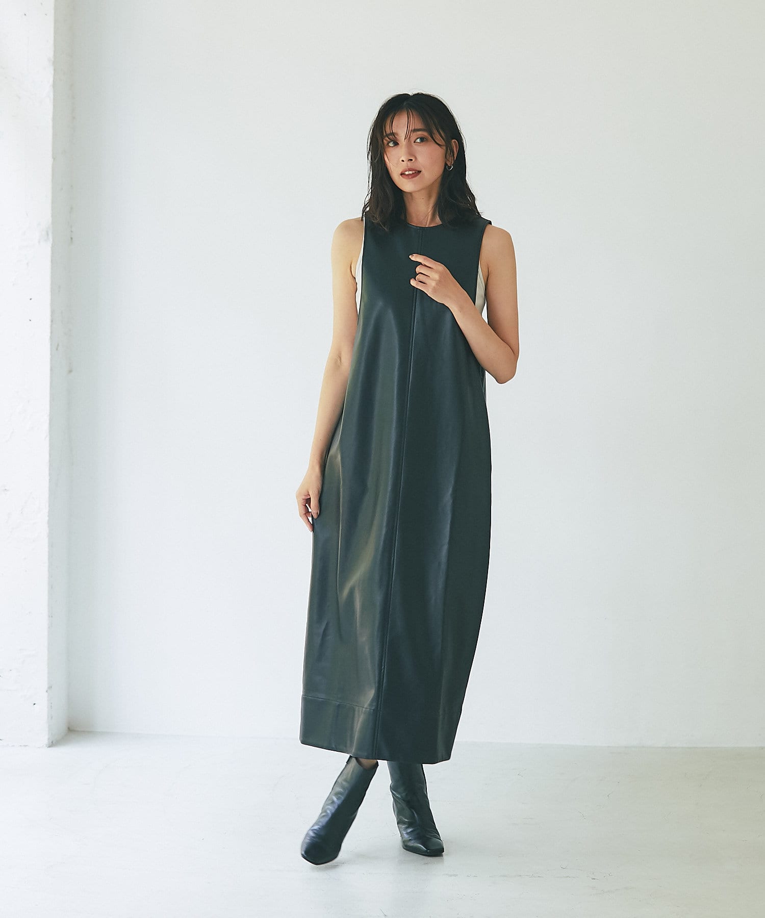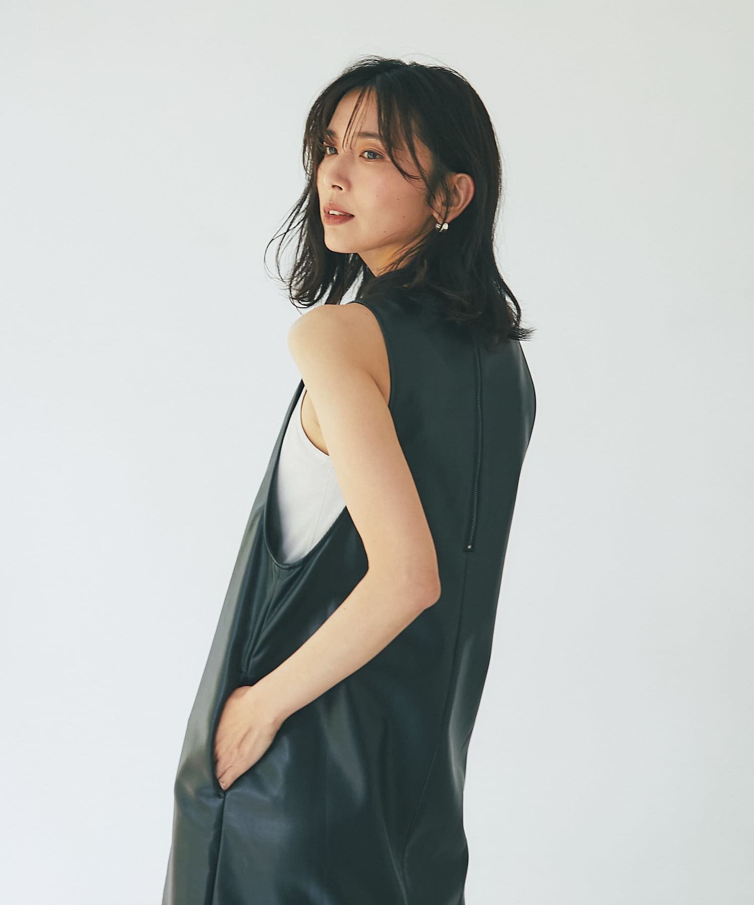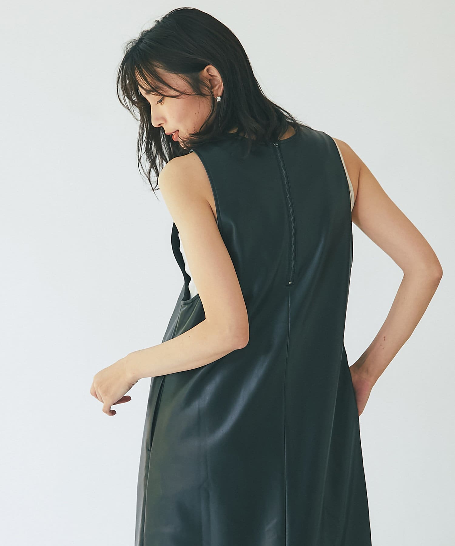 リアルレザーのような柔らかくしなやか素材で仕立てたエコレザーワンピース。