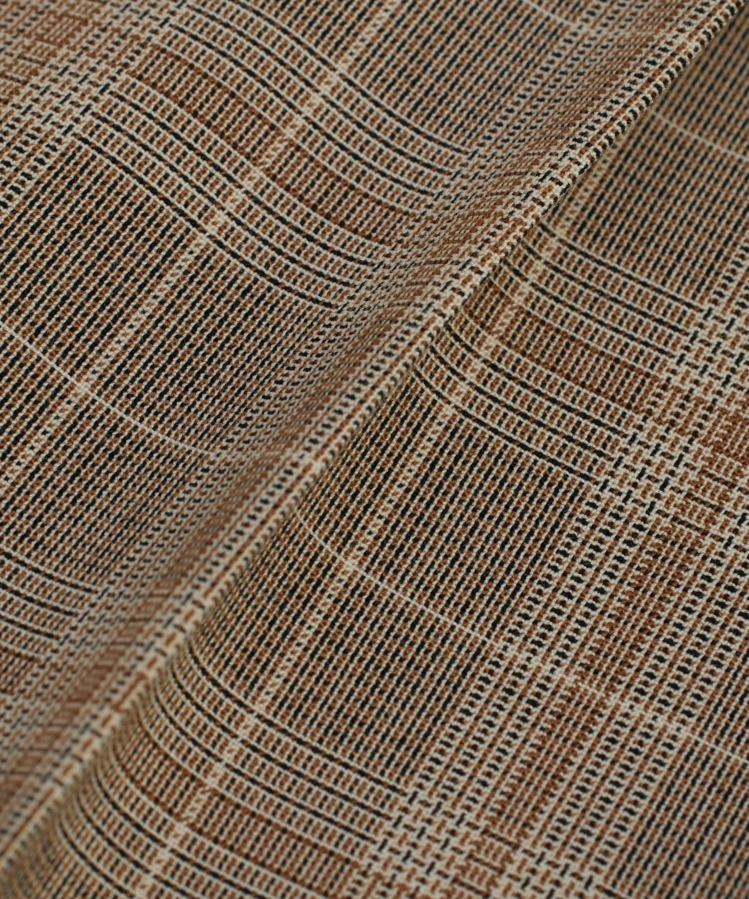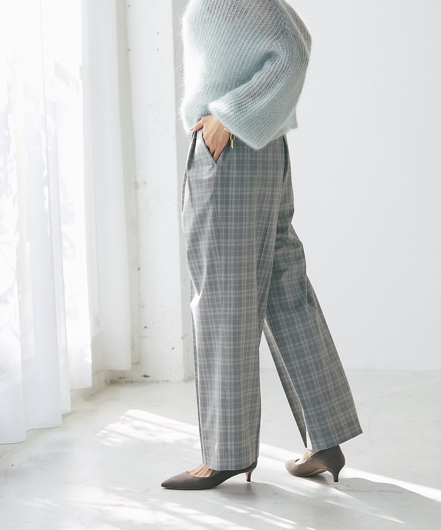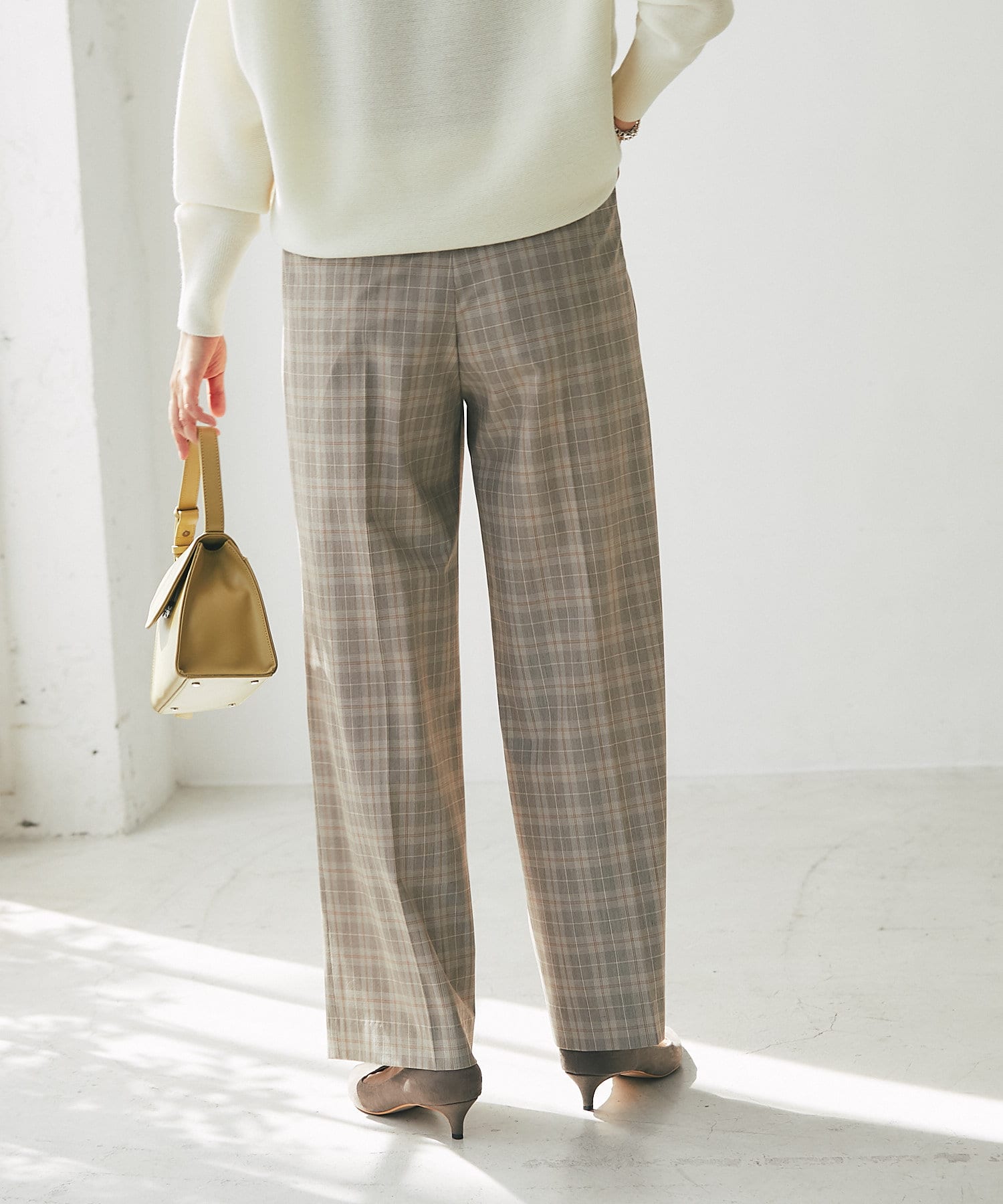 センタープレス入りのすっきりキレのあるシルエットが特徴のセミワイドパンツ。 ストレッチ素材に定評のあるトルコの紡績メーカー「キバンジ」の生地を使用し、柔らかな色合いのグレンチェックが秋らしさを演出する一枚です。