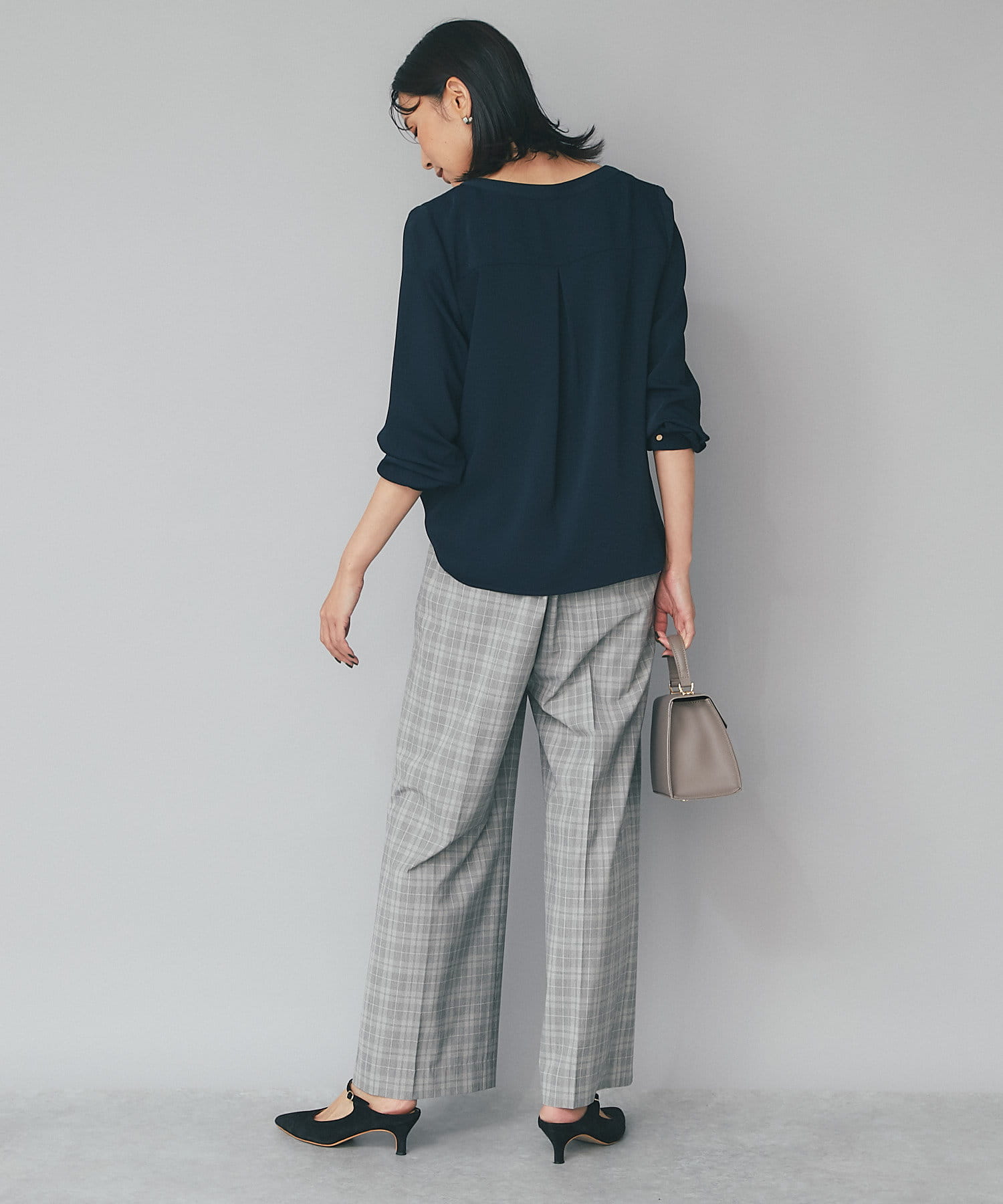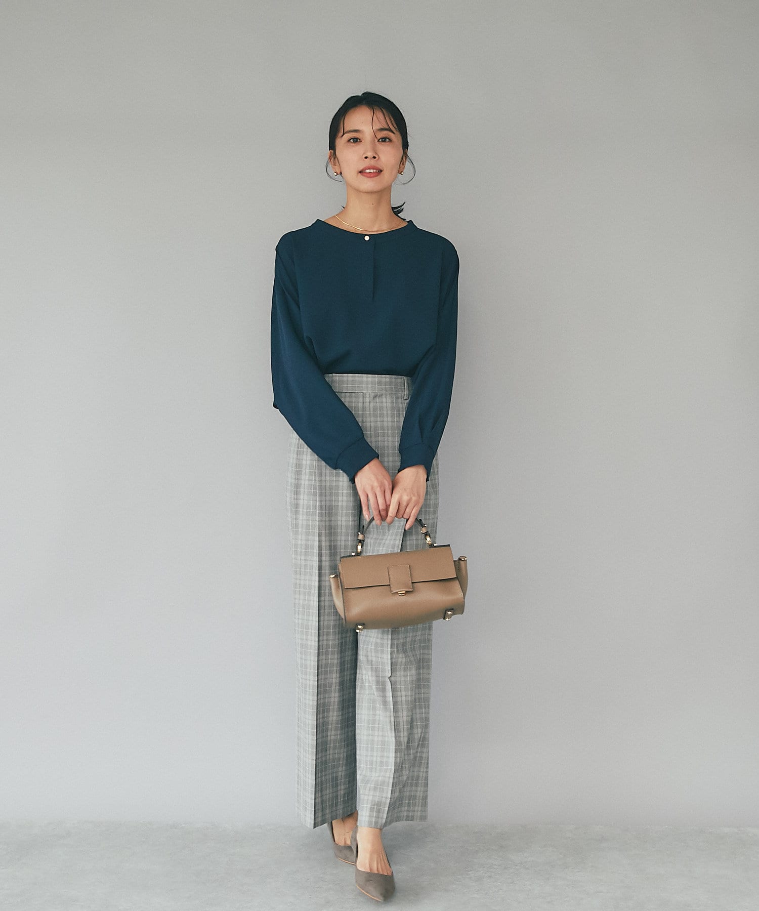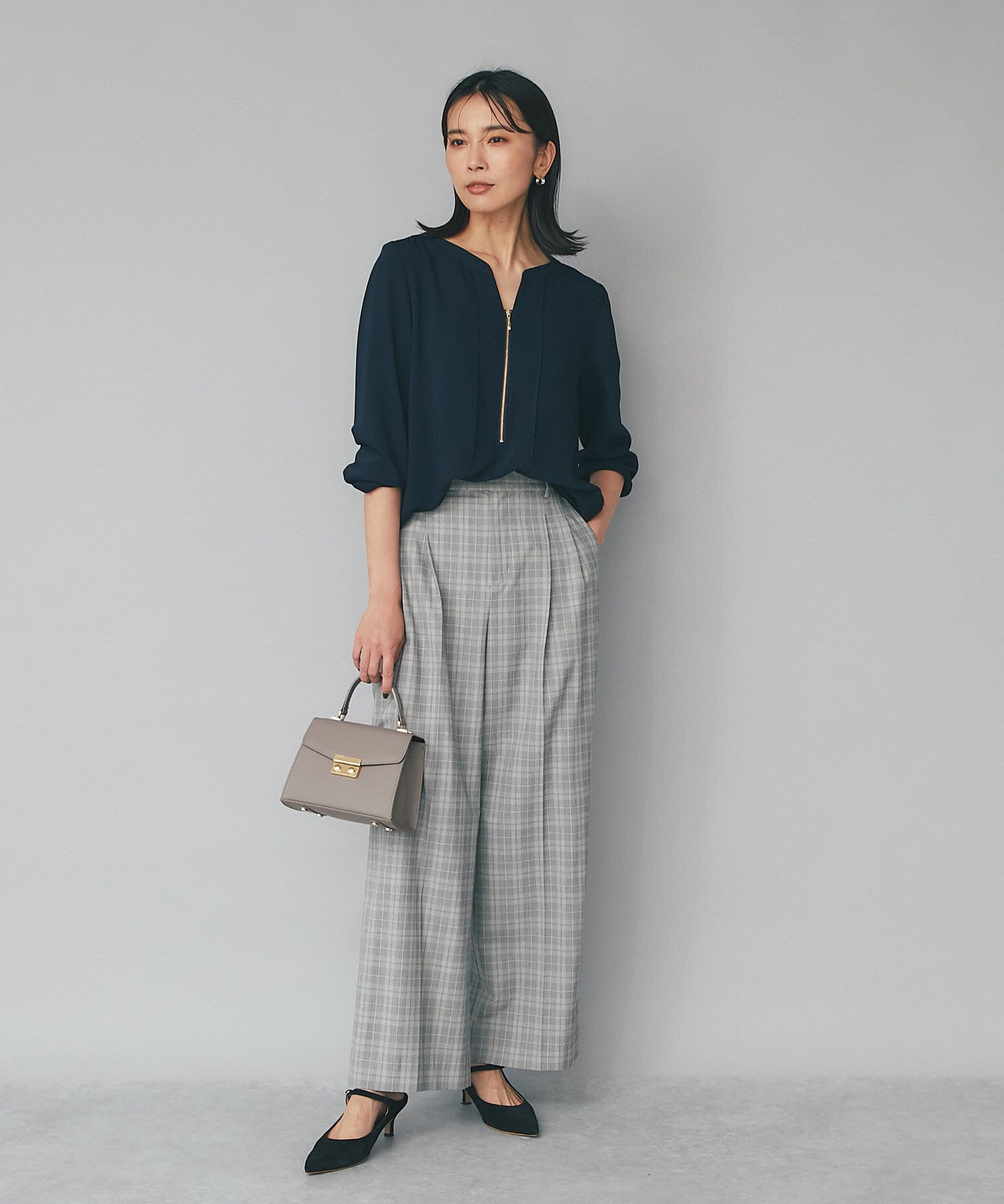 オンオフ兼用も可能なので、とろみのあるブラウスで上品なオフィスカジュアルスタイルも◎