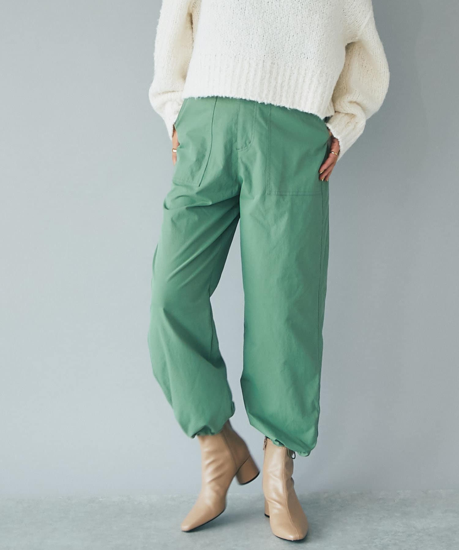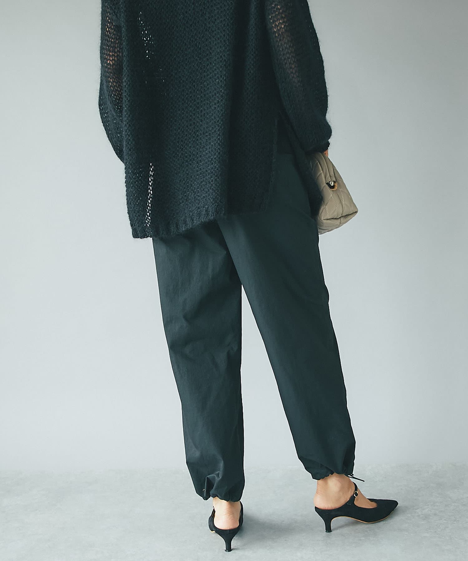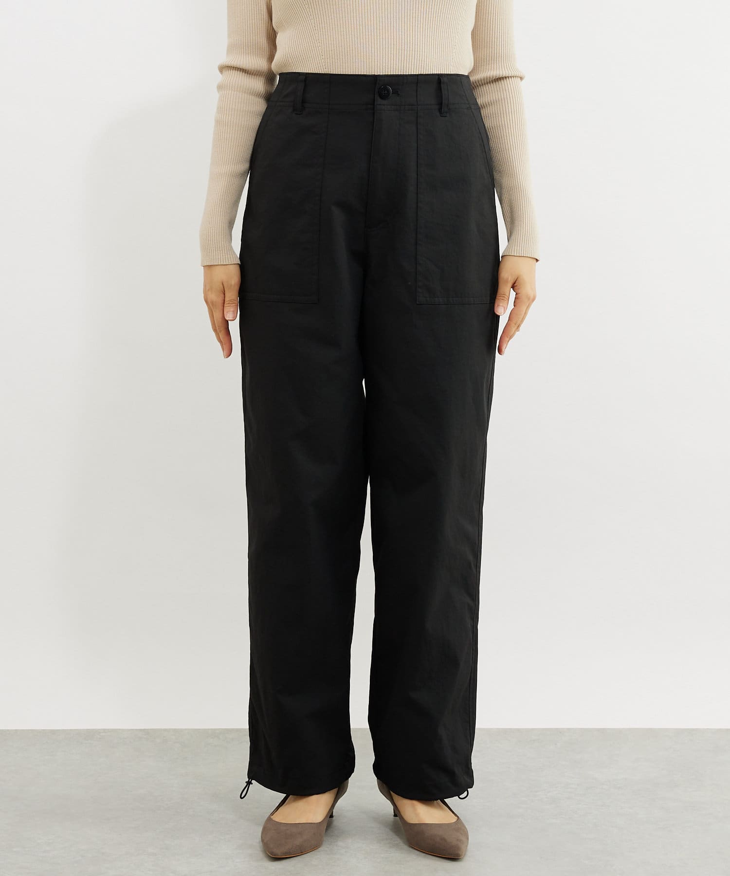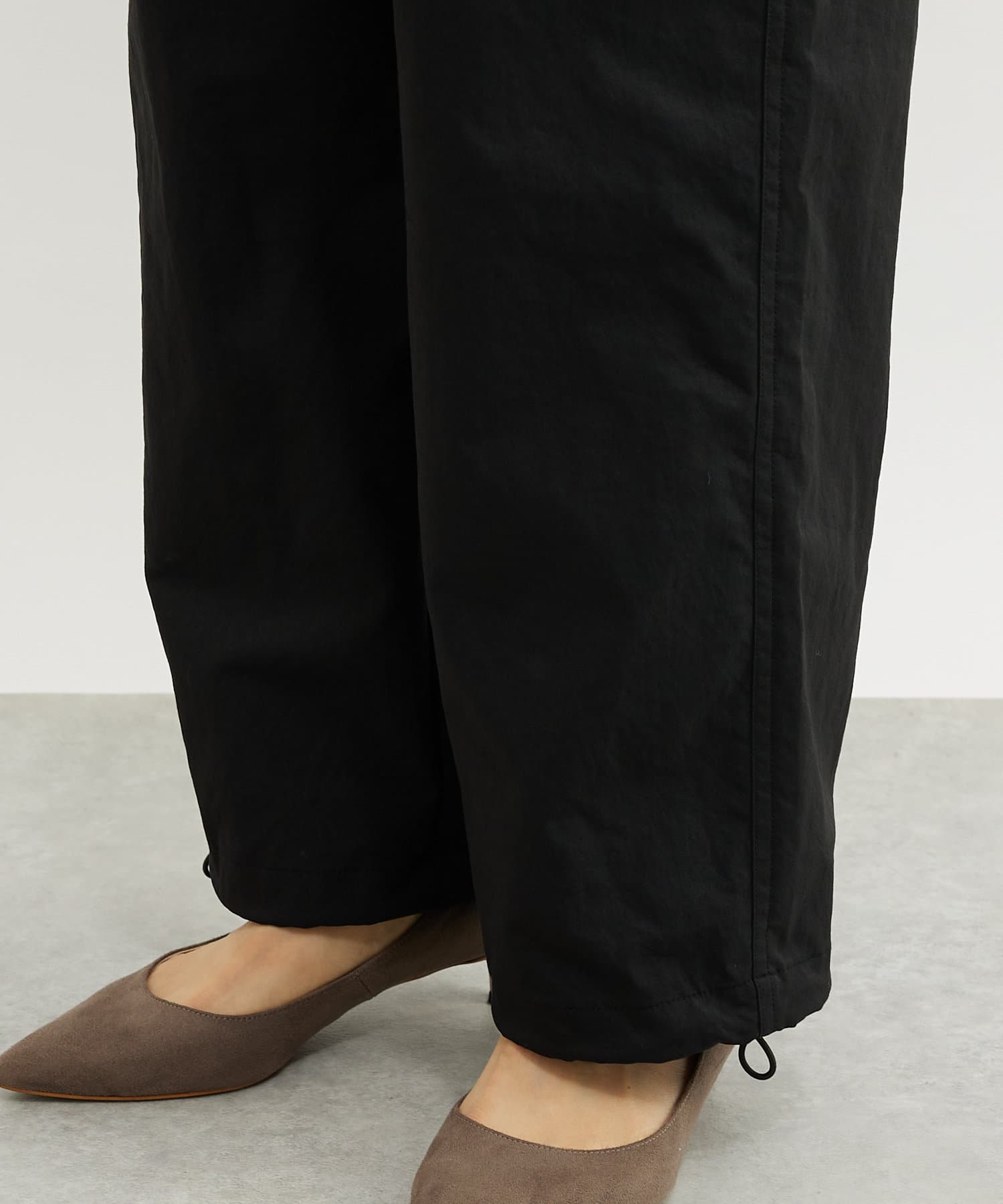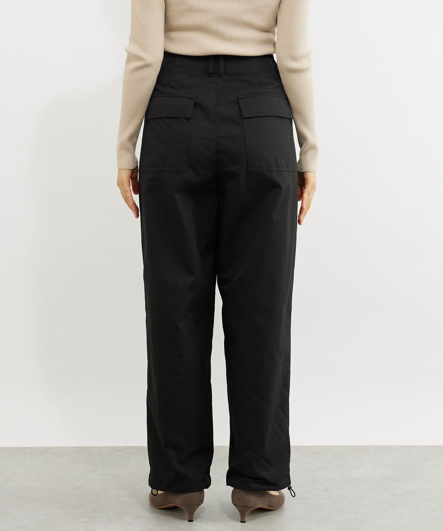 立体感のあるストレートパンツ型でドロストコードで裾のシルエットを変えられる2way仕様。ウエストゴム仕様でリラックスして履けるデザインです。