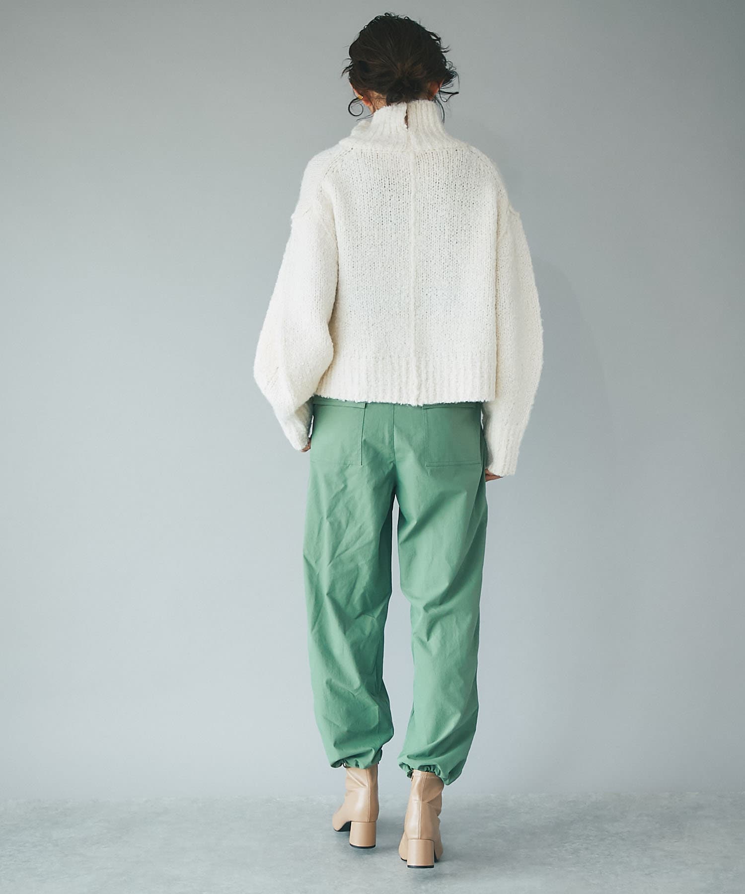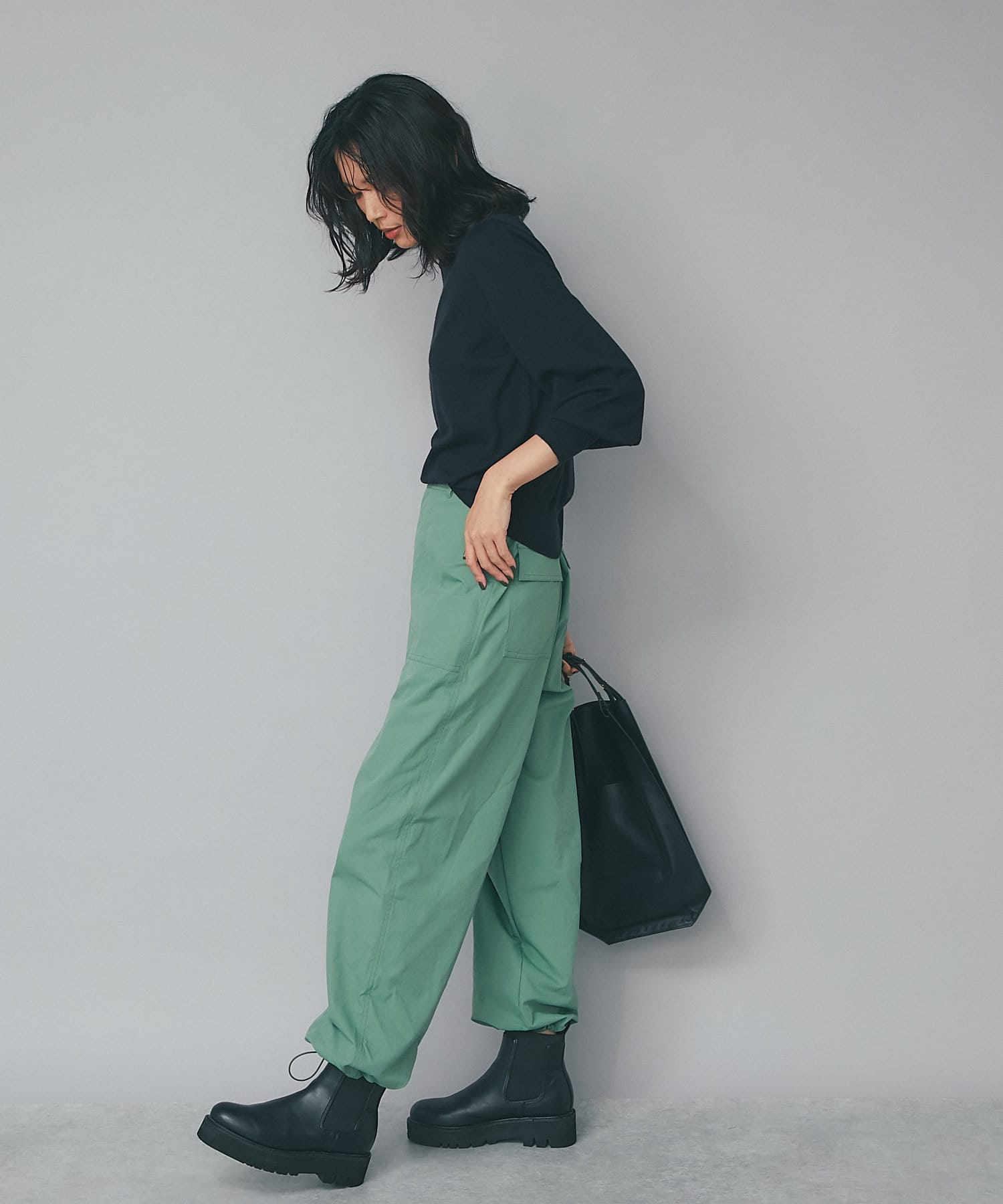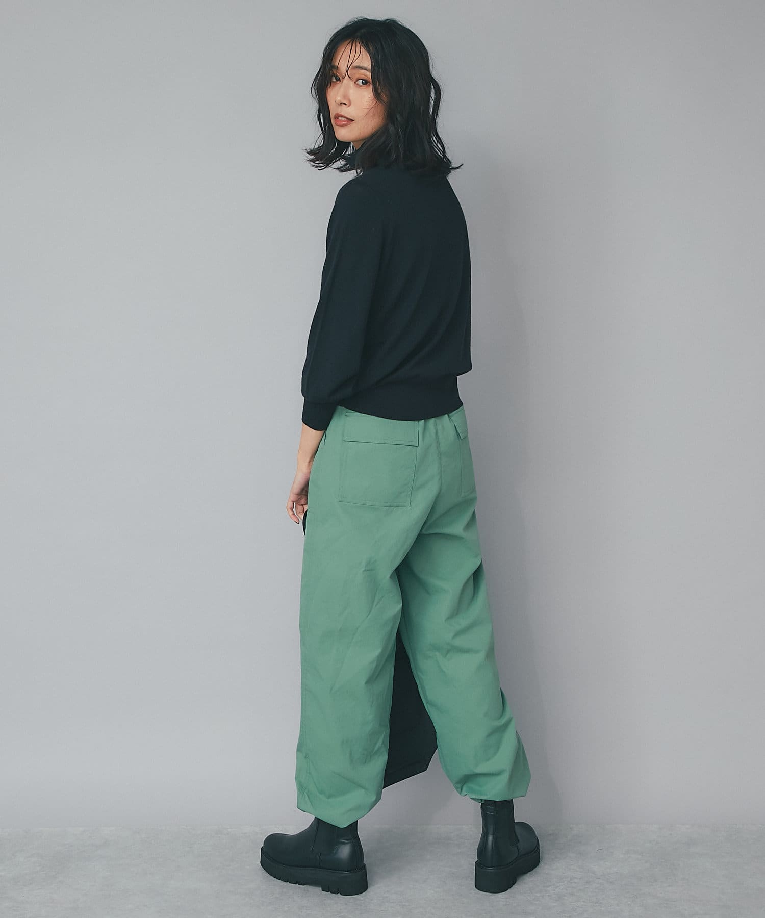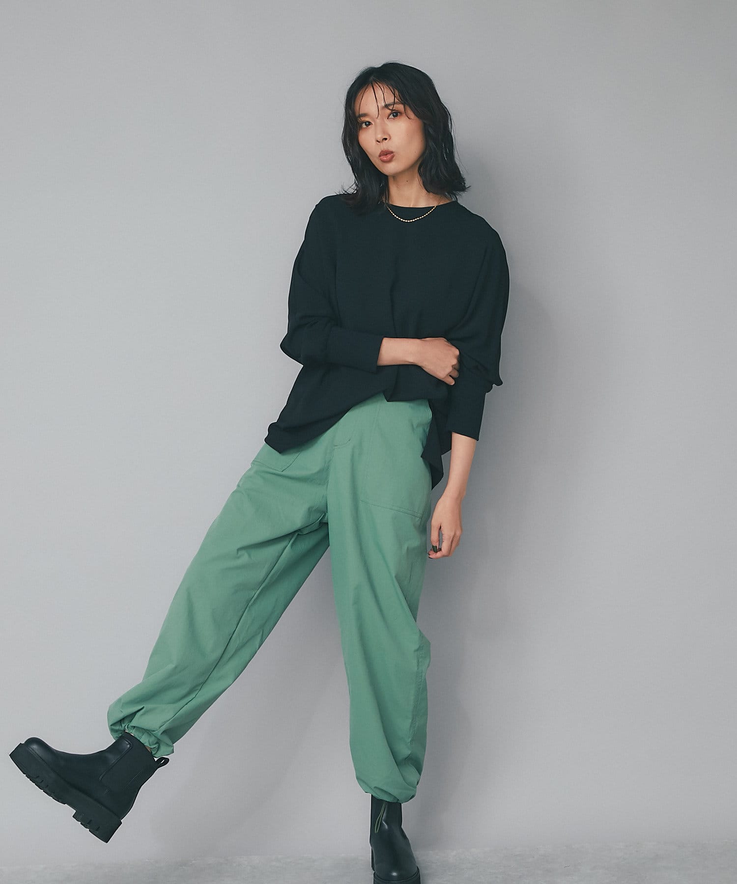 立体感のあるストレートパンツ型でドロストコードで裾のシルエットを変えられる2way仕様。ウエストゴム仕様でリラックスして履けるデザインです。