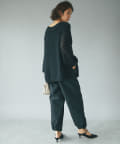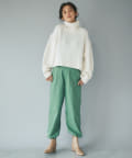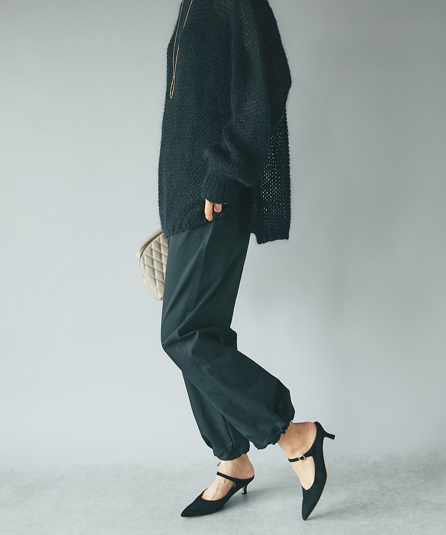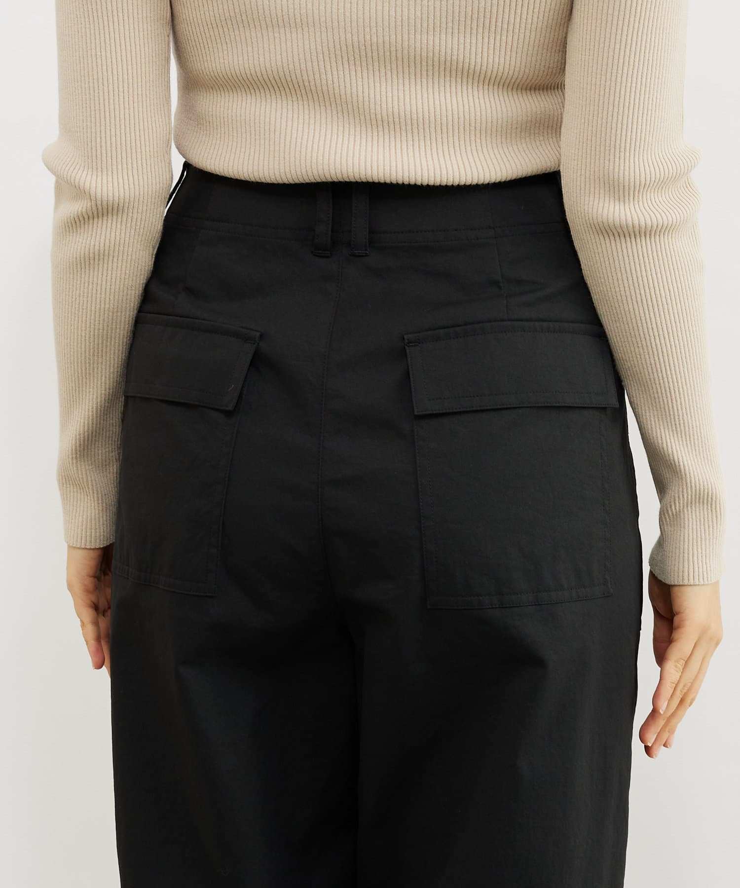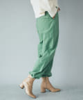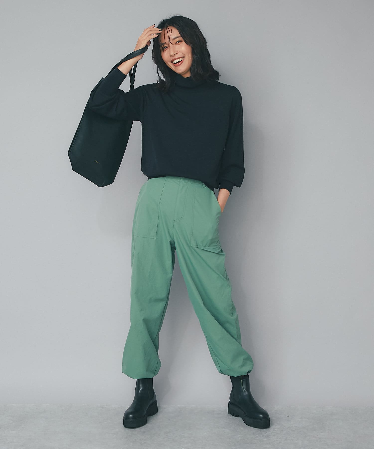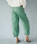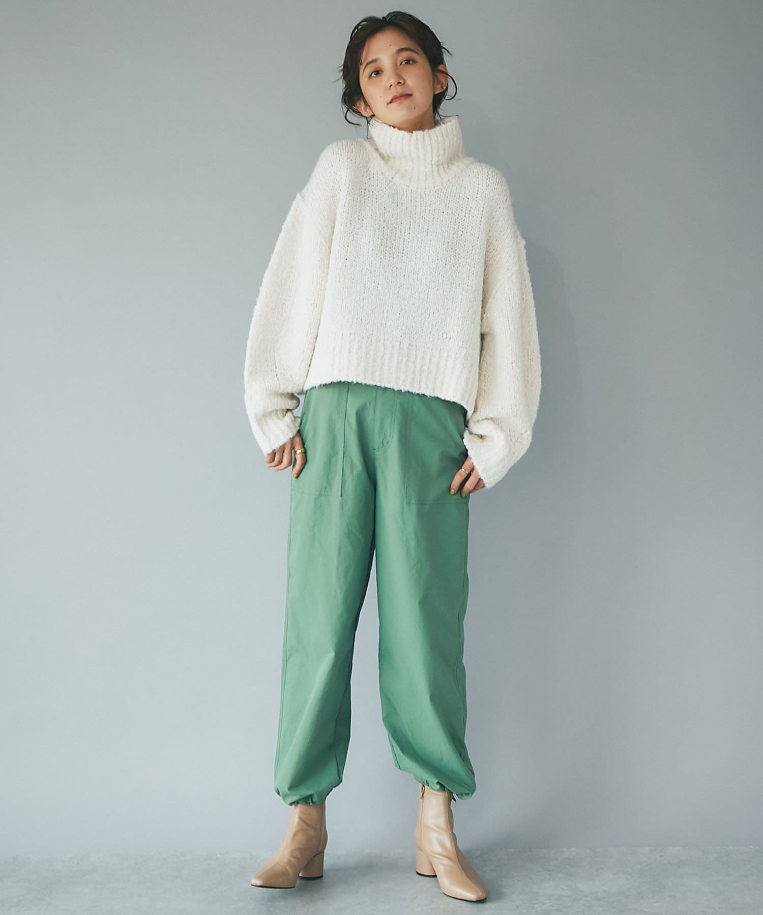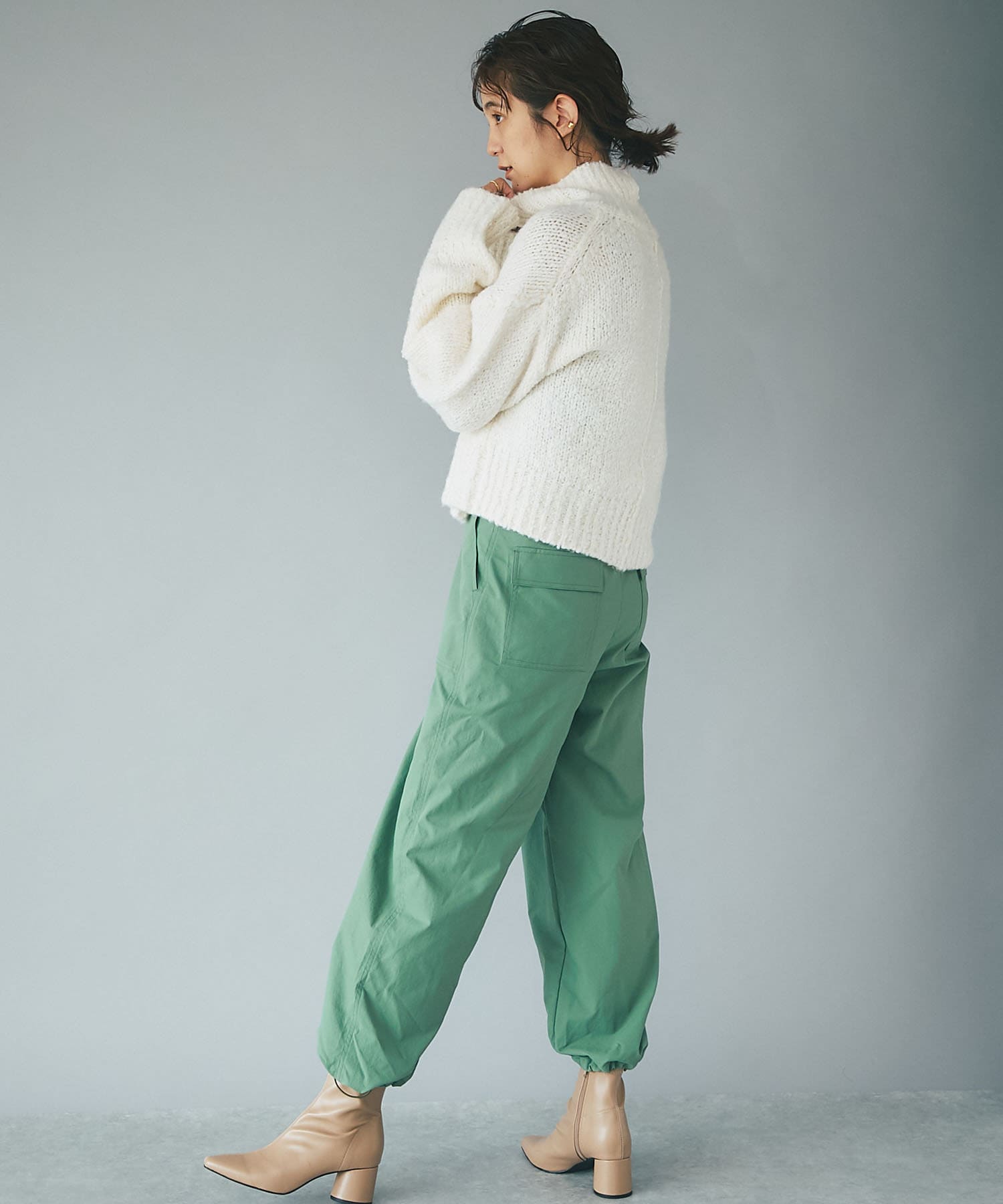 立体感のあるストレートパンツ型でドロストコードで裾のシルエットを変えられる2way仕様。ウエストゴム仕様でリラックスして履けるデザインです。