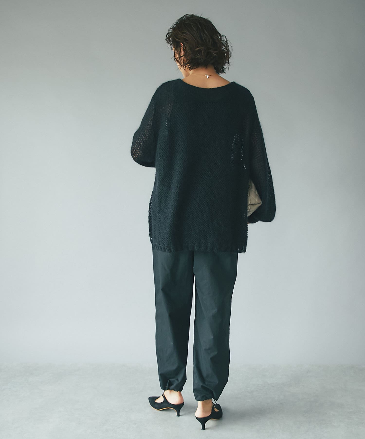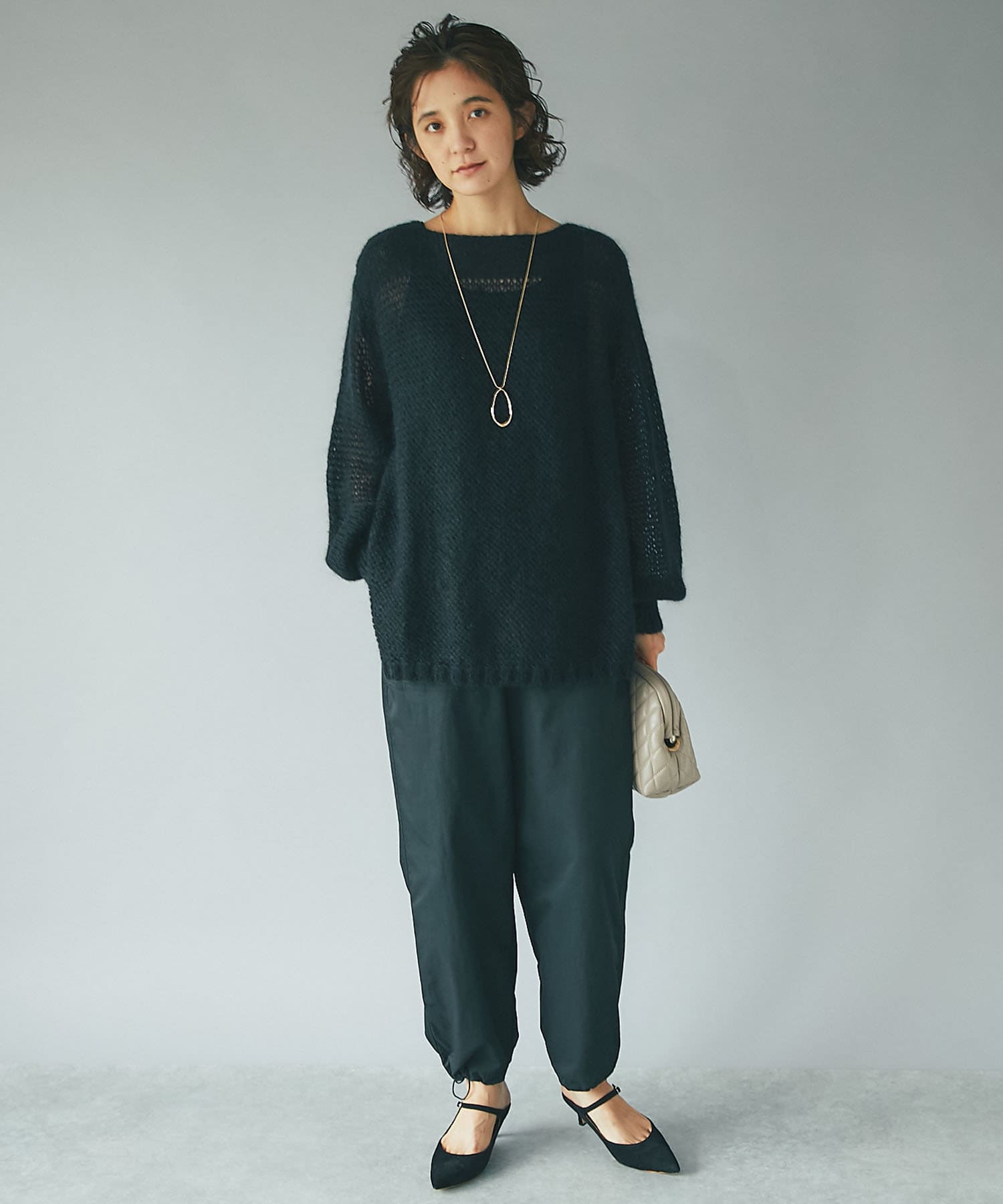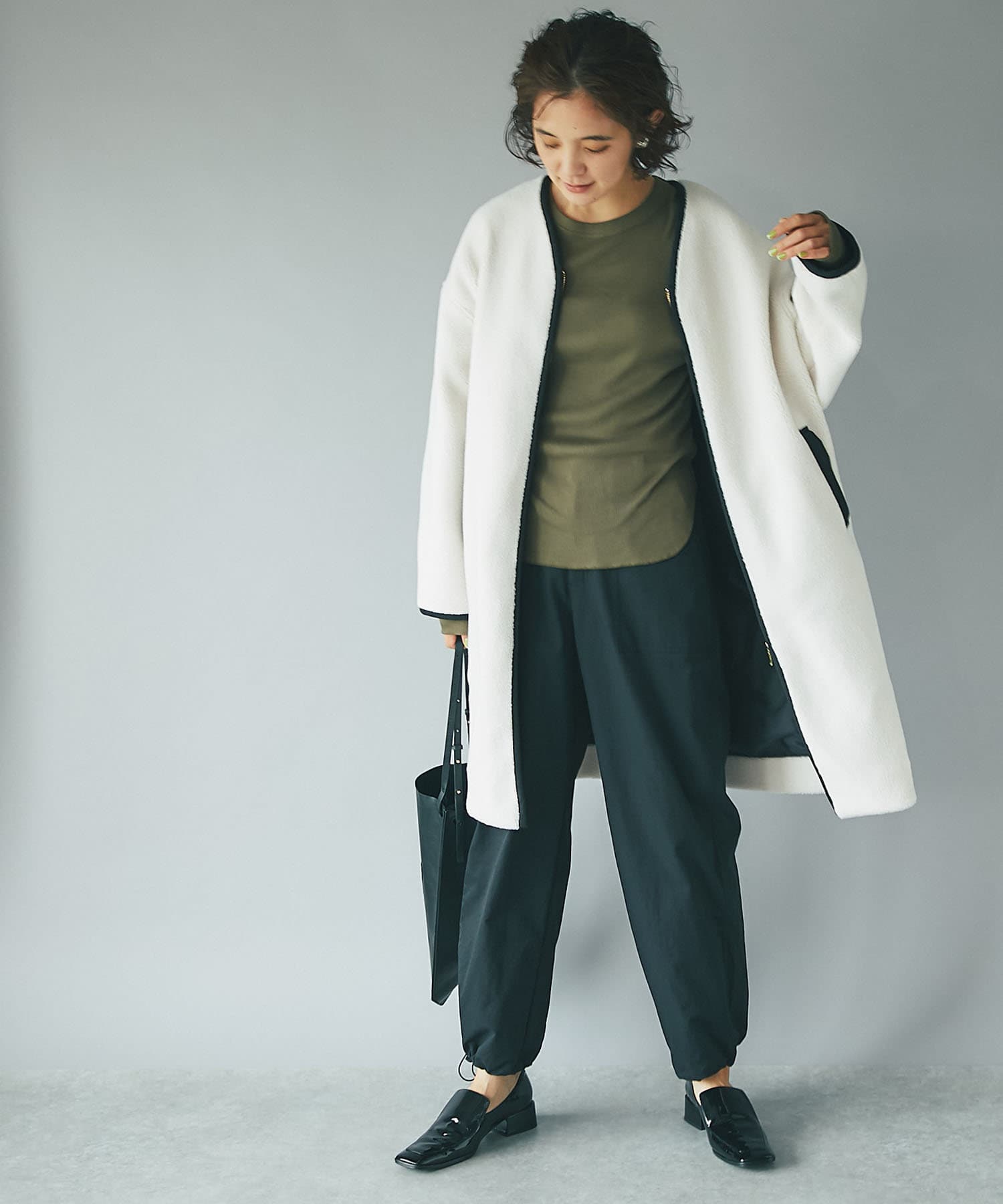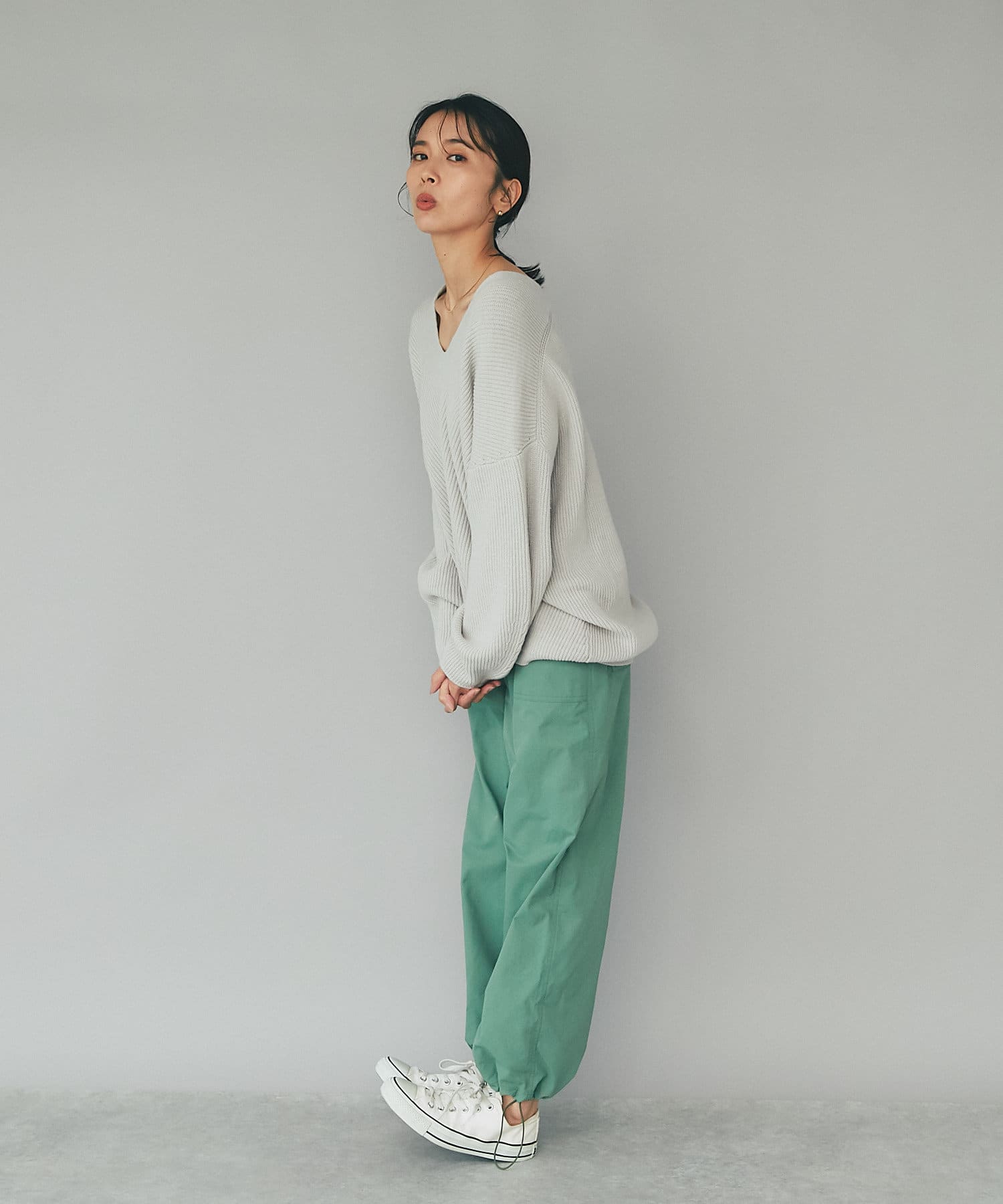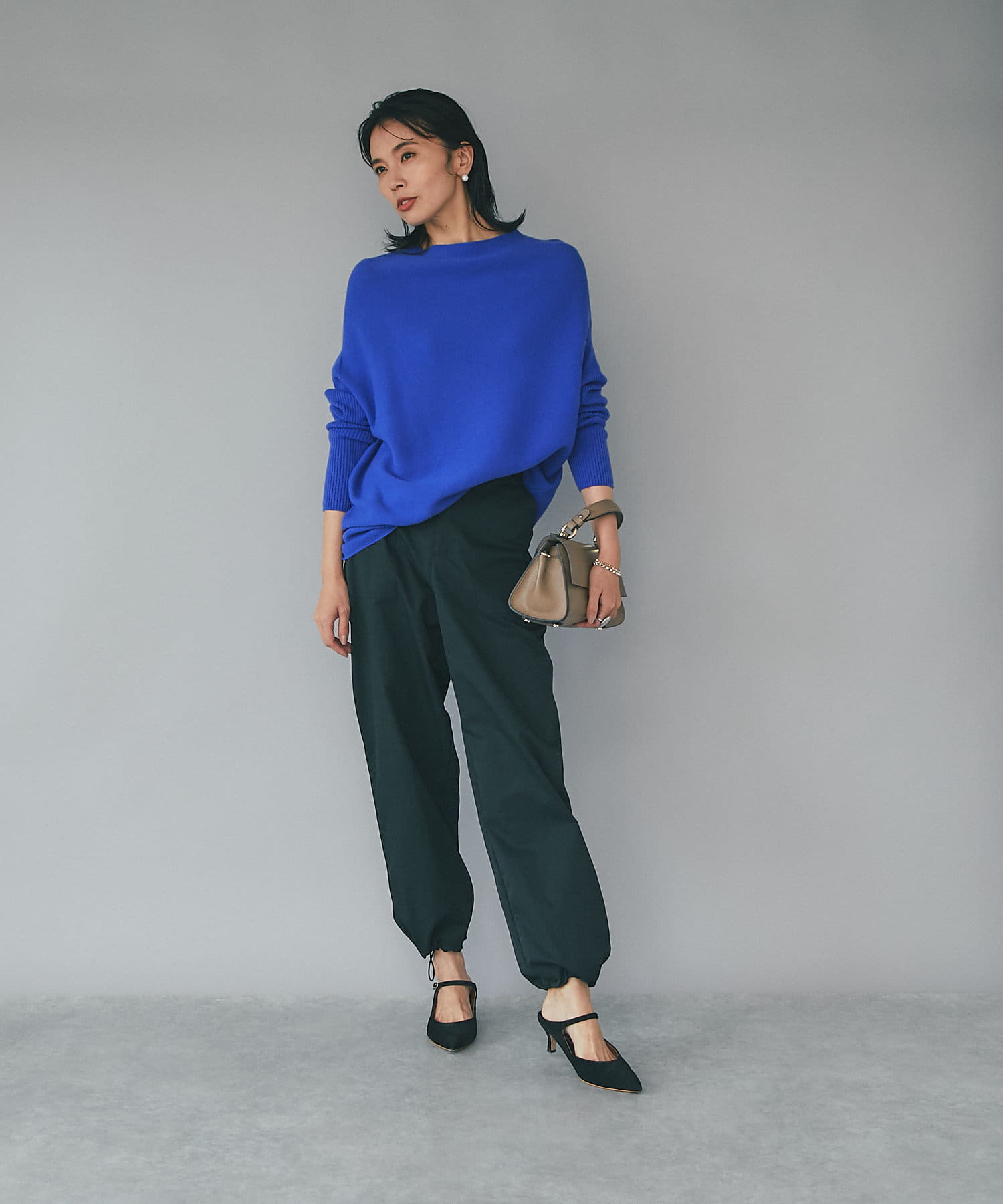 秋冬らしいオーバーサイズのニットを合わせた鮮度のある着こなしがオススメ。足元をブーツに変えることで、よりシーズンムードのあるコーディネートをお楽しみ頂けます。