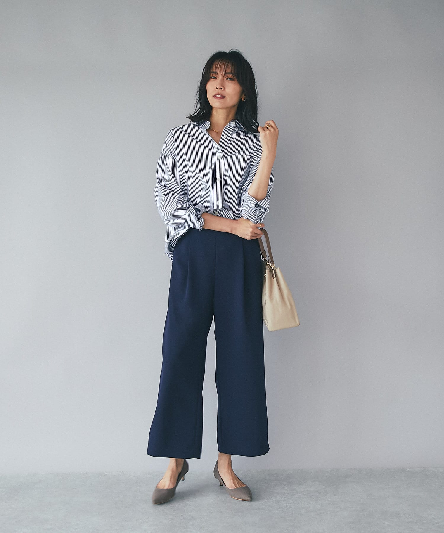 デイリー使いには、こなれ感を演出するストライプシャツなどの程よくカジュアルなアイテムを合わせたコーディネートがオススメ。