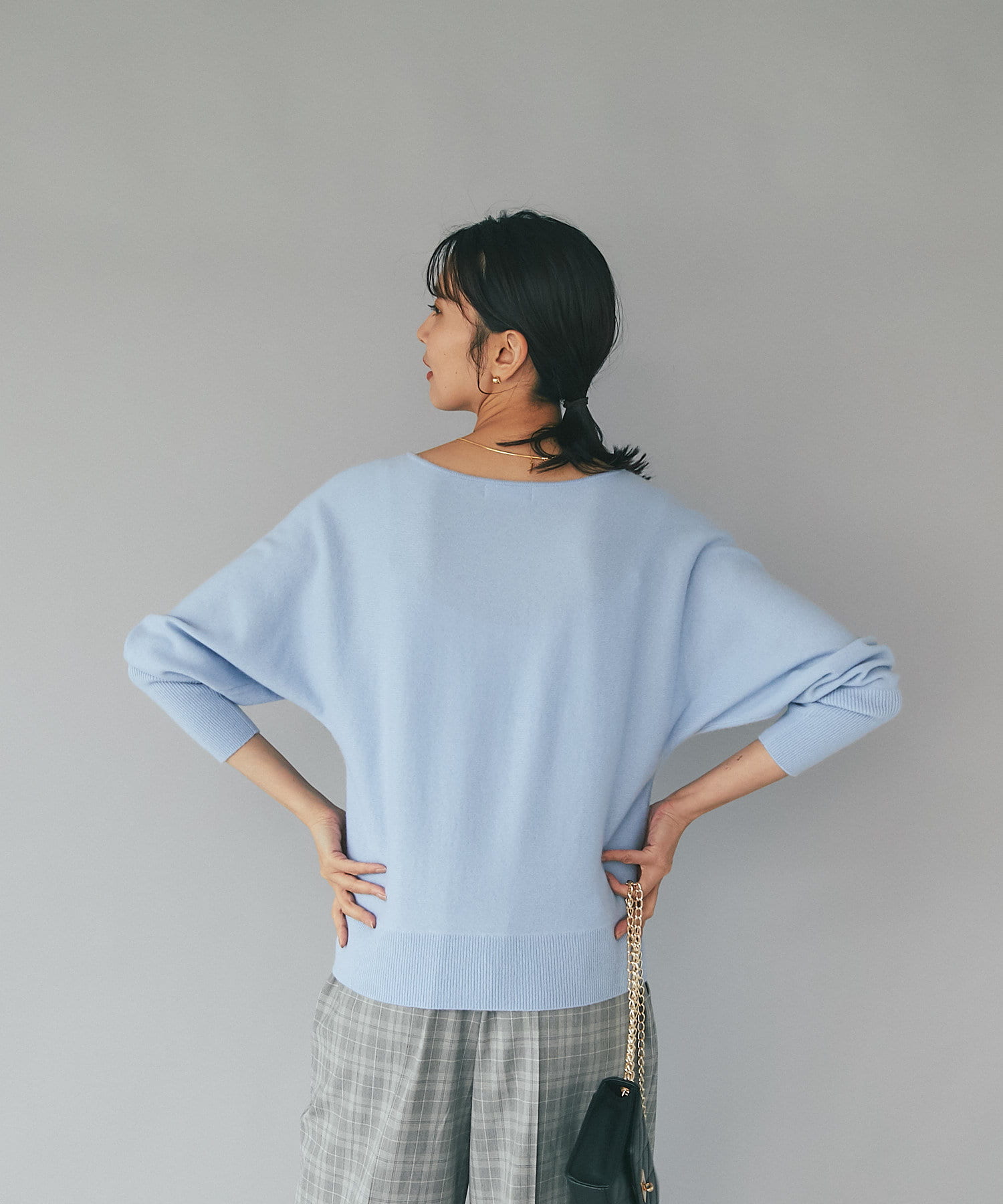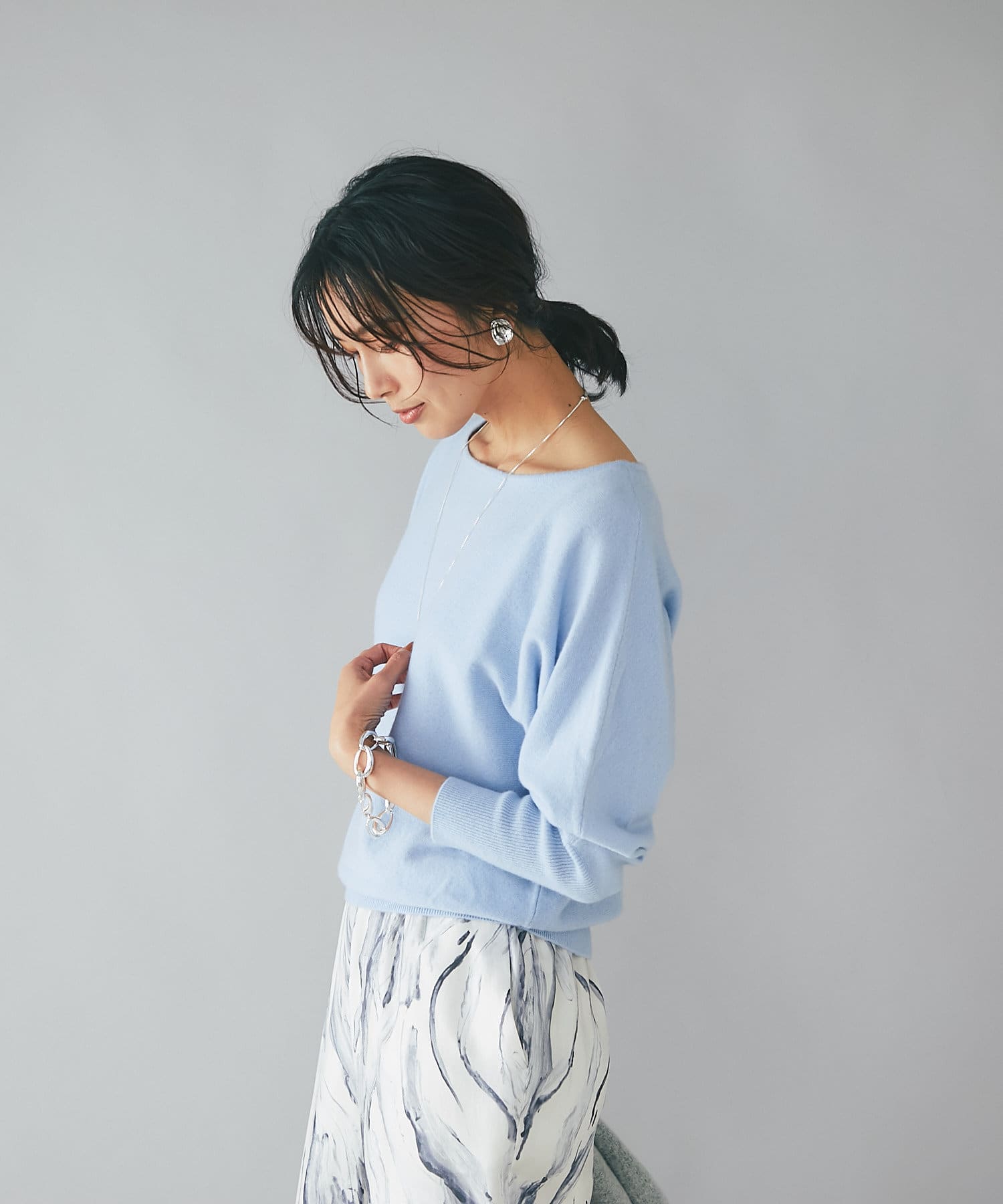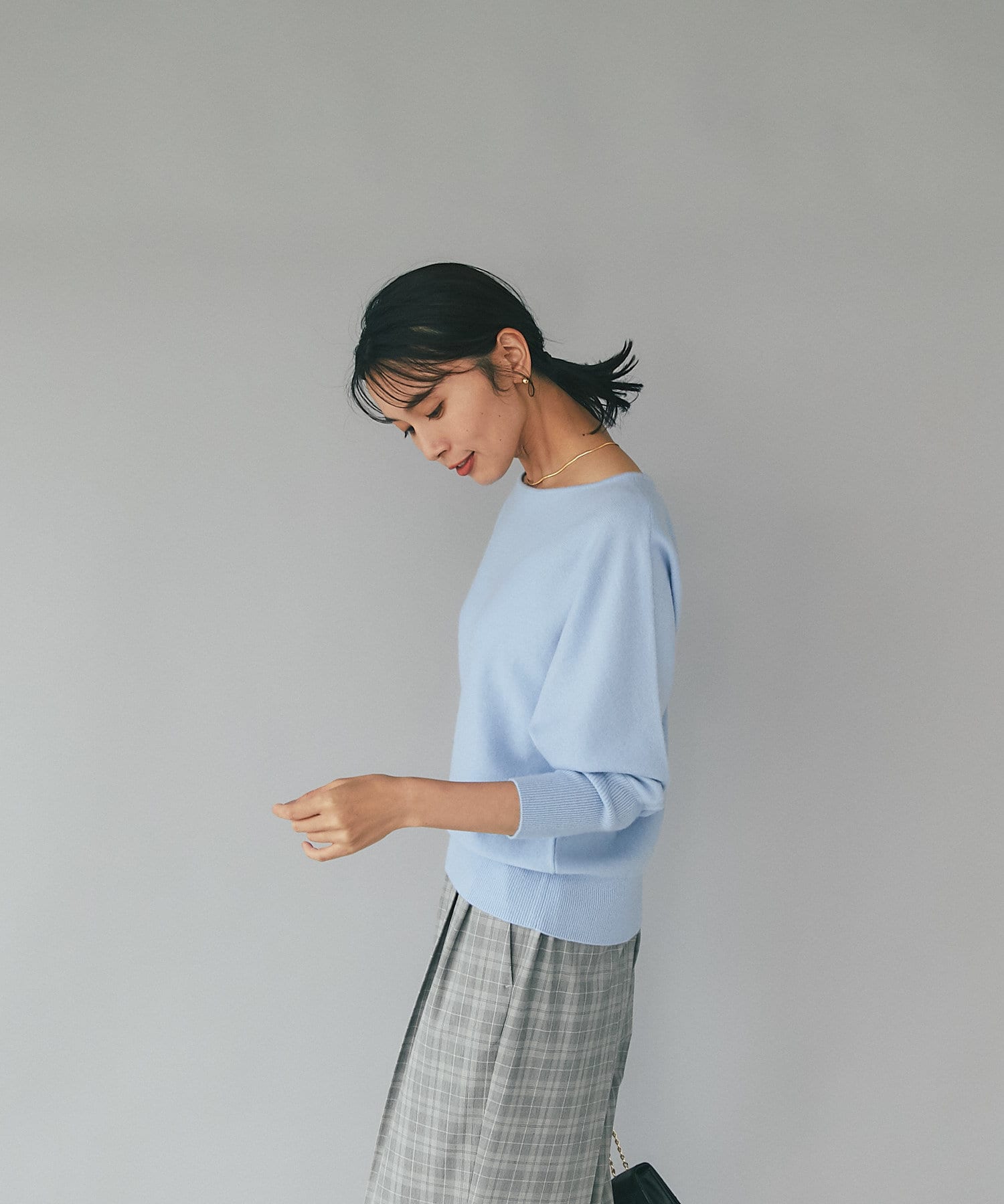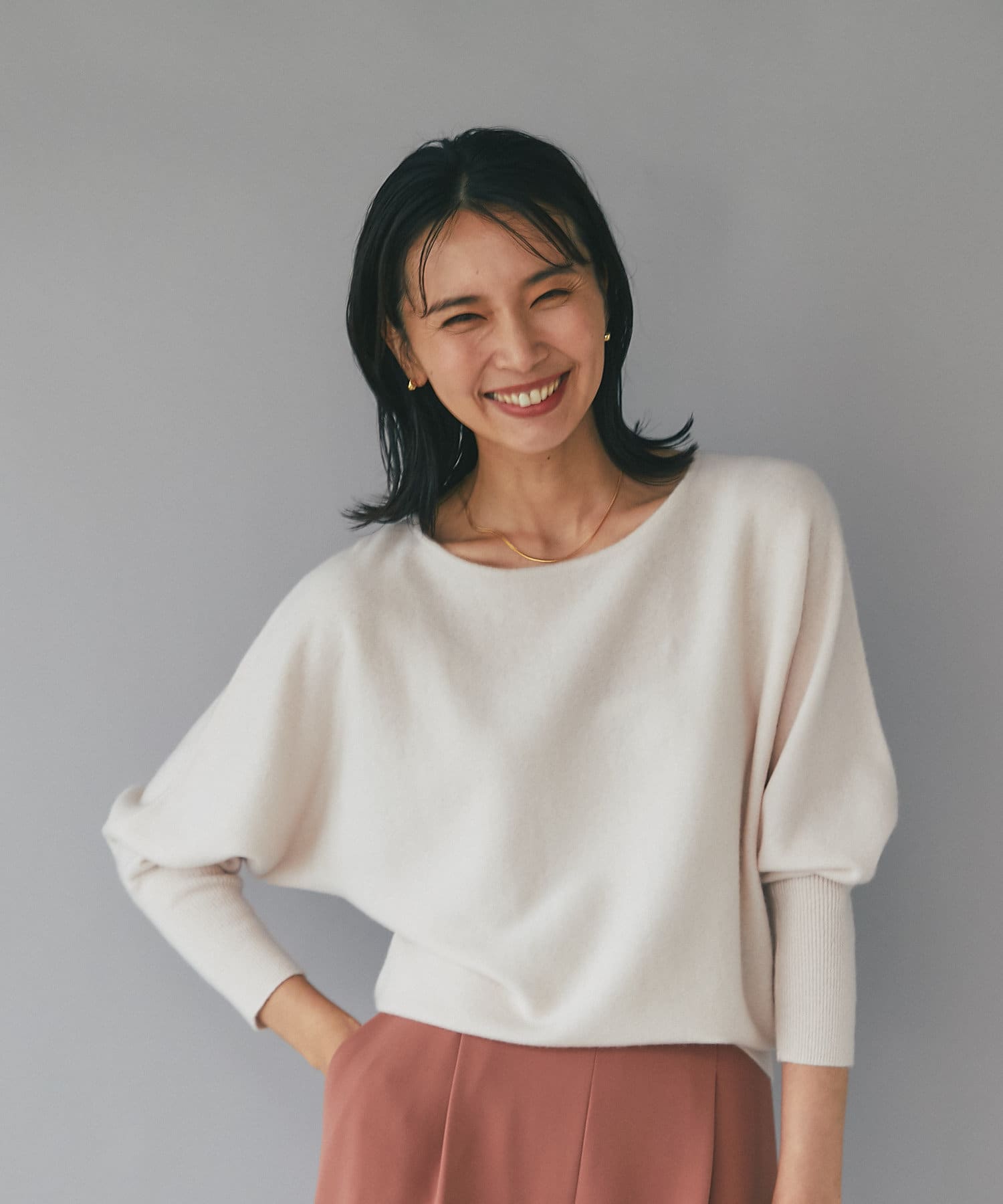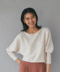 身体のラインを拾いづらいドルマンシルエット。首元は緩やかなラウンドネックで、上品さと女性らしさがある一枚。