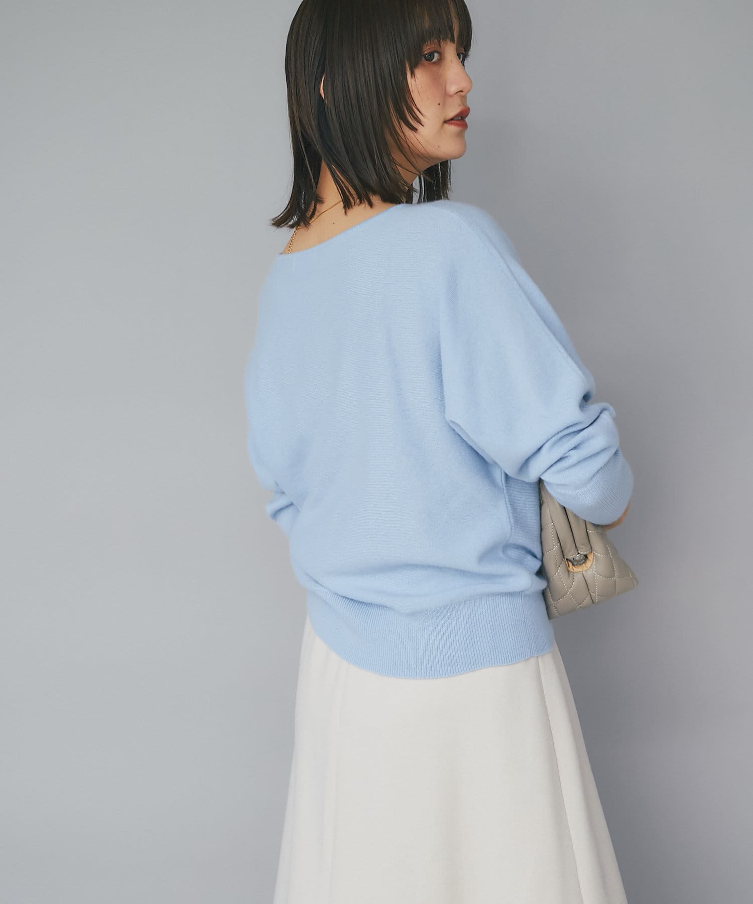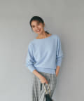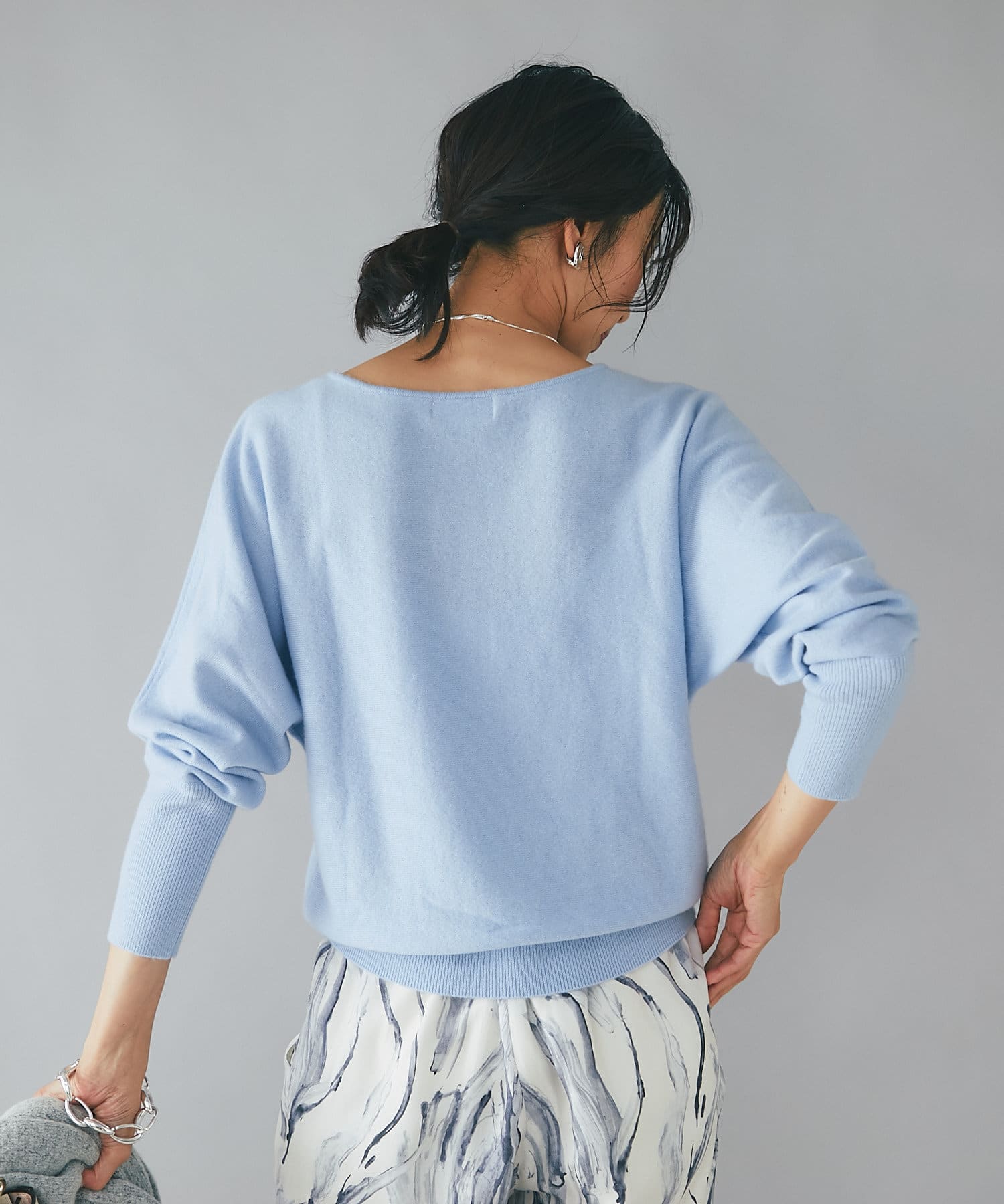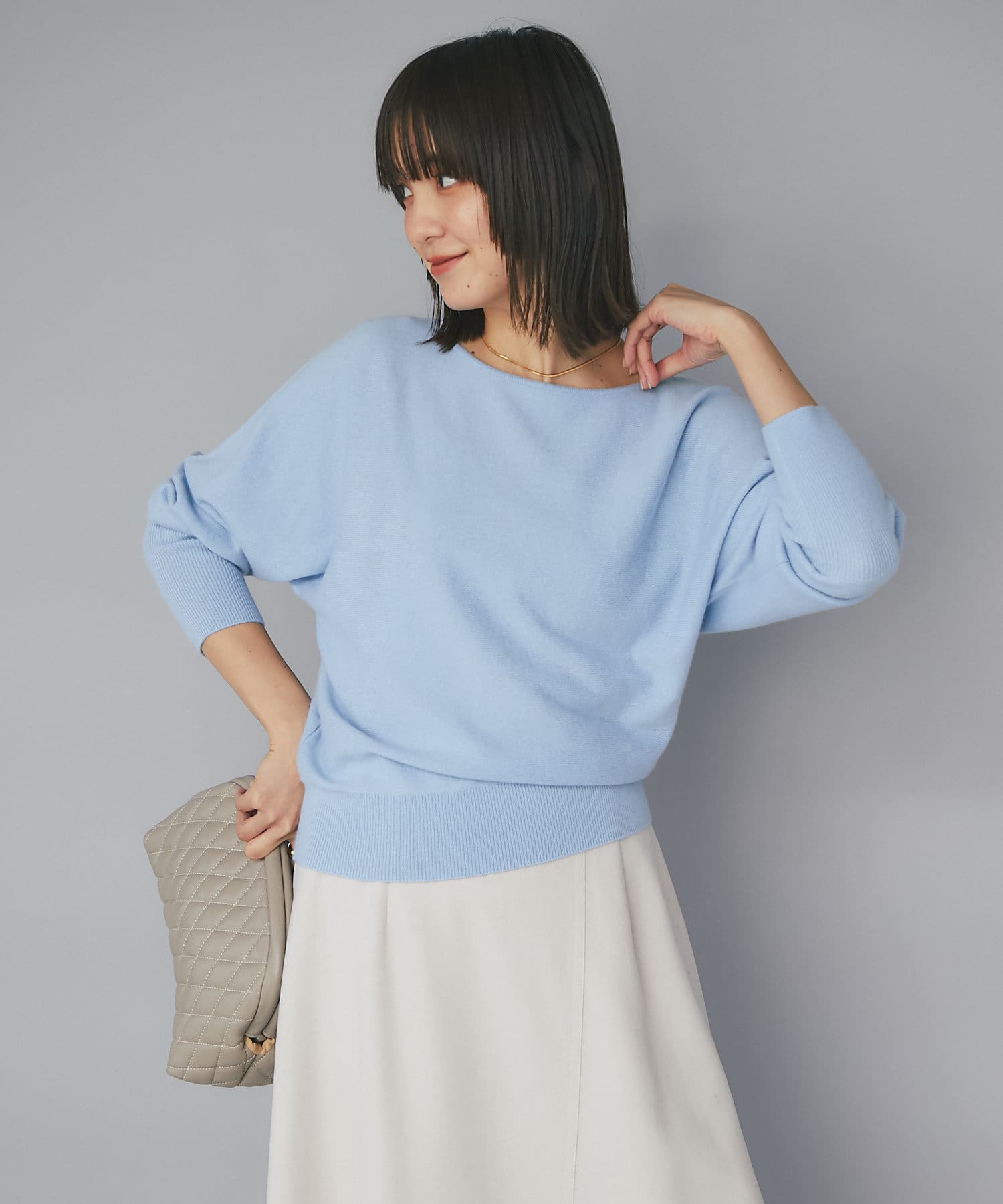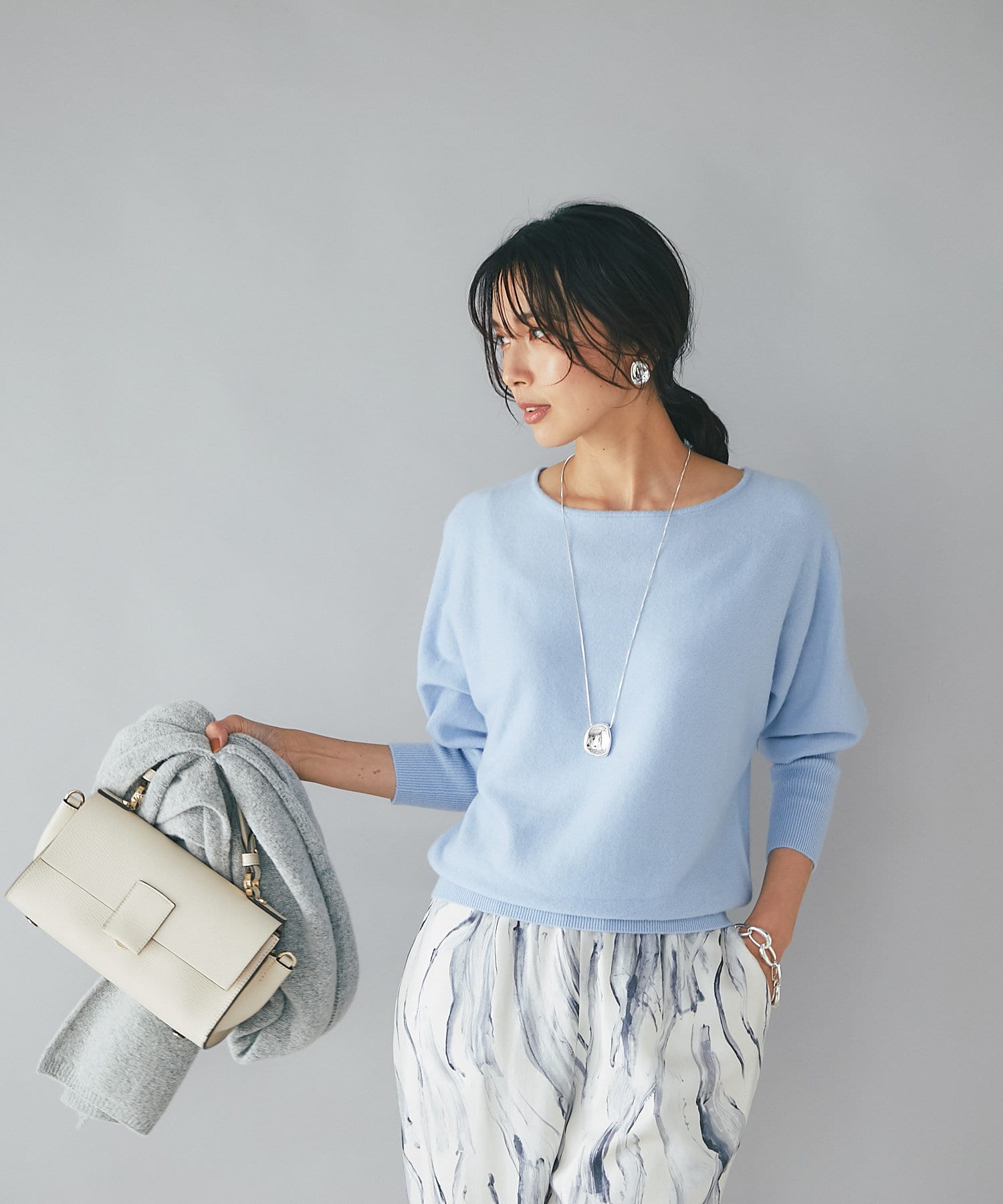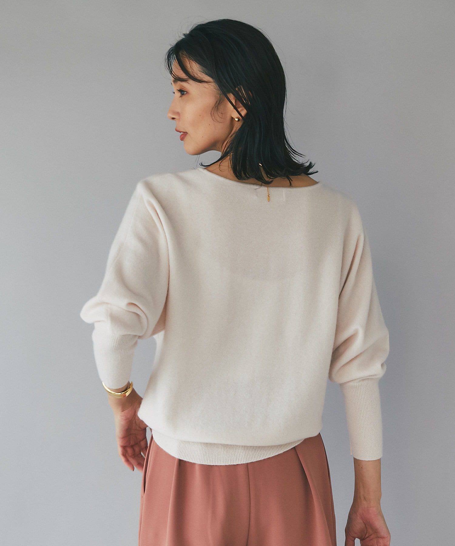 身体のラインを拾いづらいドルマンシルエット。首元は緩やかなラウンドネックで、上品さと女性らしさがある一枚。