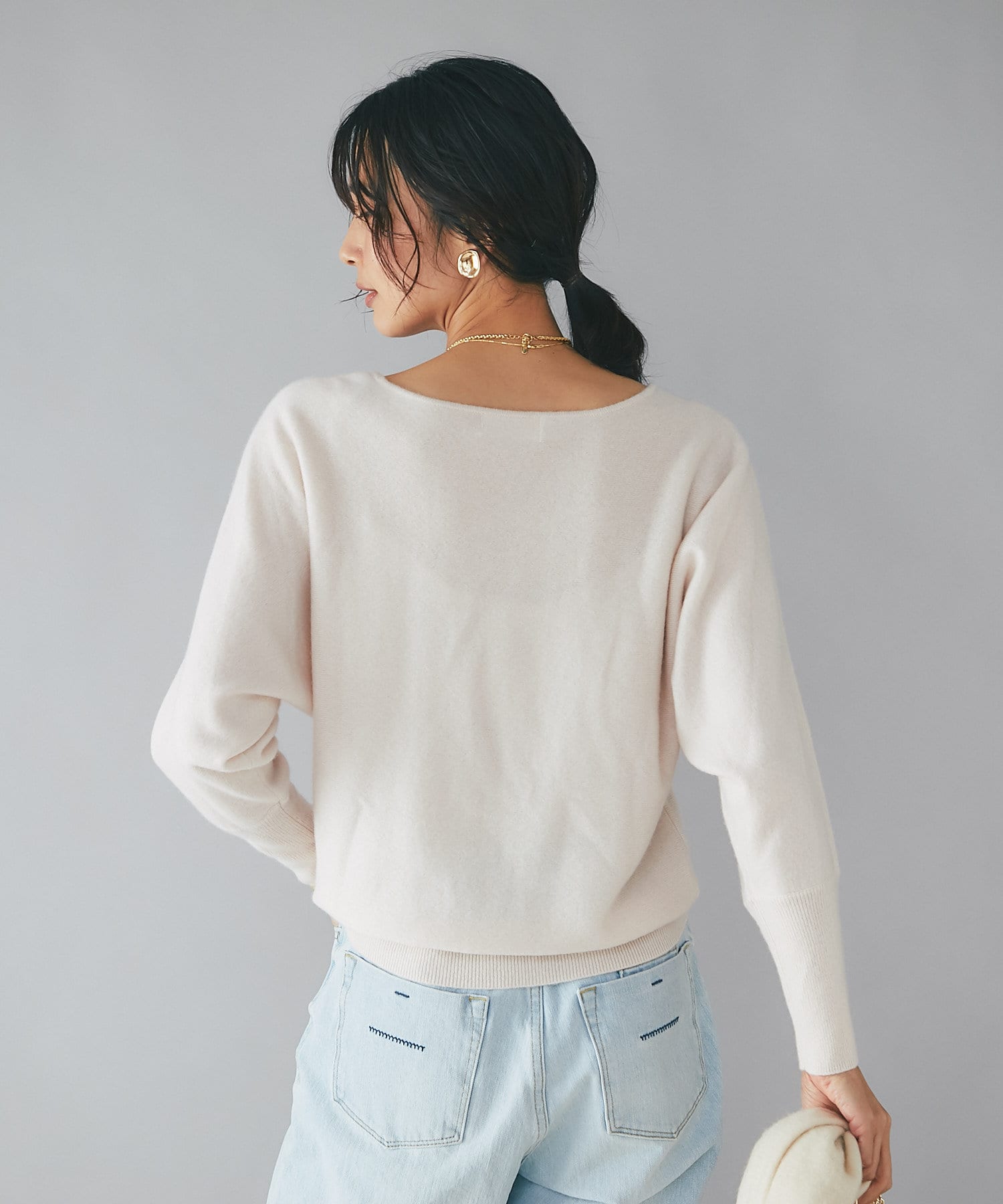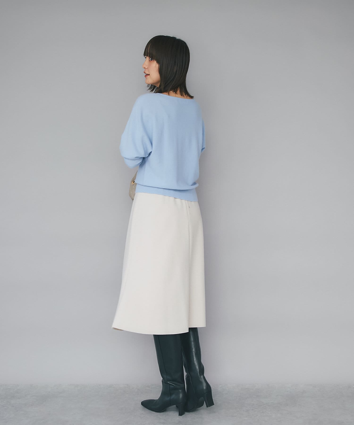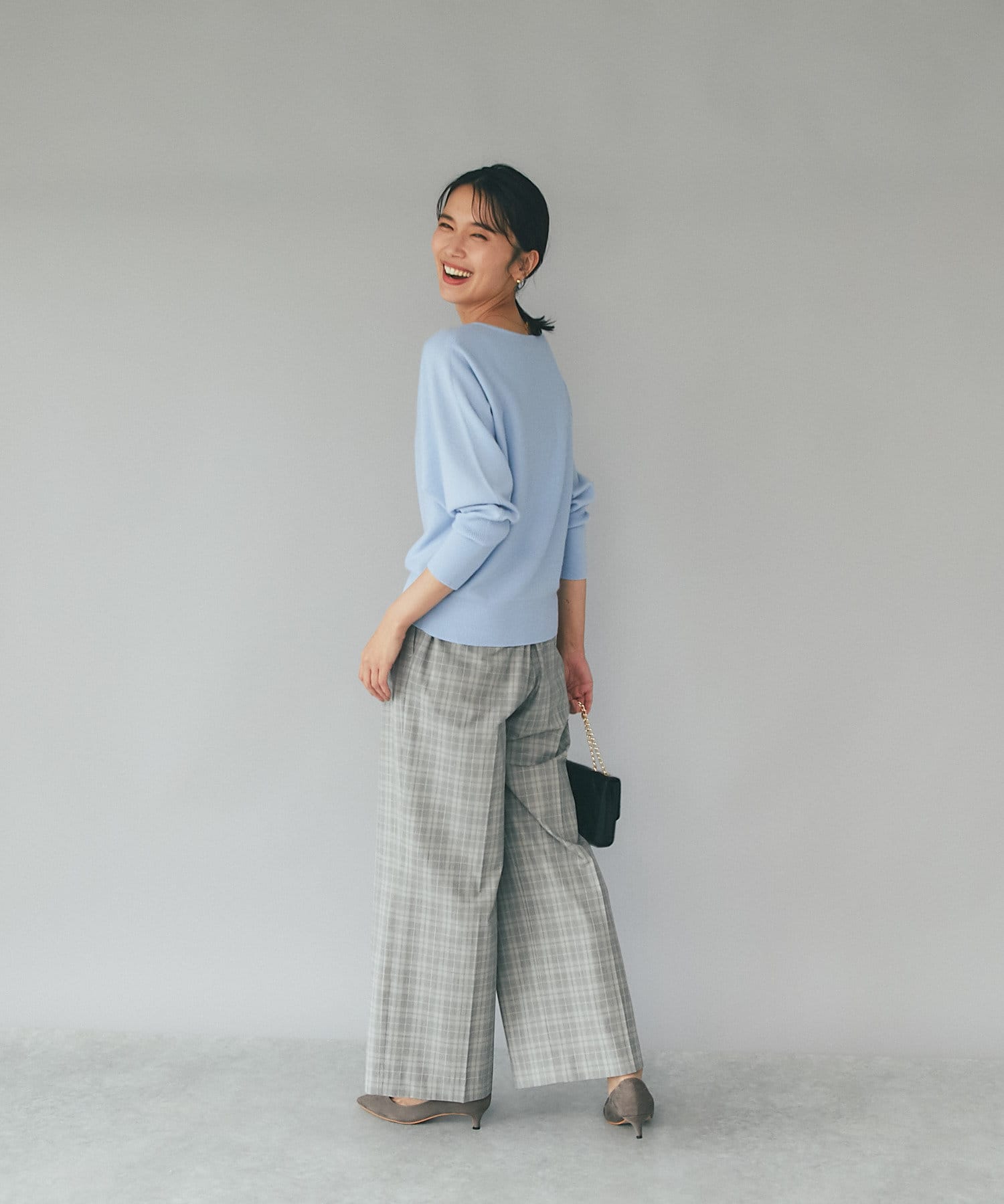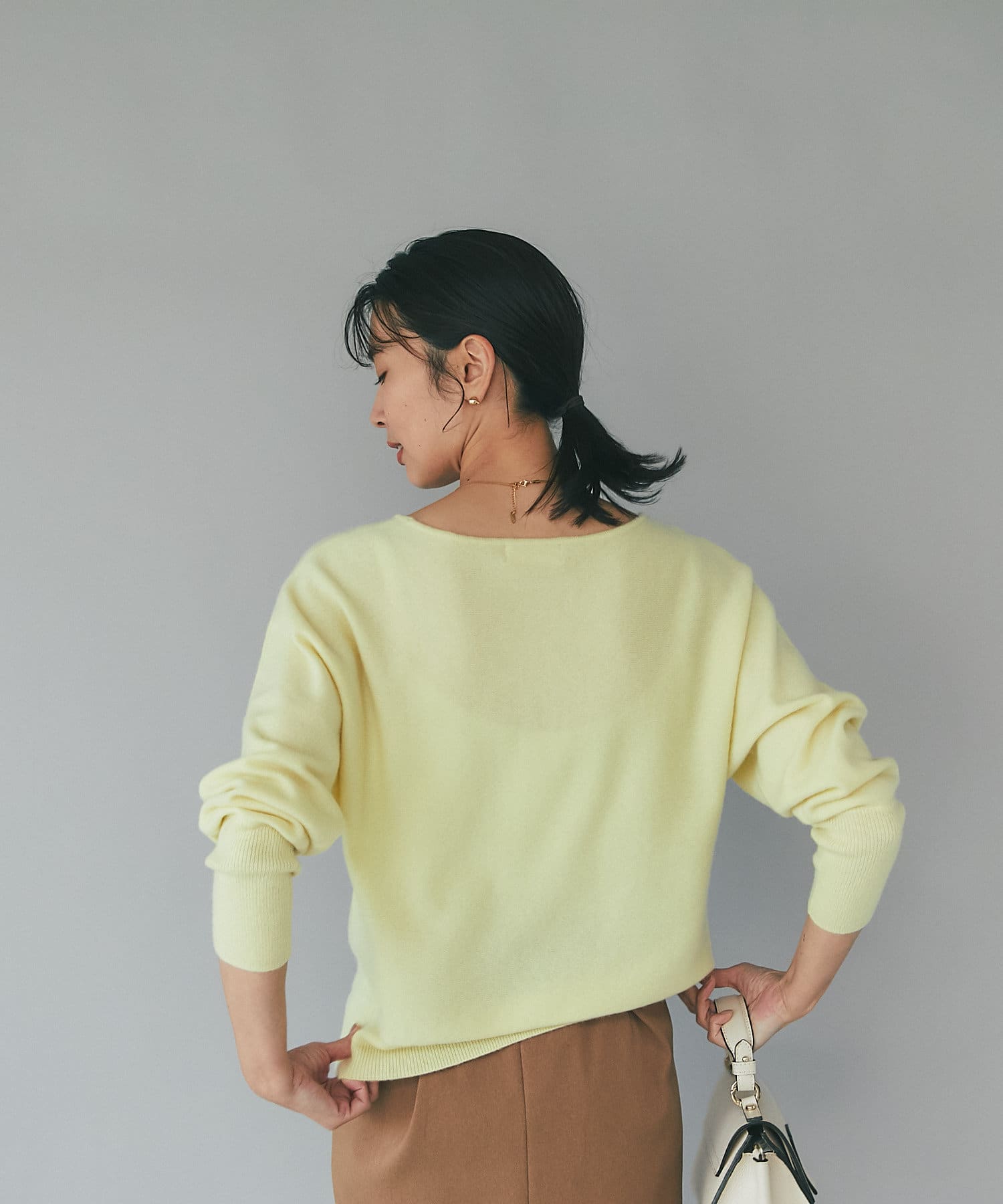 身体のラインを拾いづらいドルマンシルエット。首元は緩やかなラウンドネックで、上品さと女性らしさがある一枚。