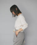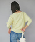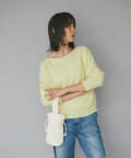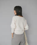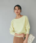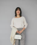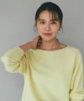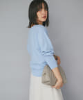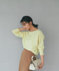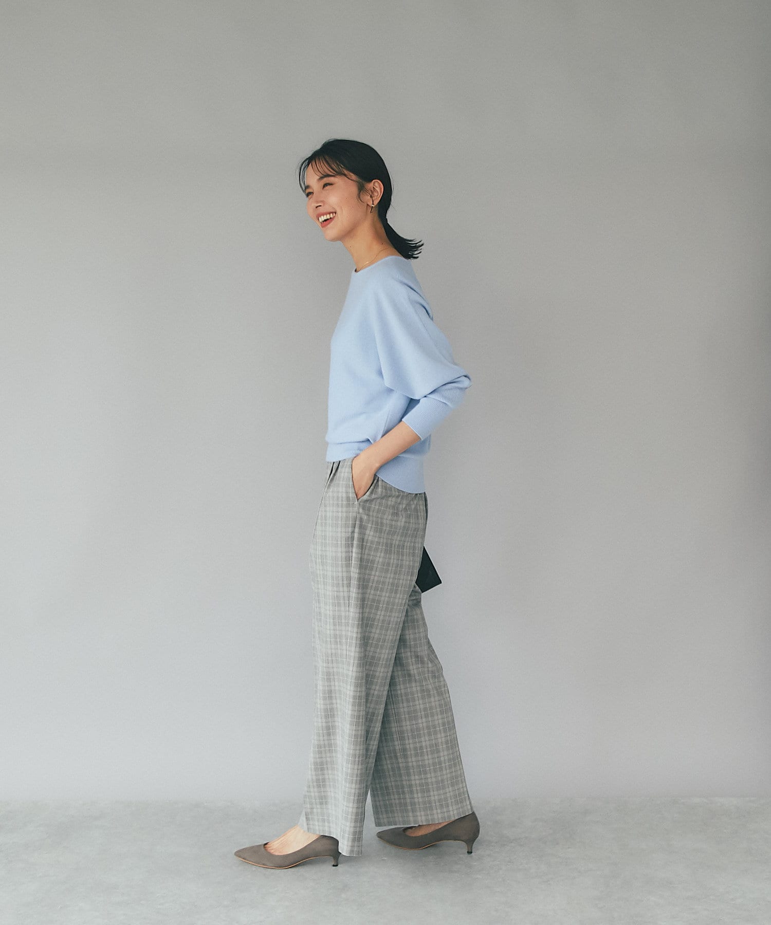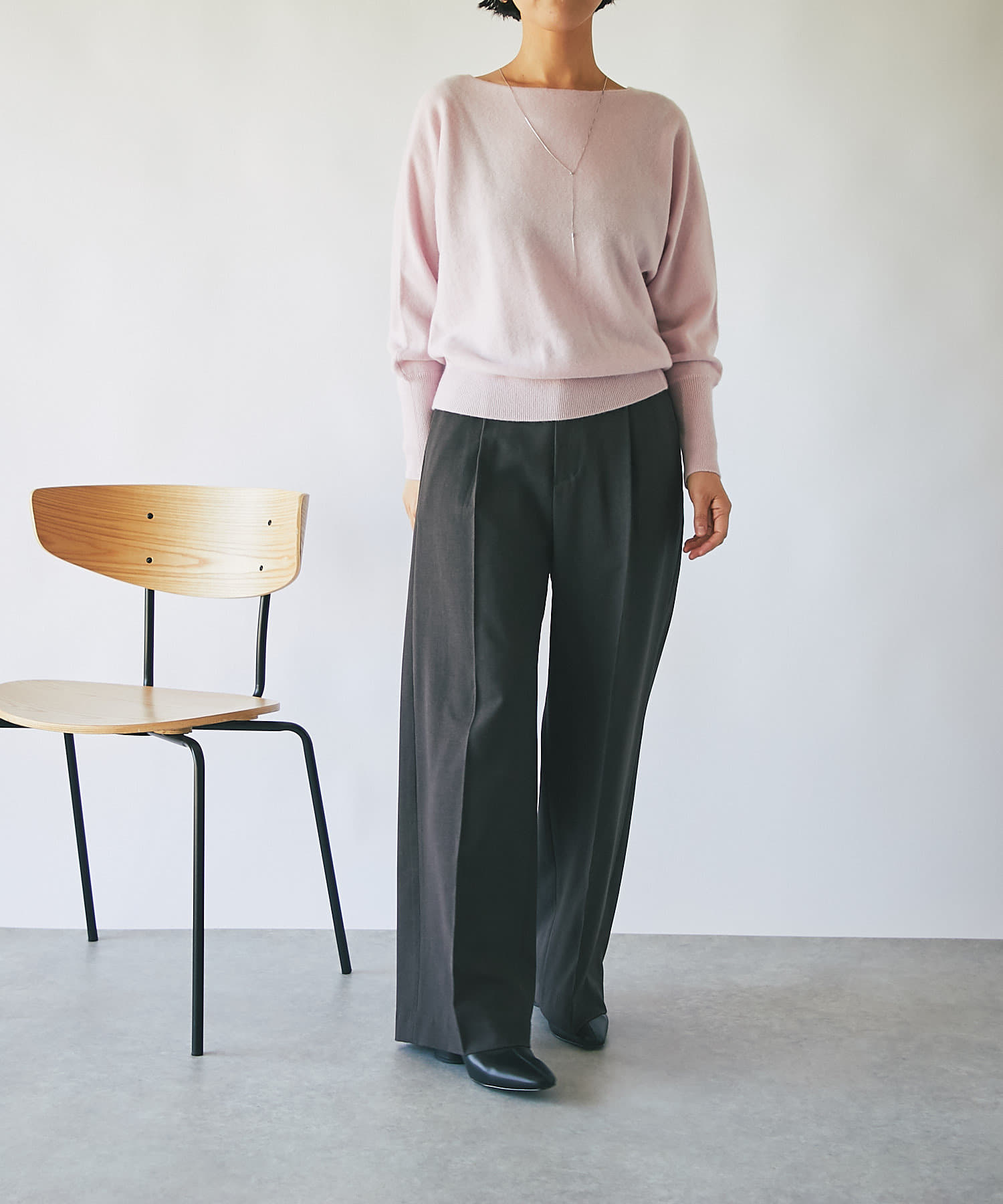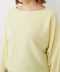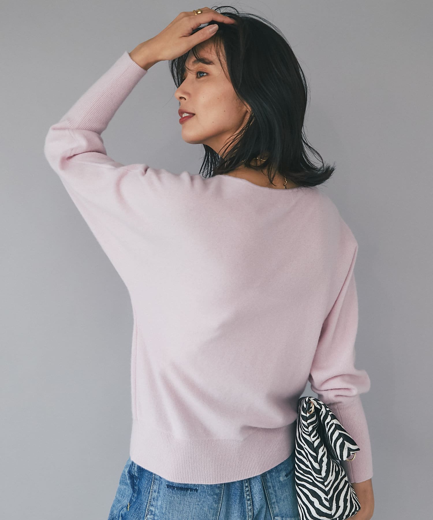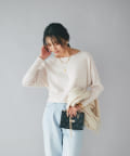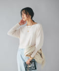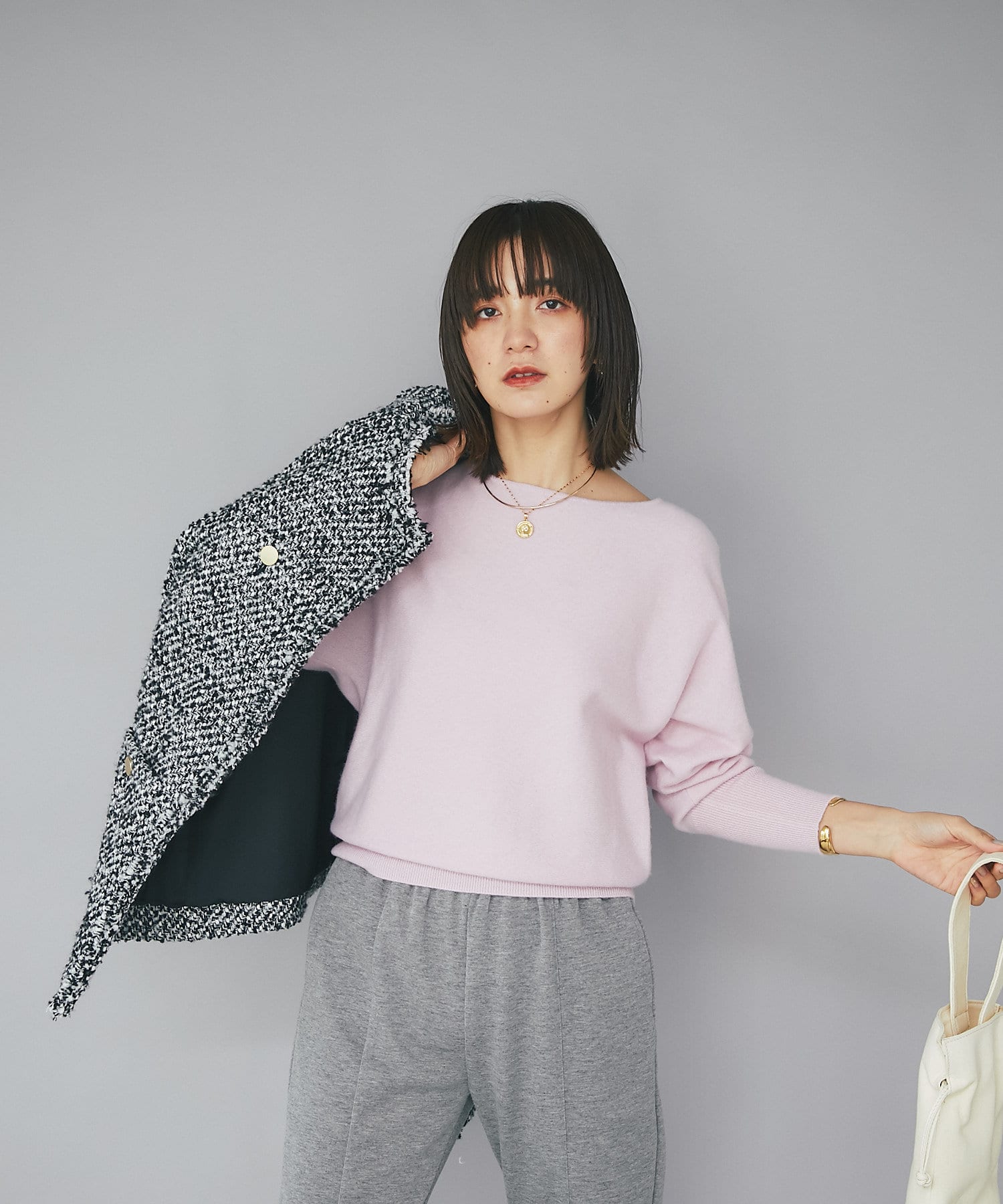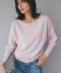 身体のラインを拾いづらいドルマンシルエット。首元は緩やかなラウンドネックで、上品さと女性らしさがある一枚。
