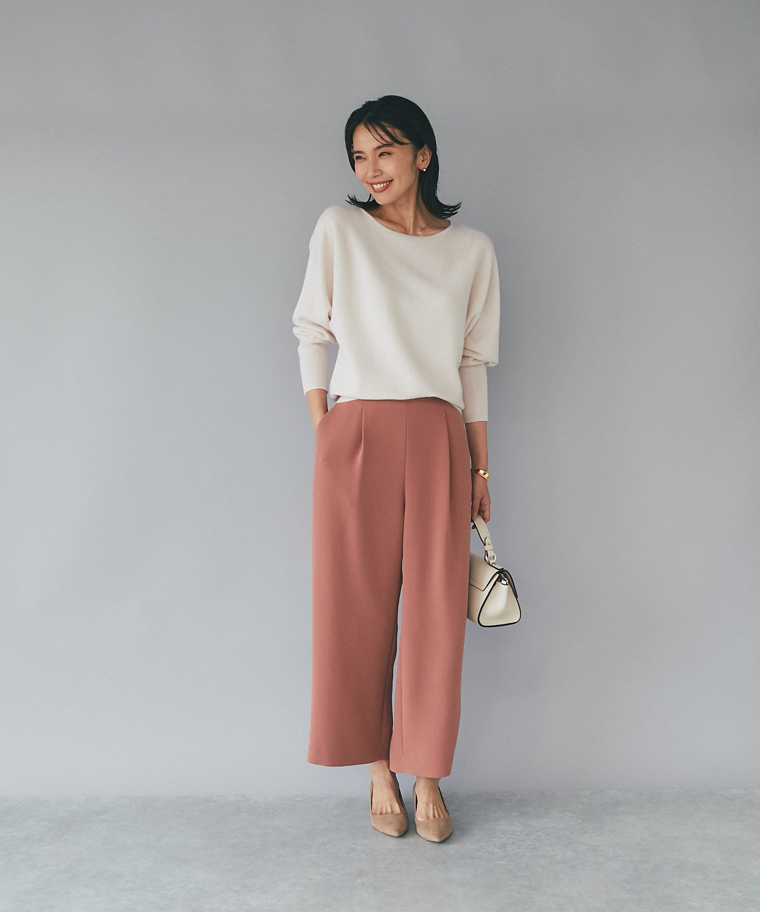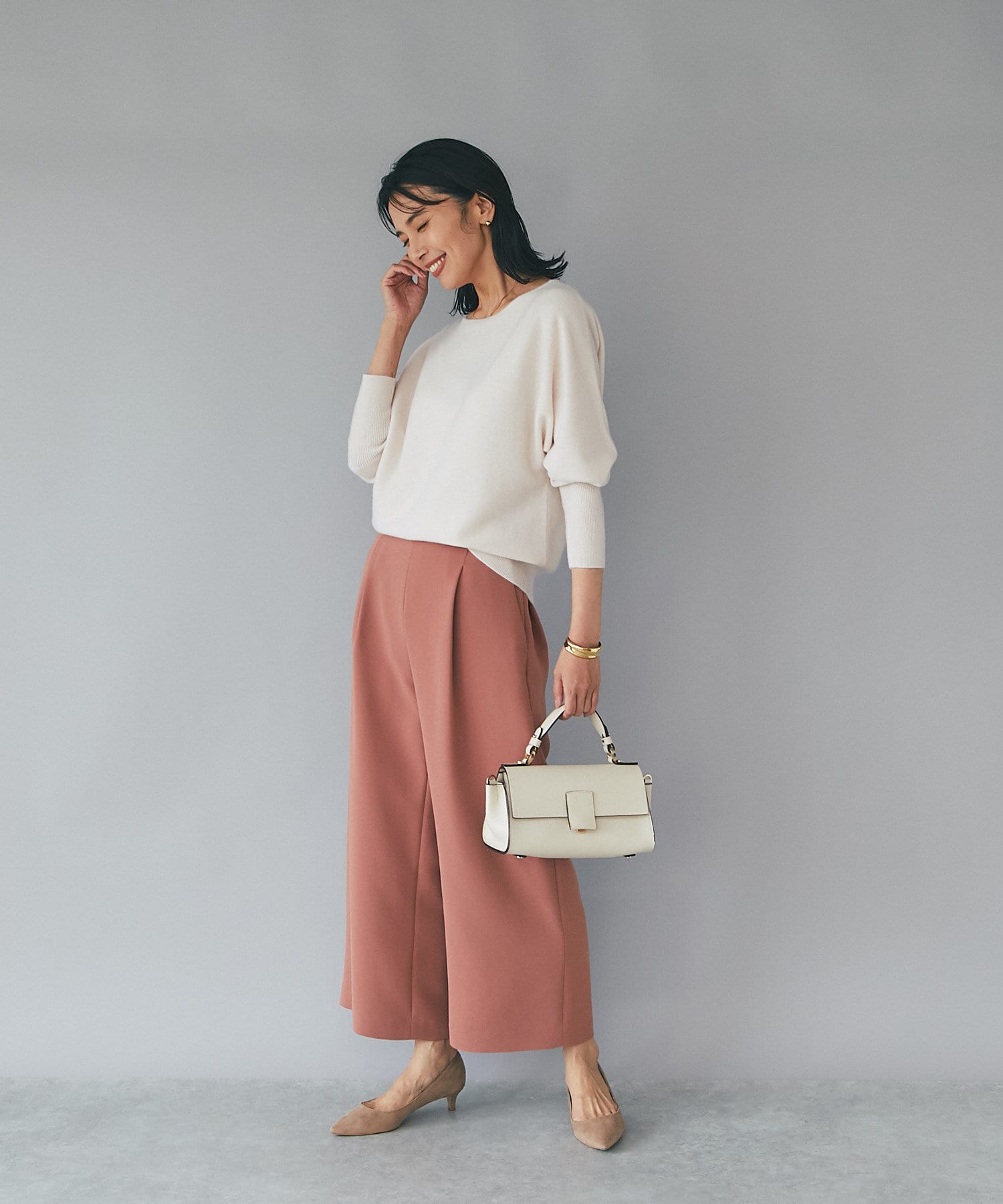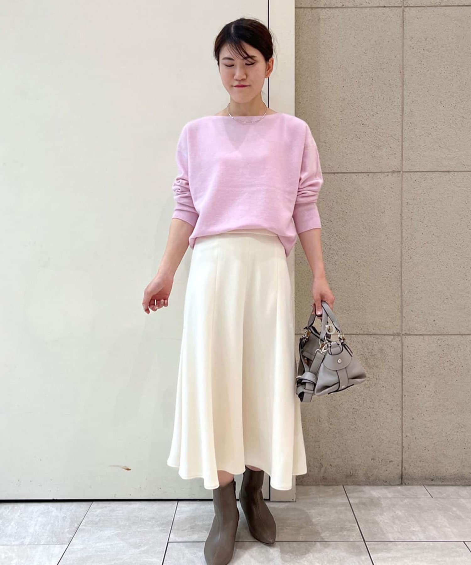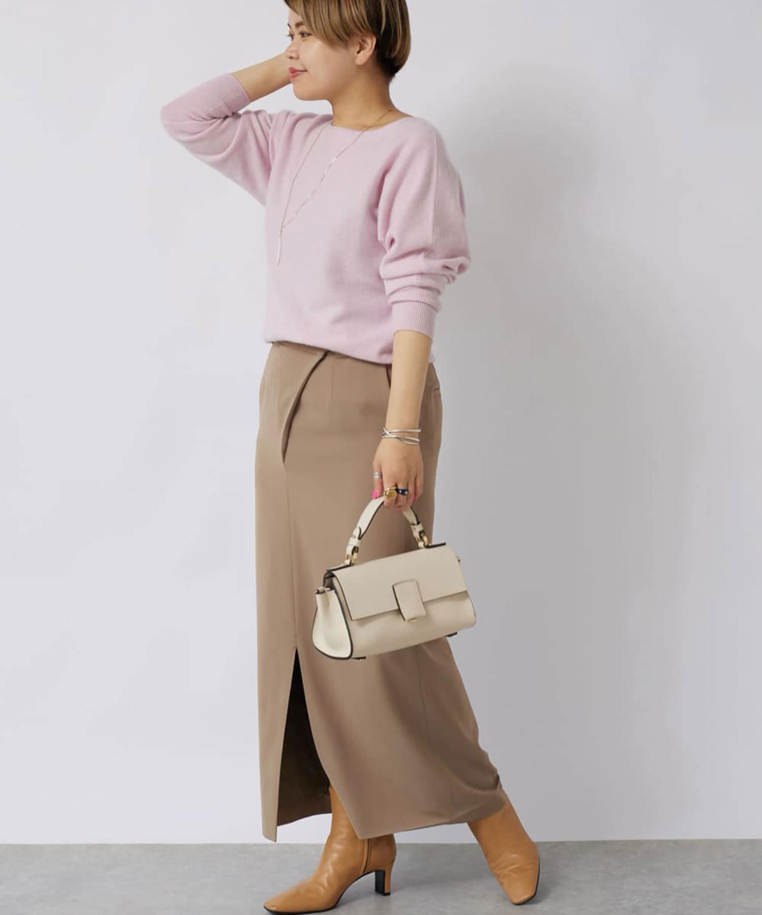 また、上品な風合いはキレイめなアイテムとの相性もよく、タイトスカート、テーパードパンツなどのすっきりとしたシルエットのアイテムで合わせるとより、品のある印象になります。