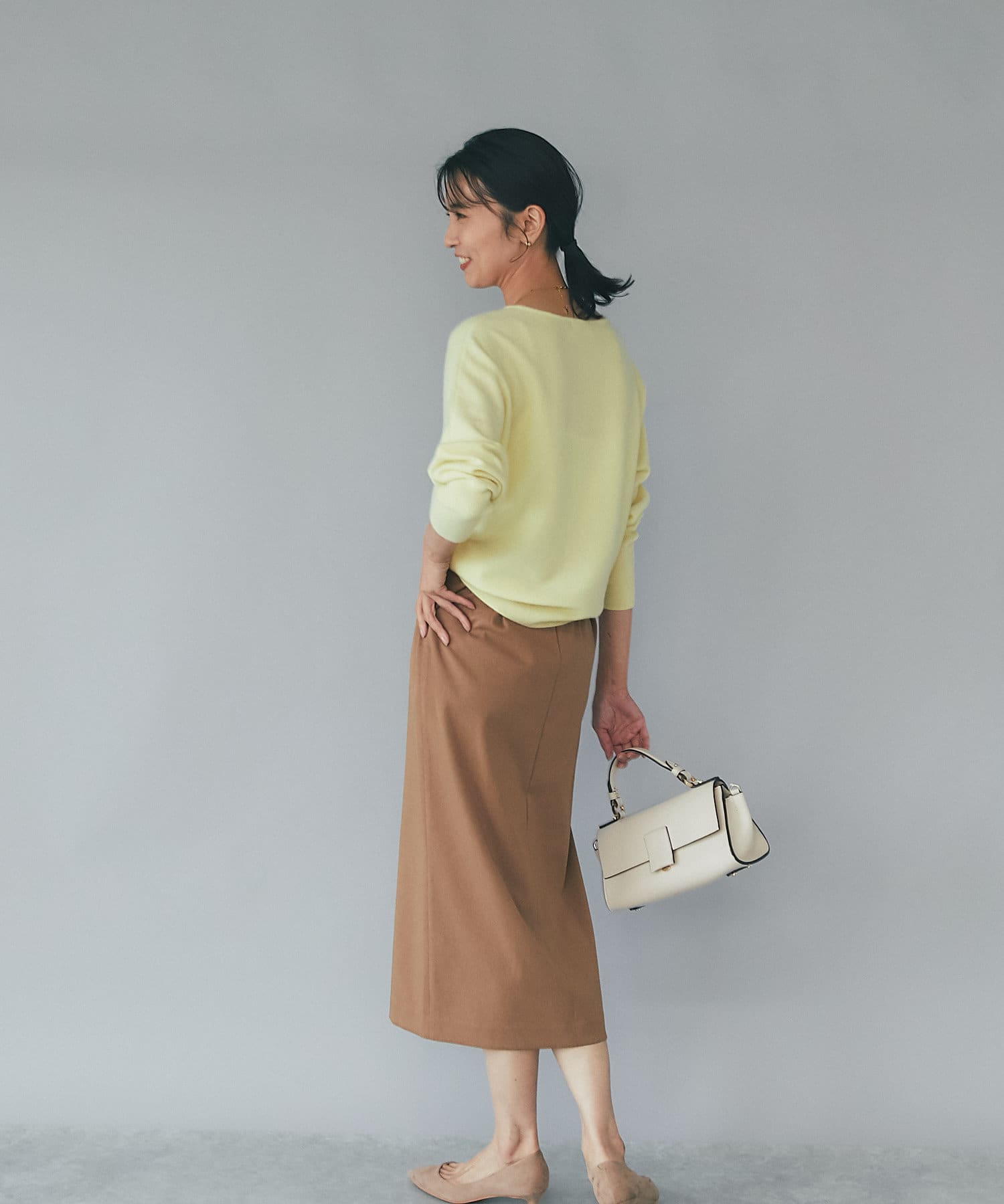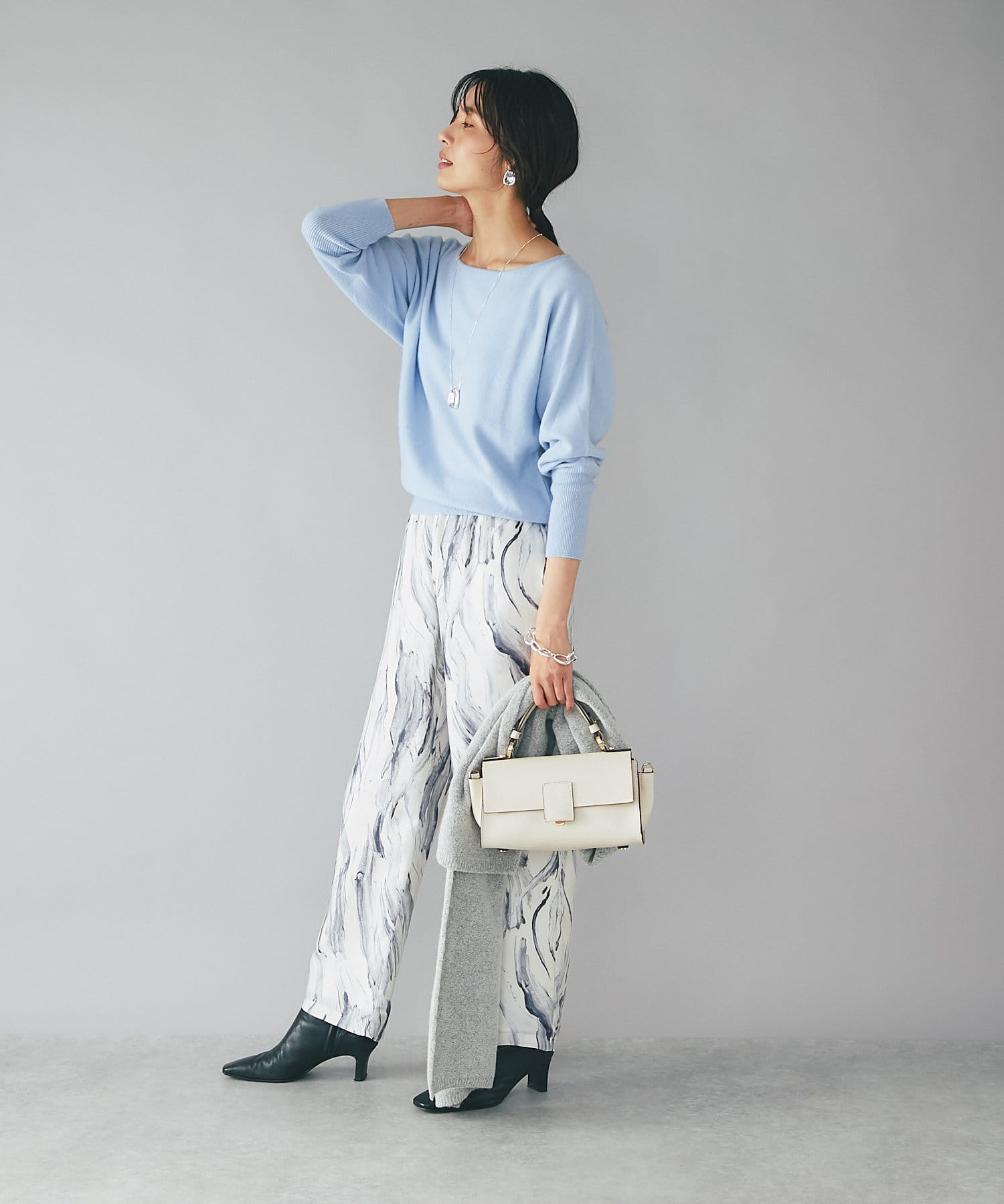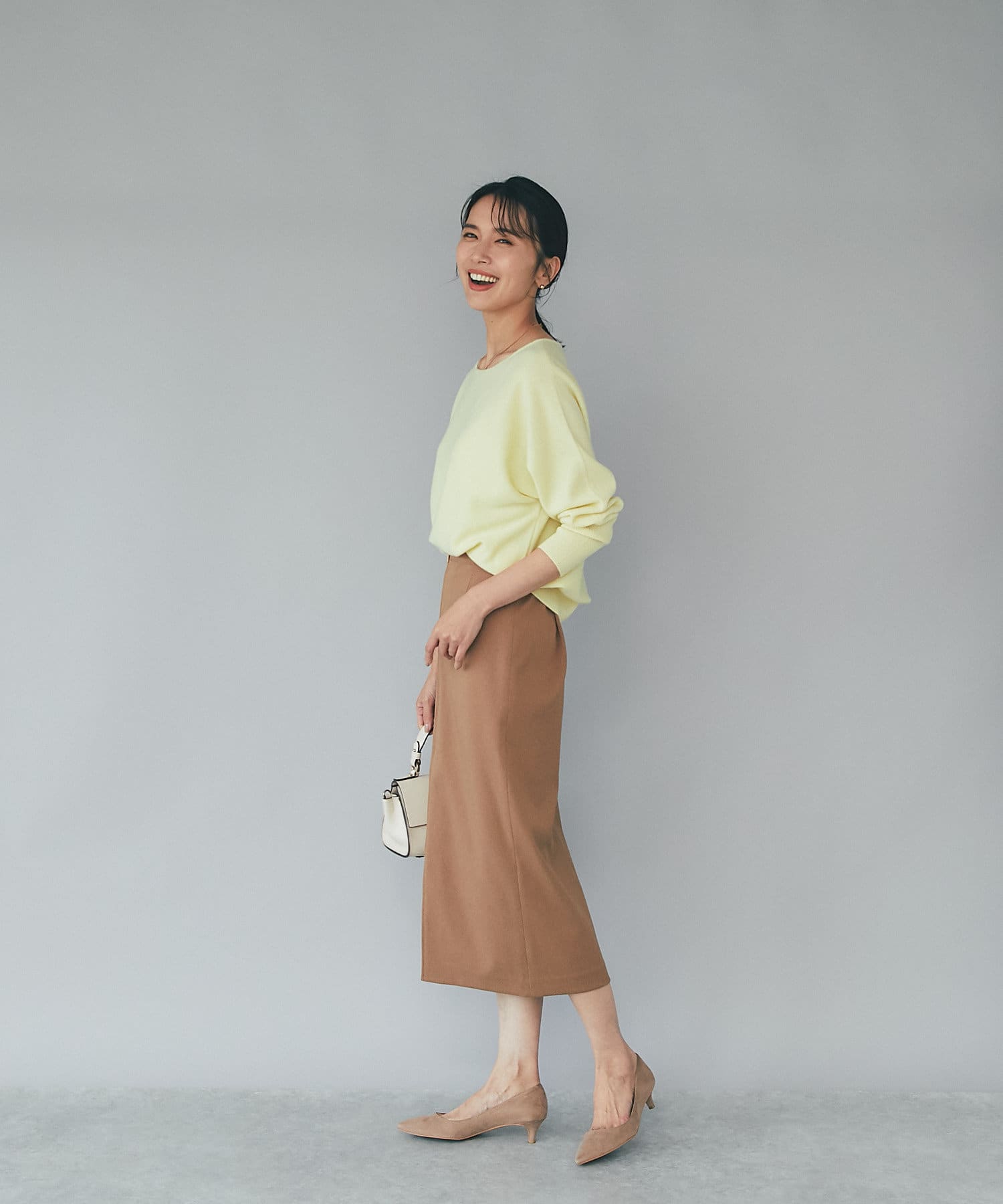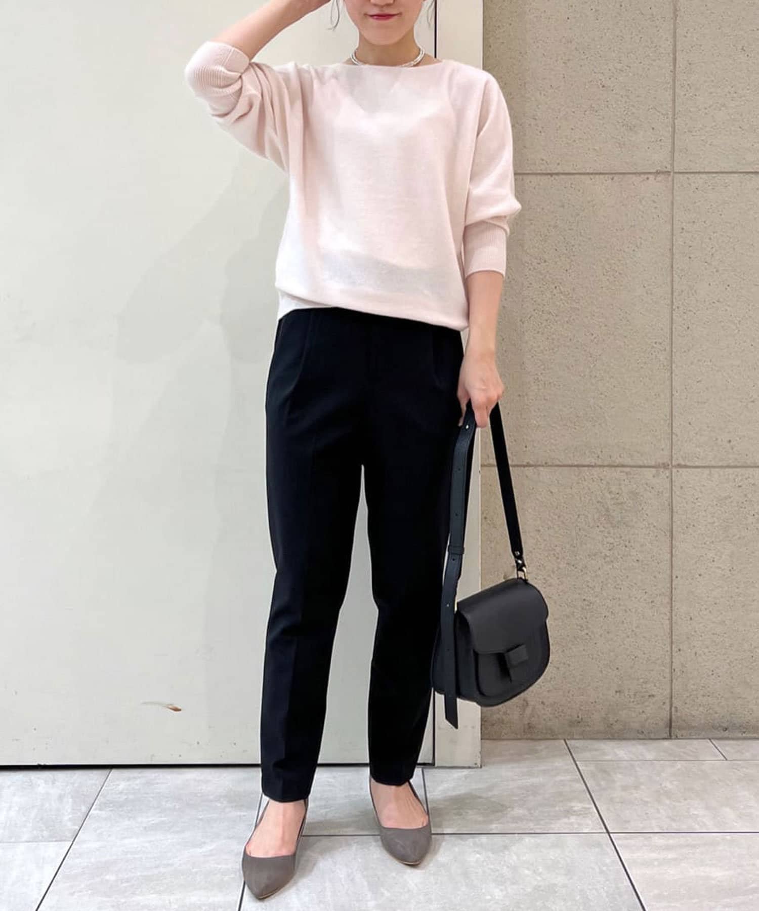 また、上品な風合いはキレイめなアイテムとの相性もよく、タイトスカート、テーパードパンツなどのすっきりとしたシルエットのアイテムで合わせるとより、品のある印象になります。