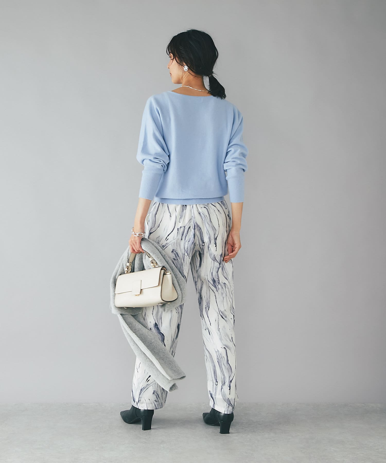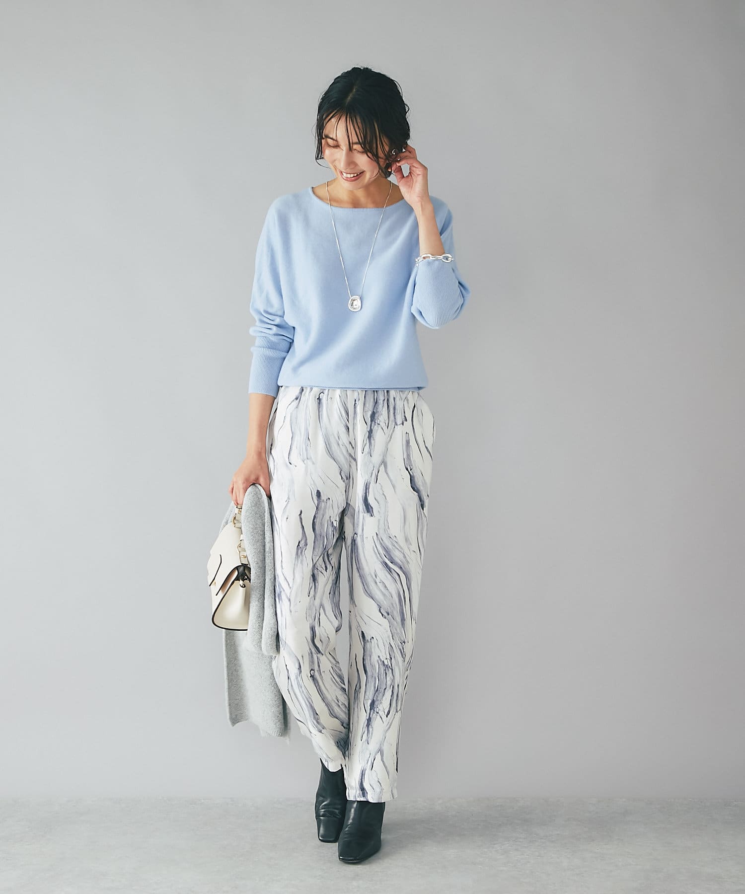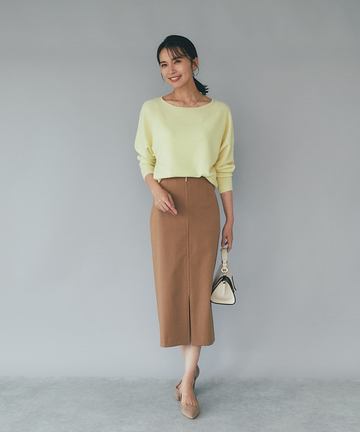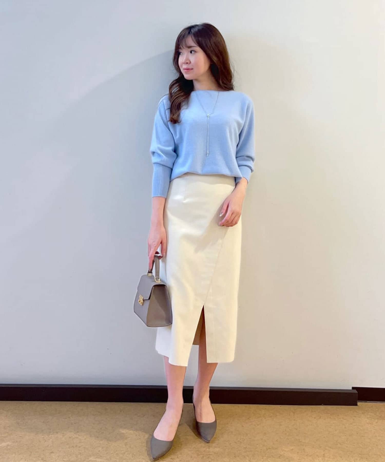 また、上品な風合いはキレイめなアイテムとの相性もよく、タイトスカート、テーパードパンツなどのすっきりとしたシルエットのアイテムで合わせるとより、品のある印象になります。