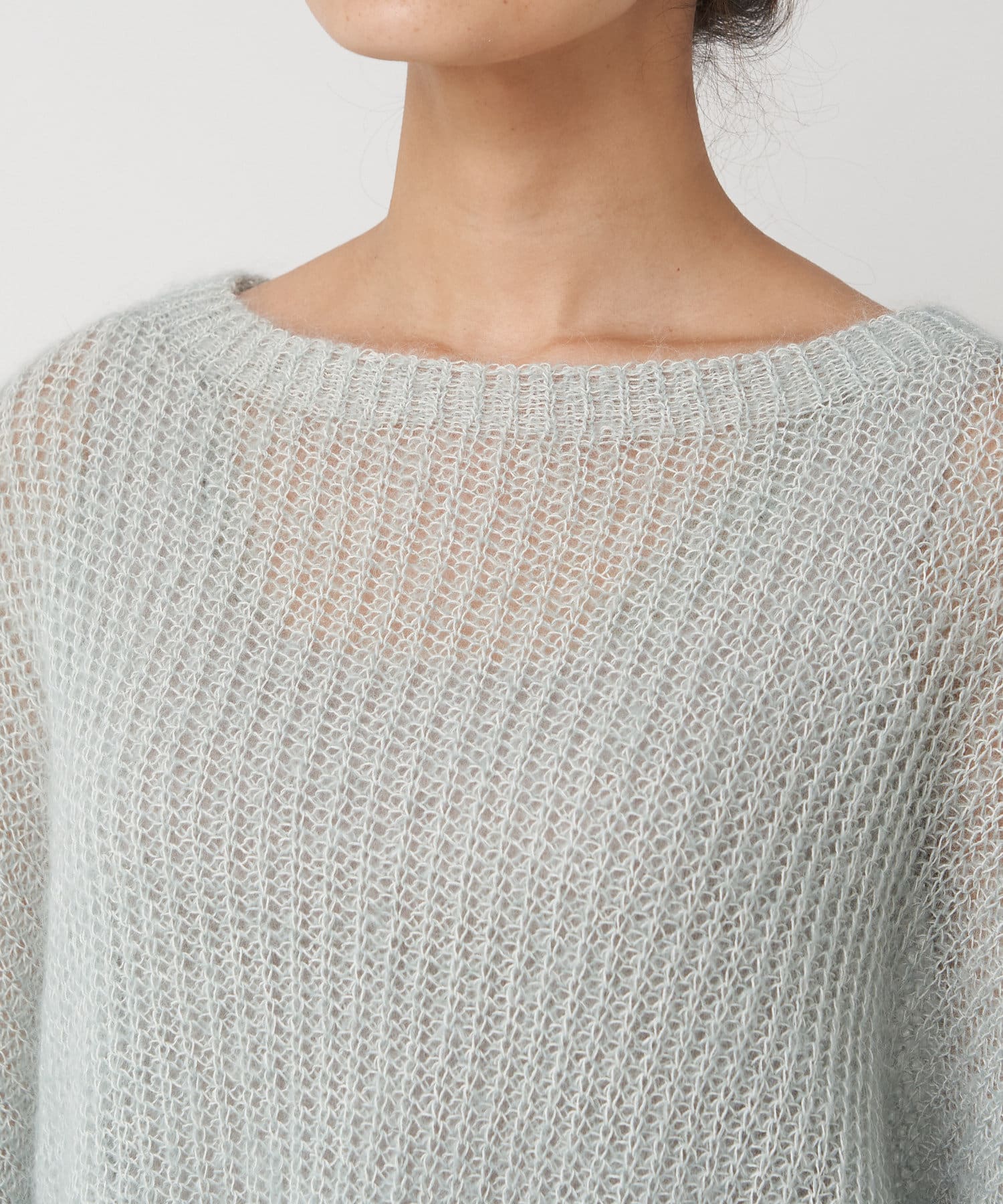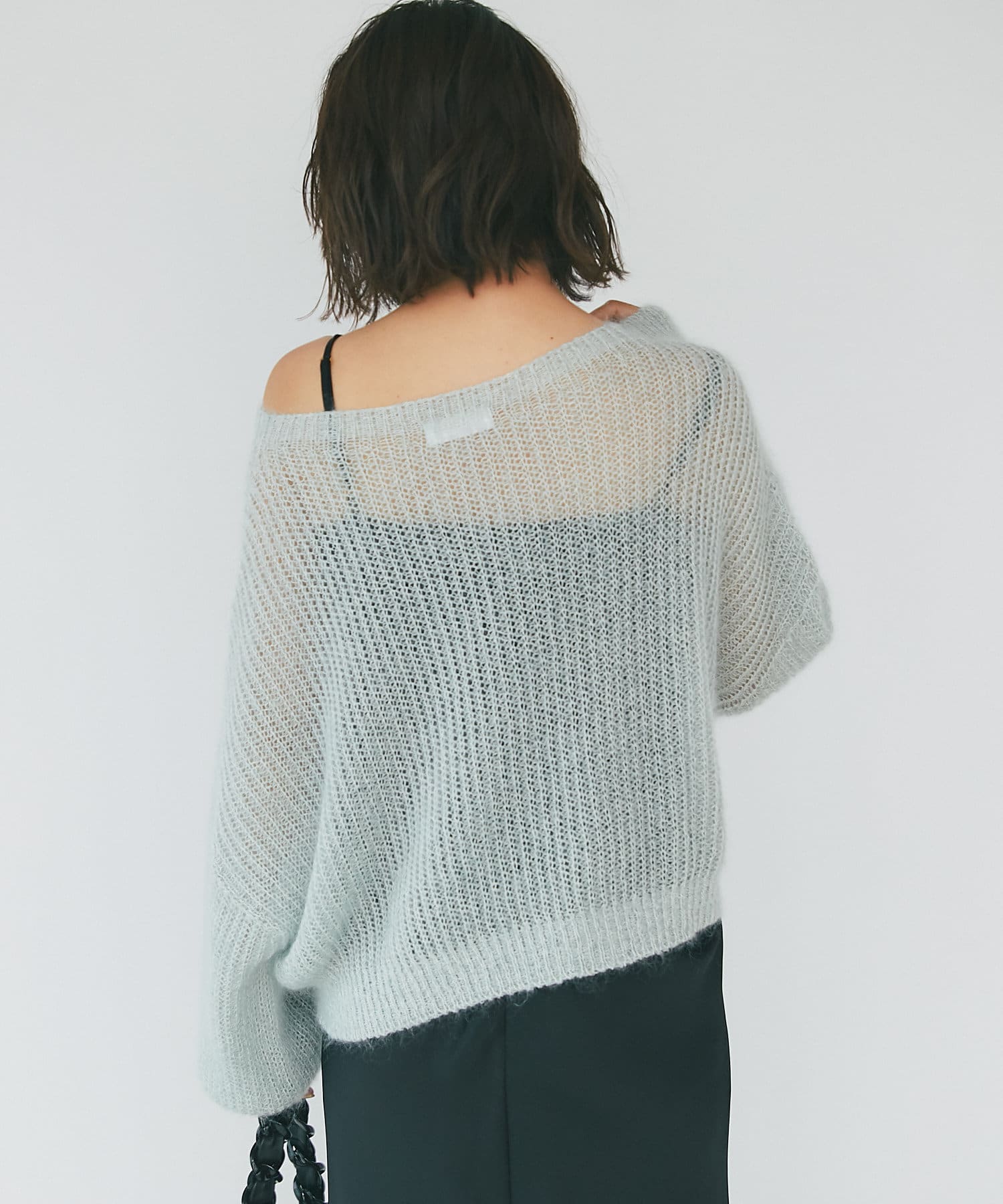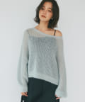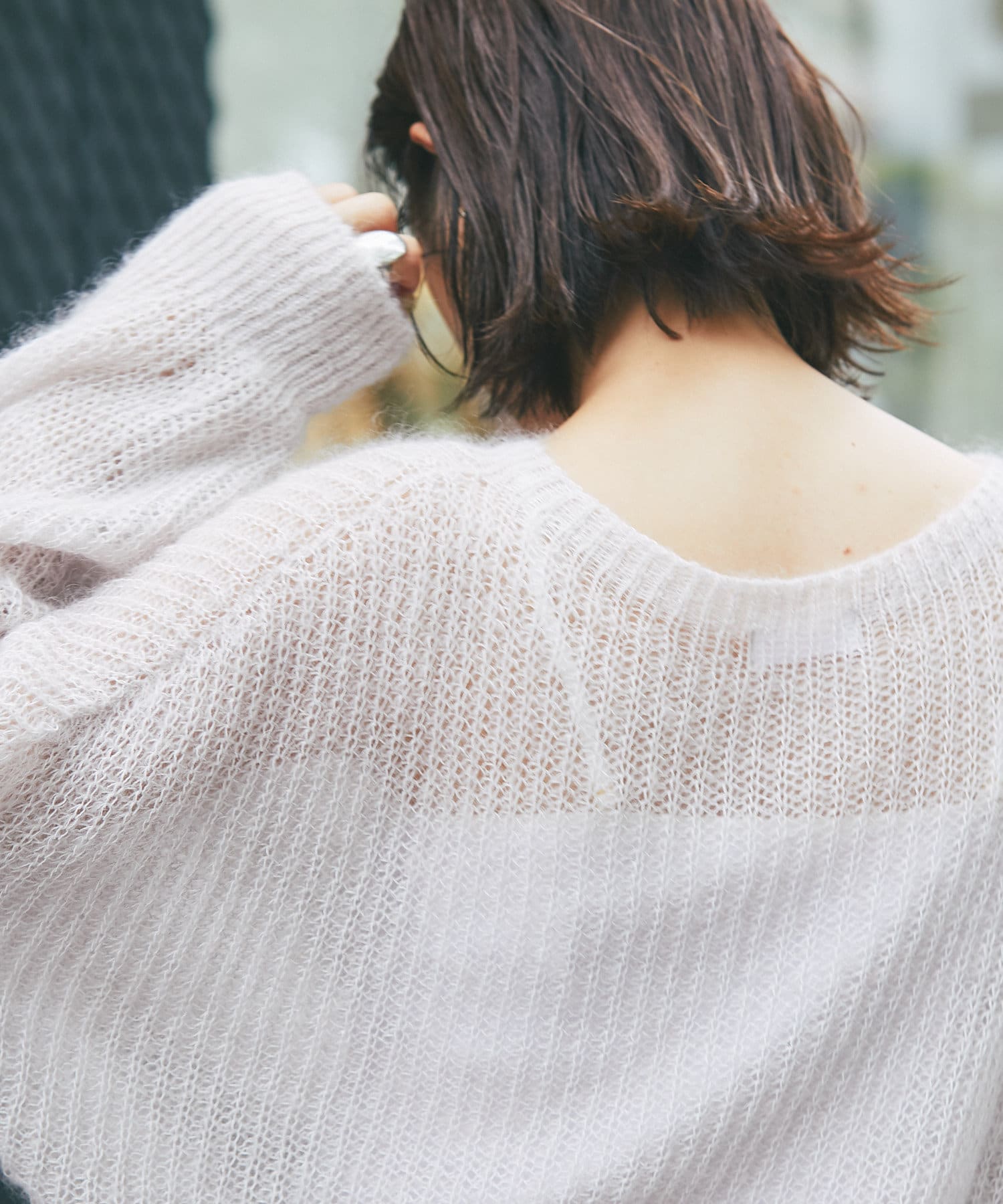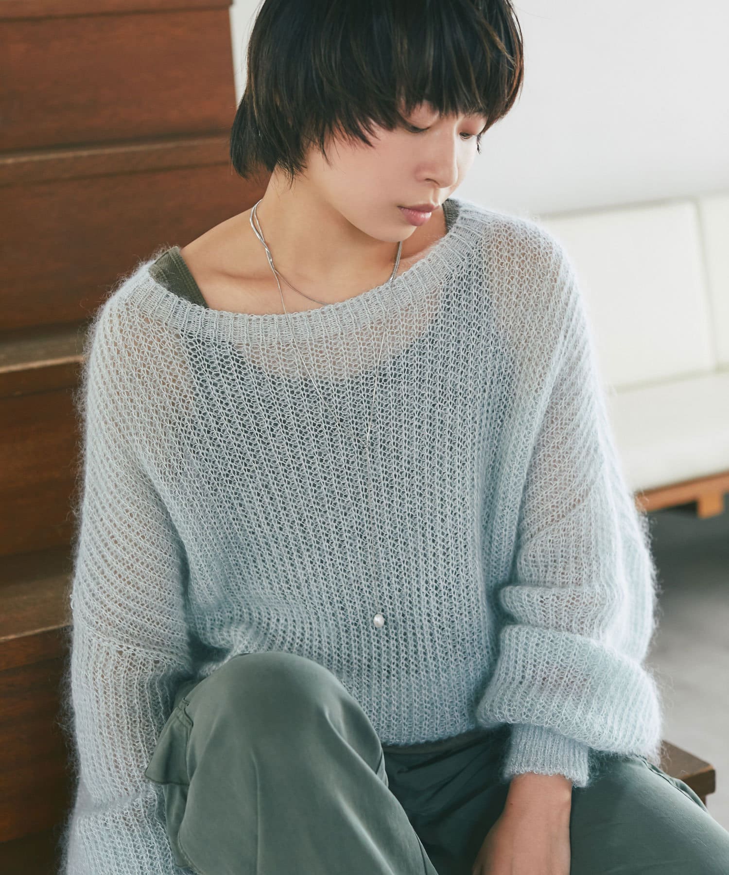 毛足のあるモヘアとペーパーヤーンを緩く透けるように編んだルーズニット。