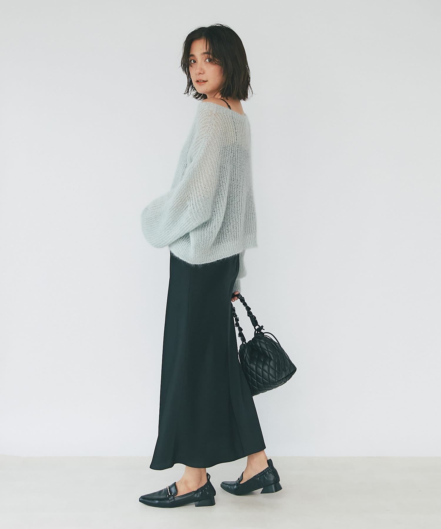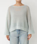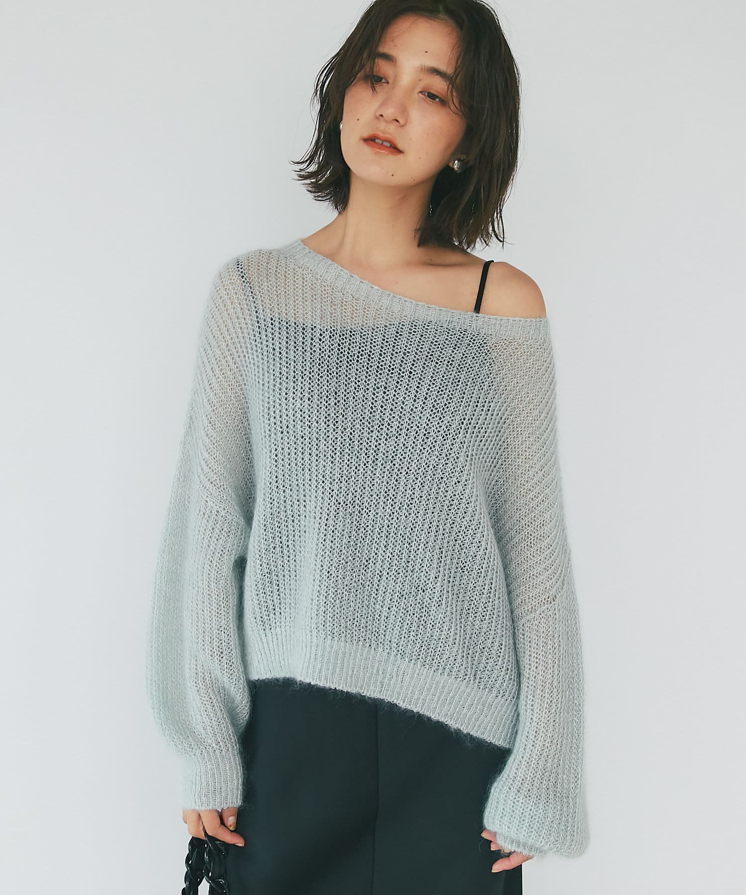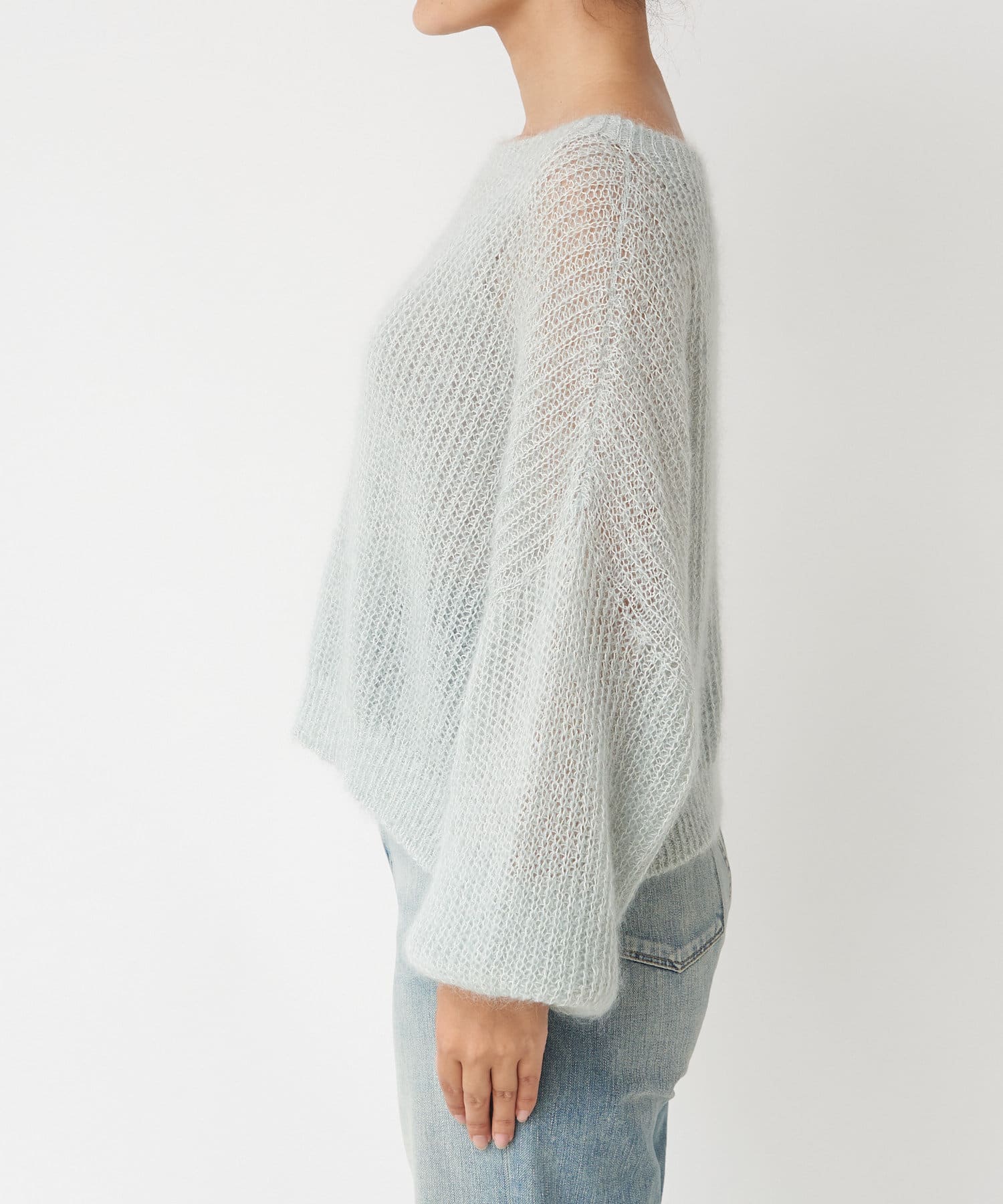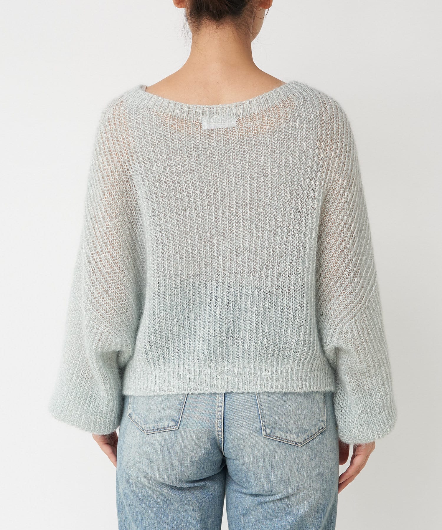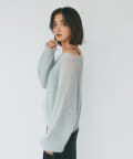 毛足のあるモヘアとペーパーヤーンを緩く透けるように編んだルーズニット。
