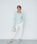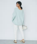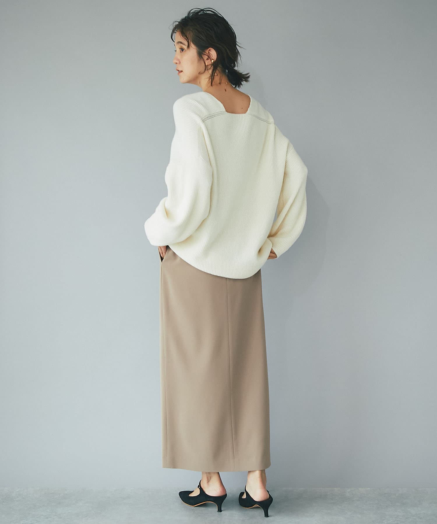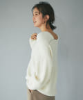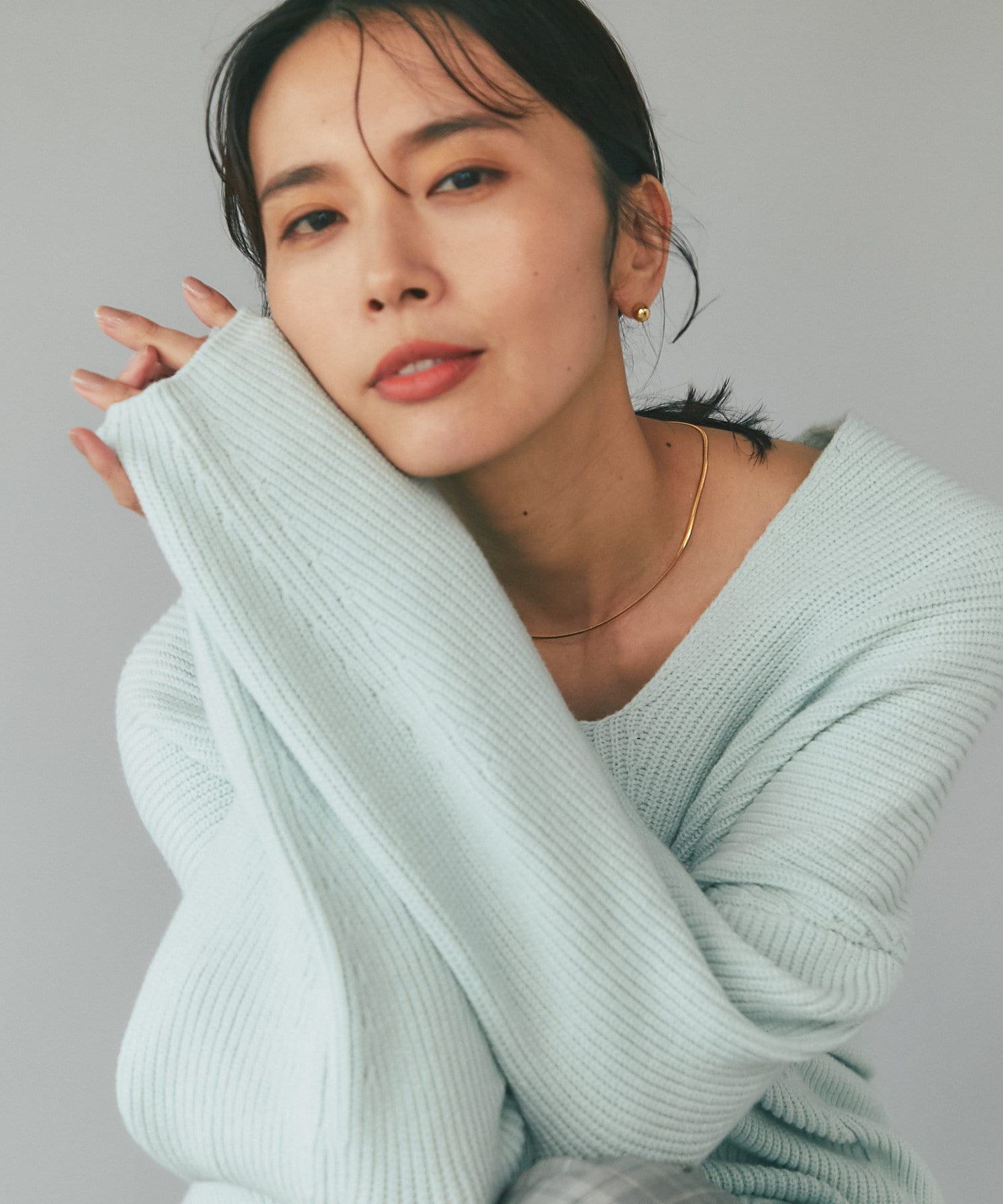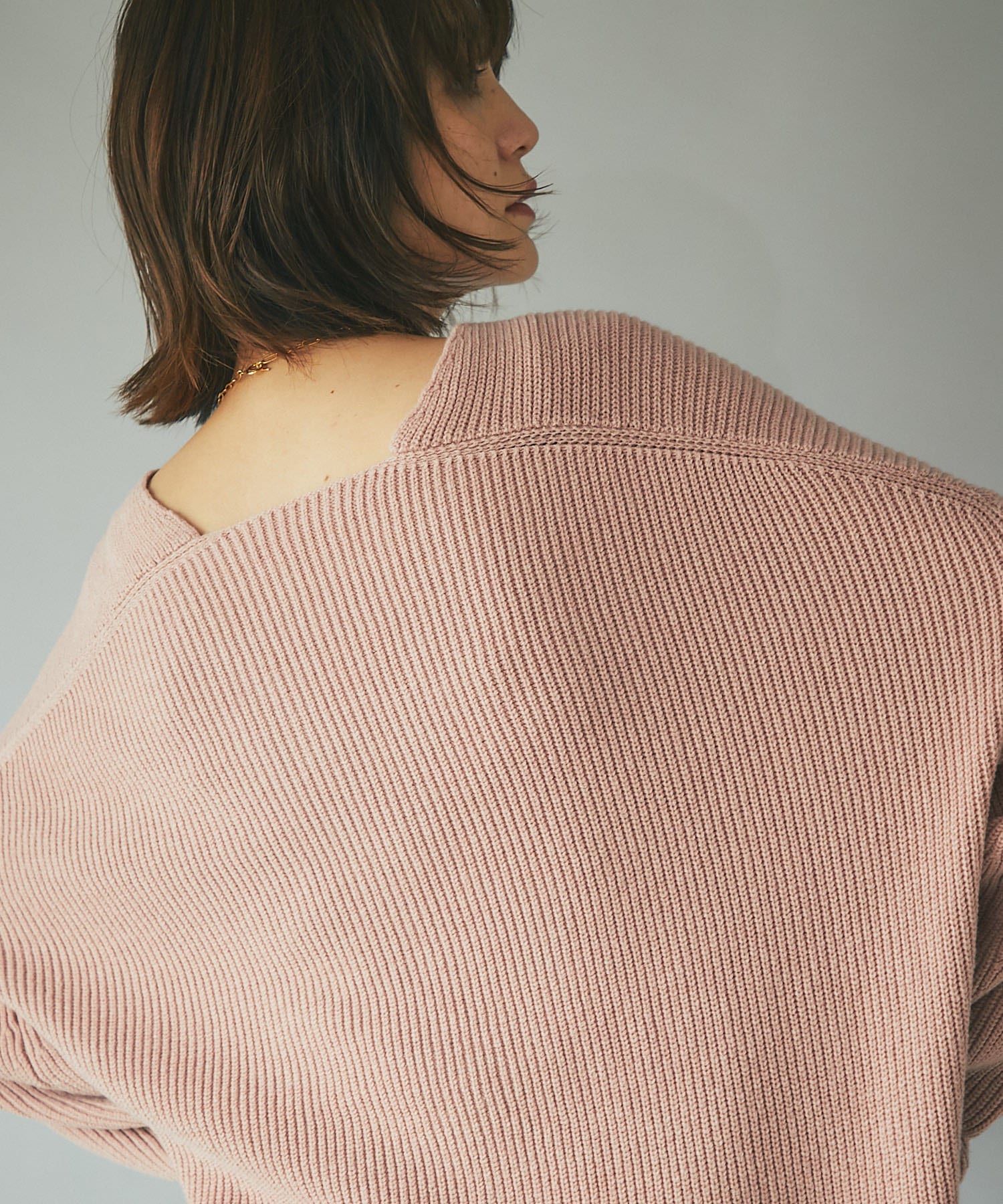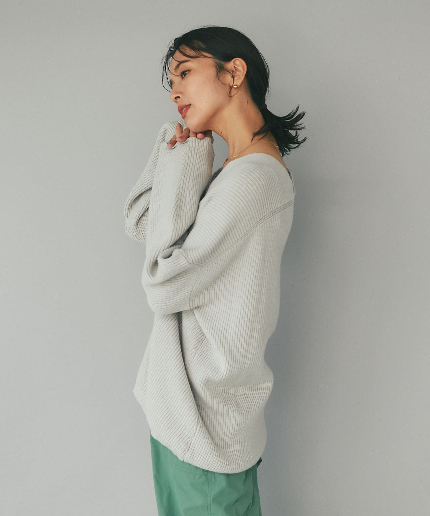 ふっくらと立体的な片畦の編地とフェミニンなネックラインが絶妙にマッチした抜け感たっぷりなデザインです。 オーガニックコットン70%、ストレッチポリエステル25%、ウール5%をブレンドした心地いい肌触りが特徴。