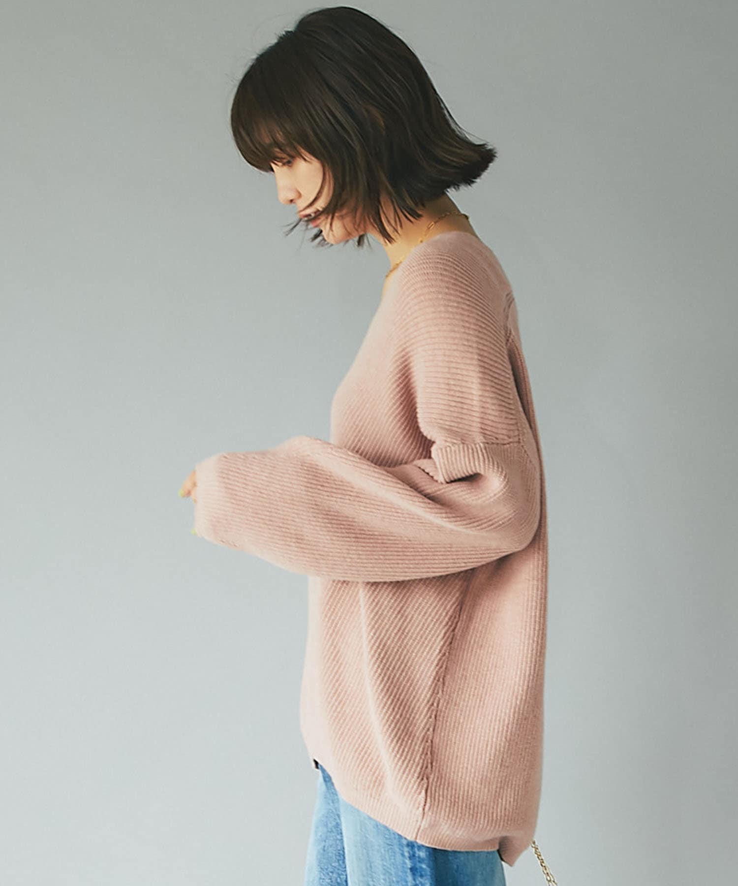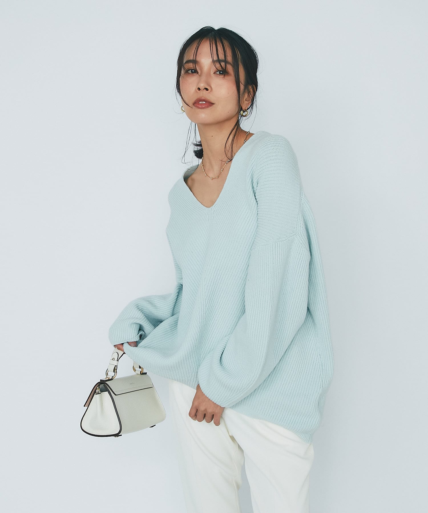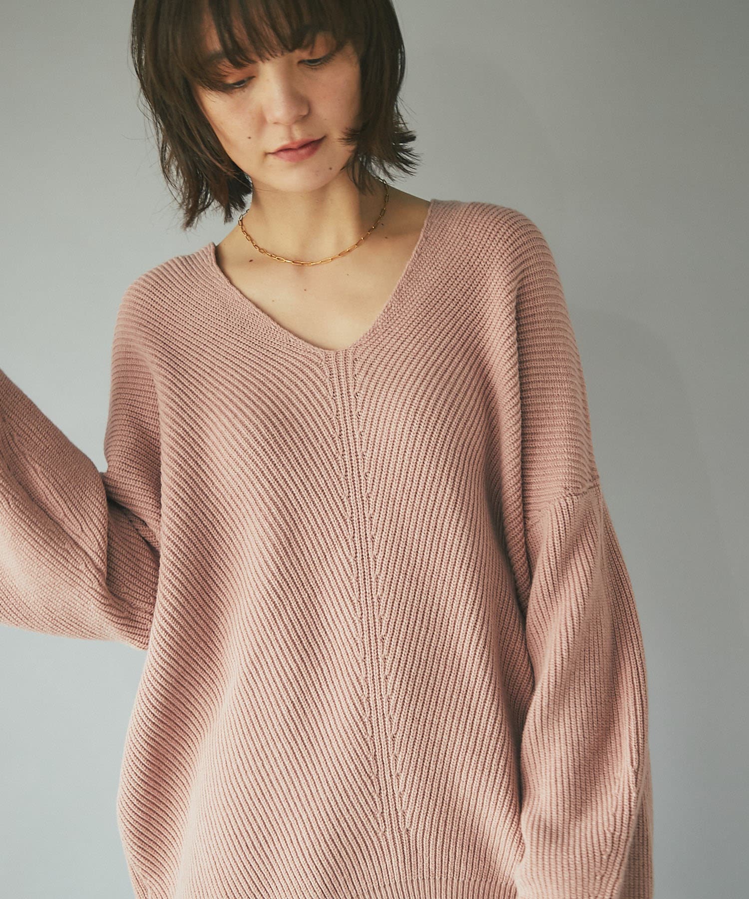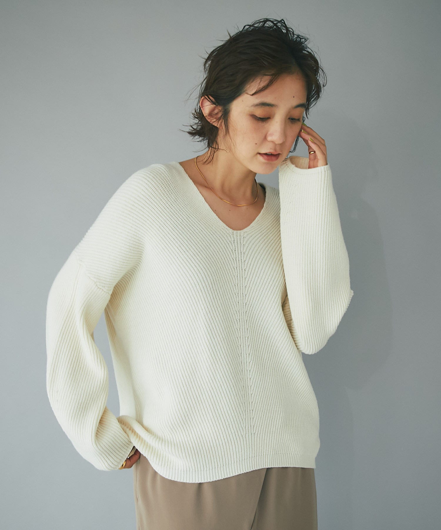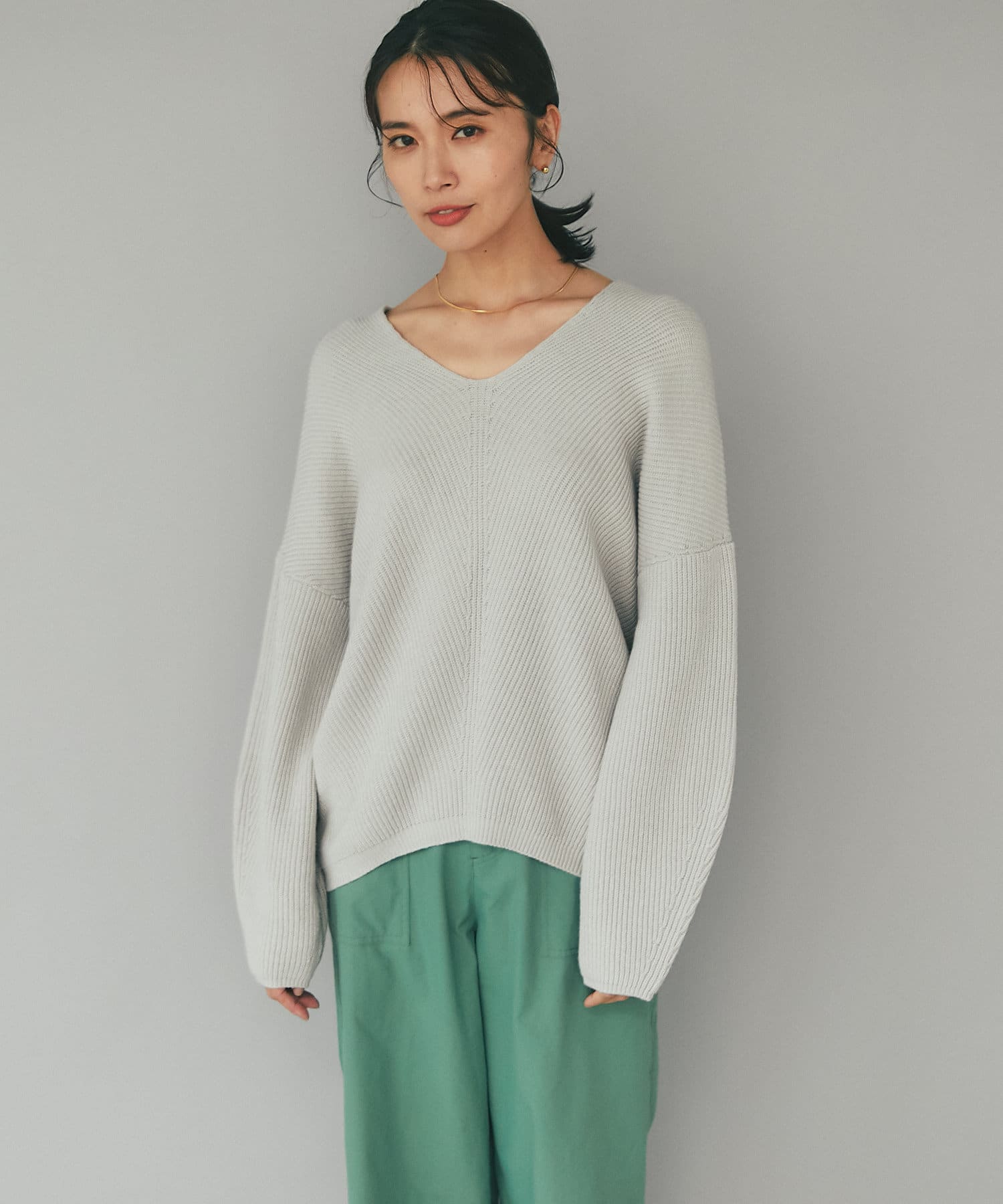 ユルッとしたサイズ感と丸みを帯びた袖と裾のバルーンフォルムが女性らしいVネックプルオーバー。