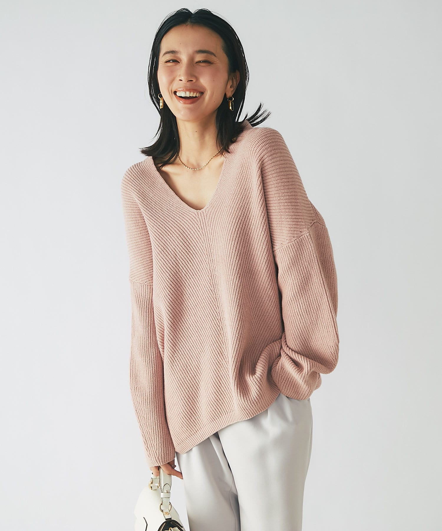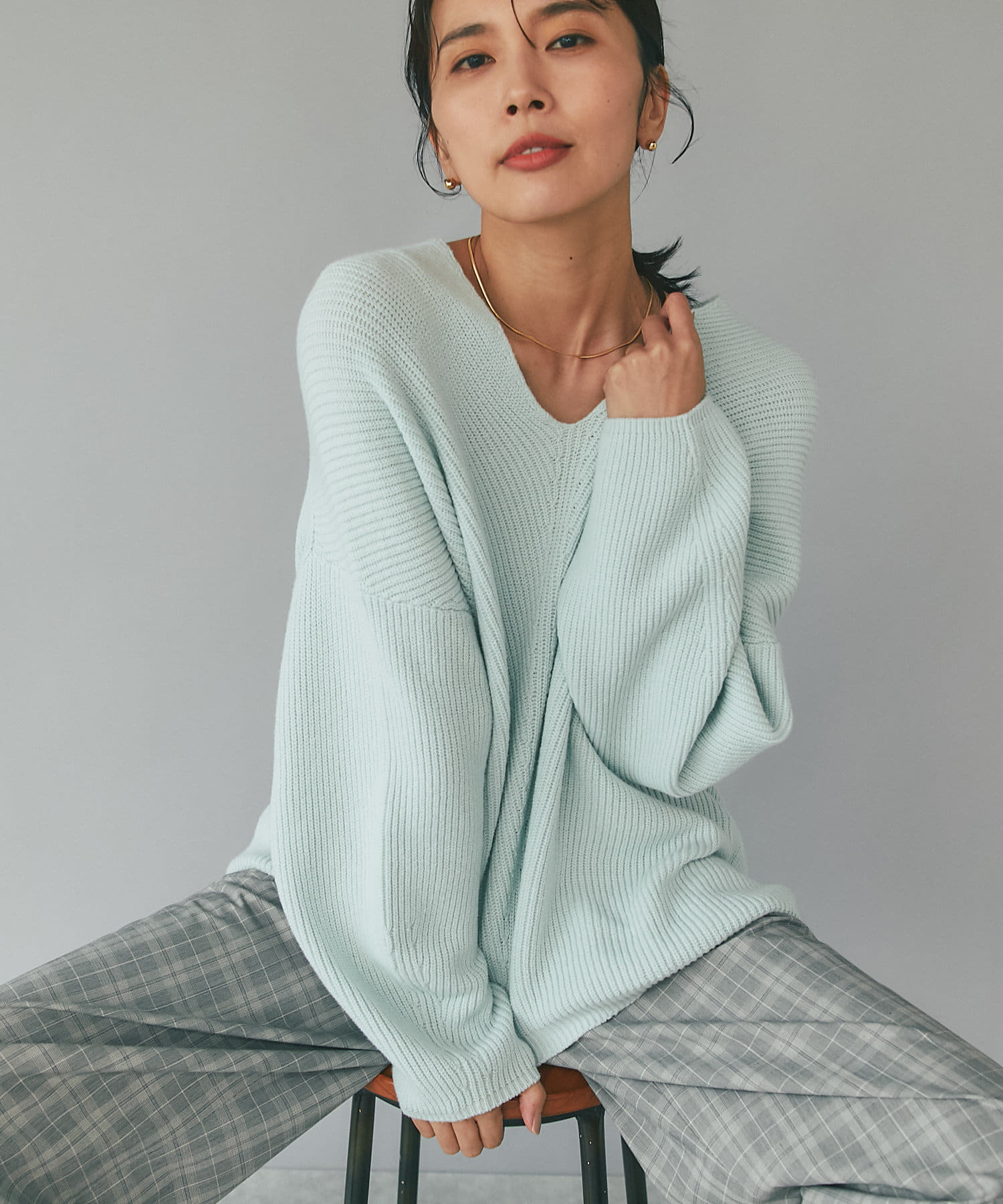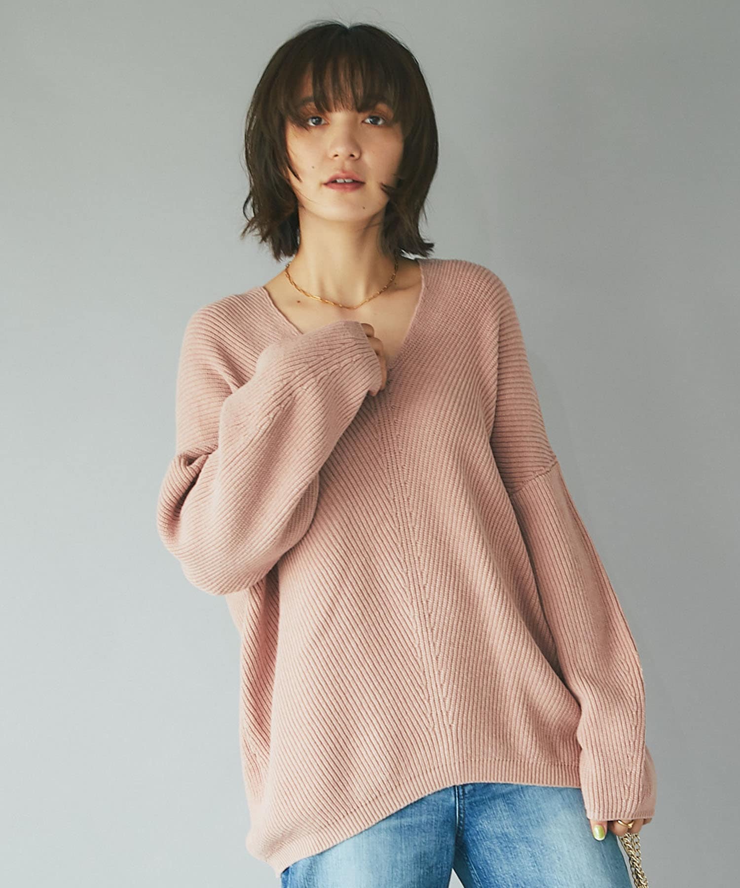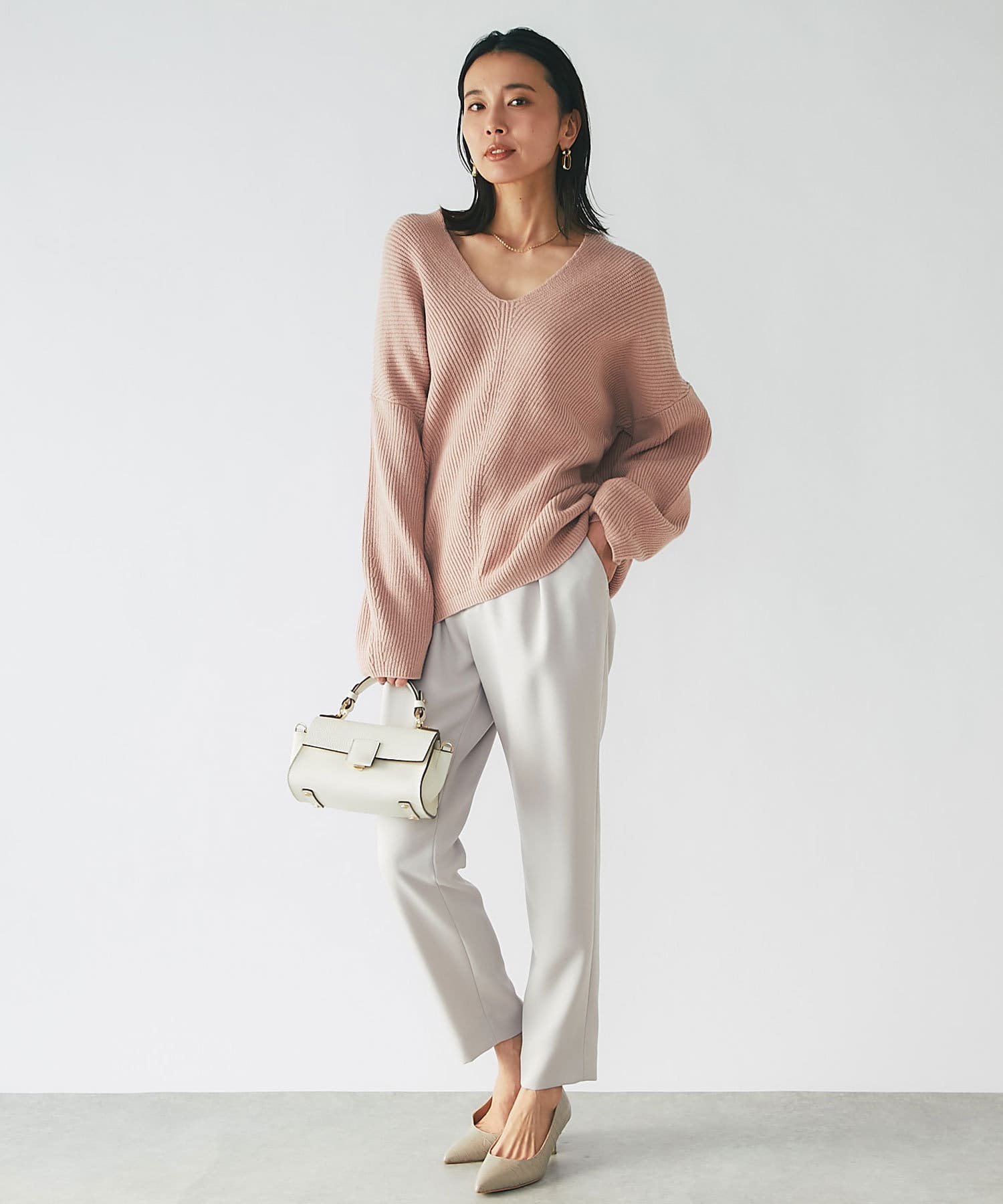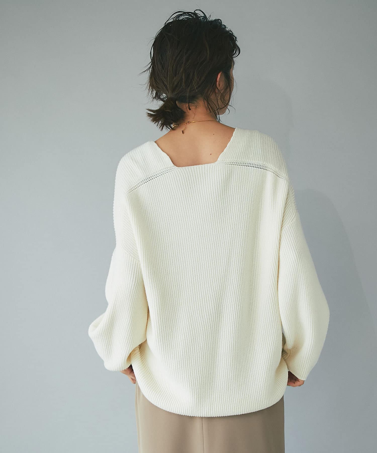 ユルッとしたサイズ感と丸みを帯びた袖と裾のバルーンフォルムが女性らしいVネックプルオーバー。