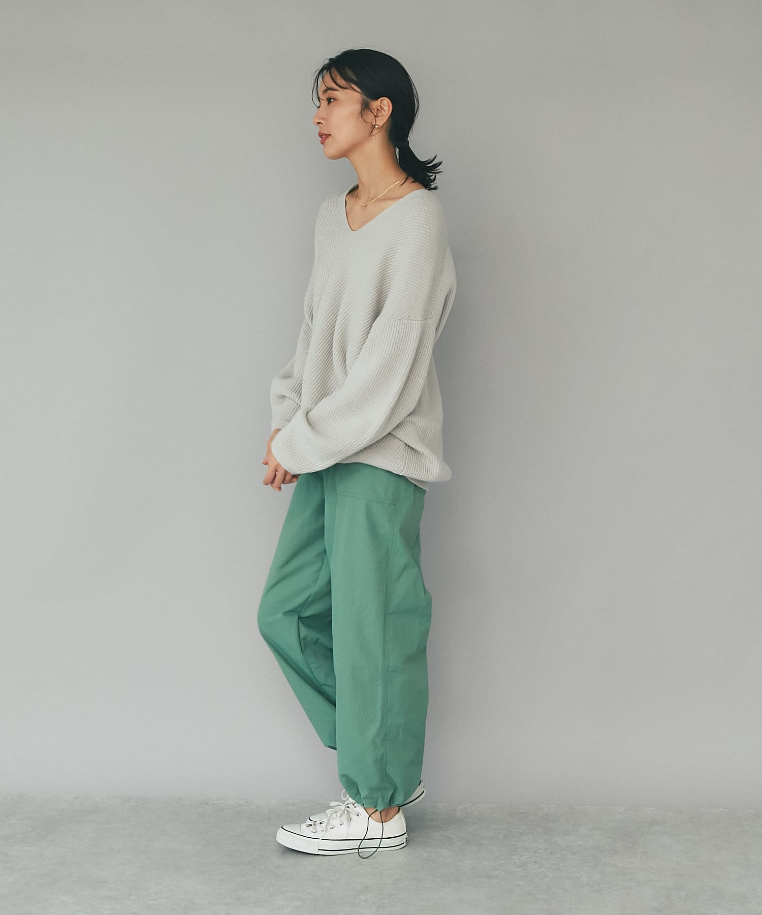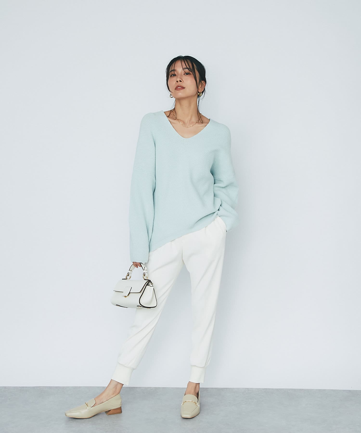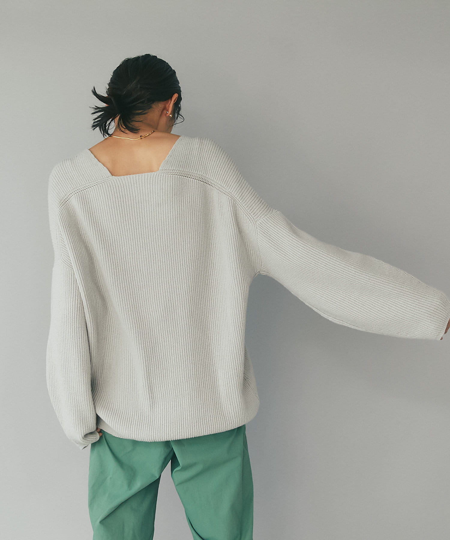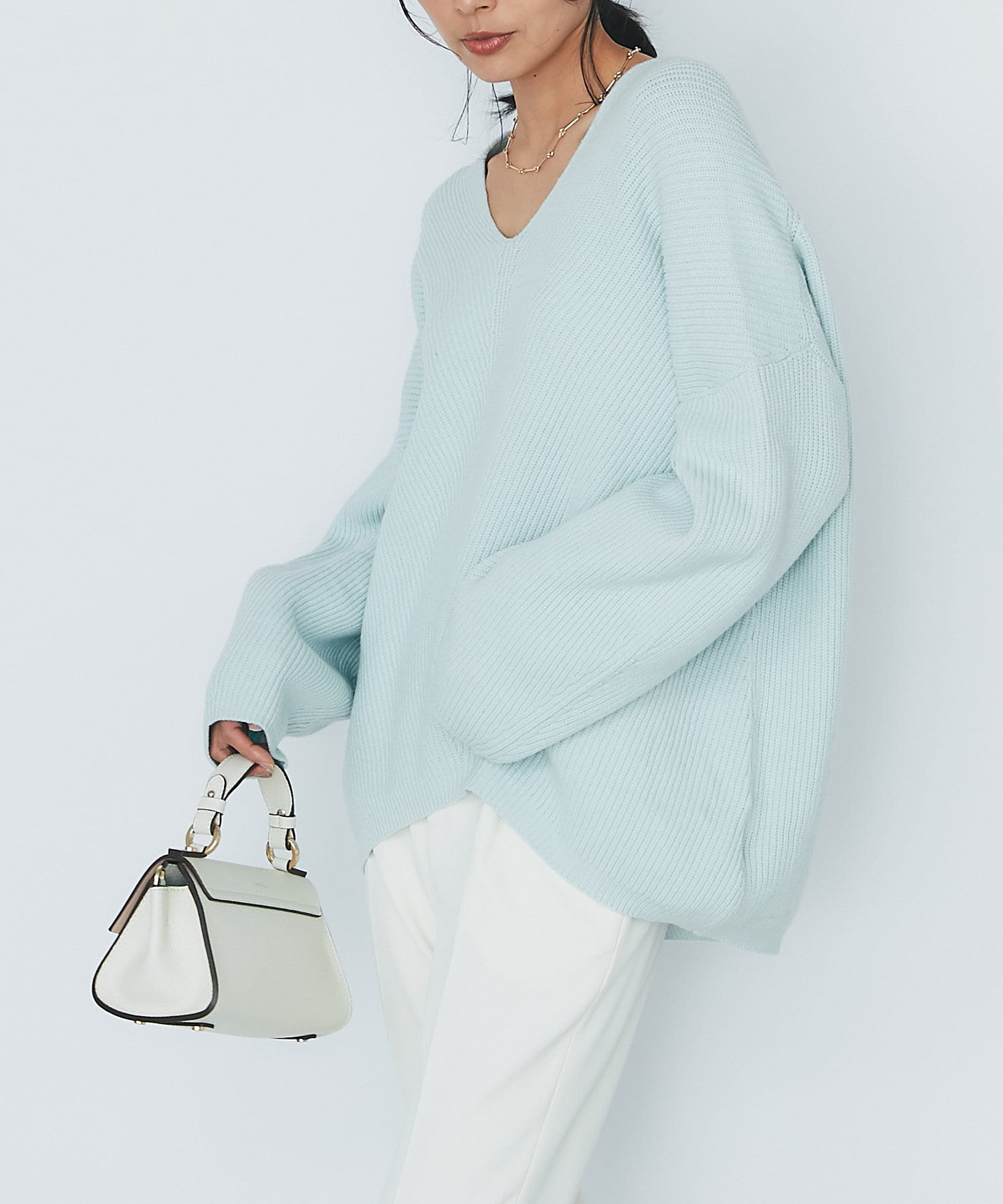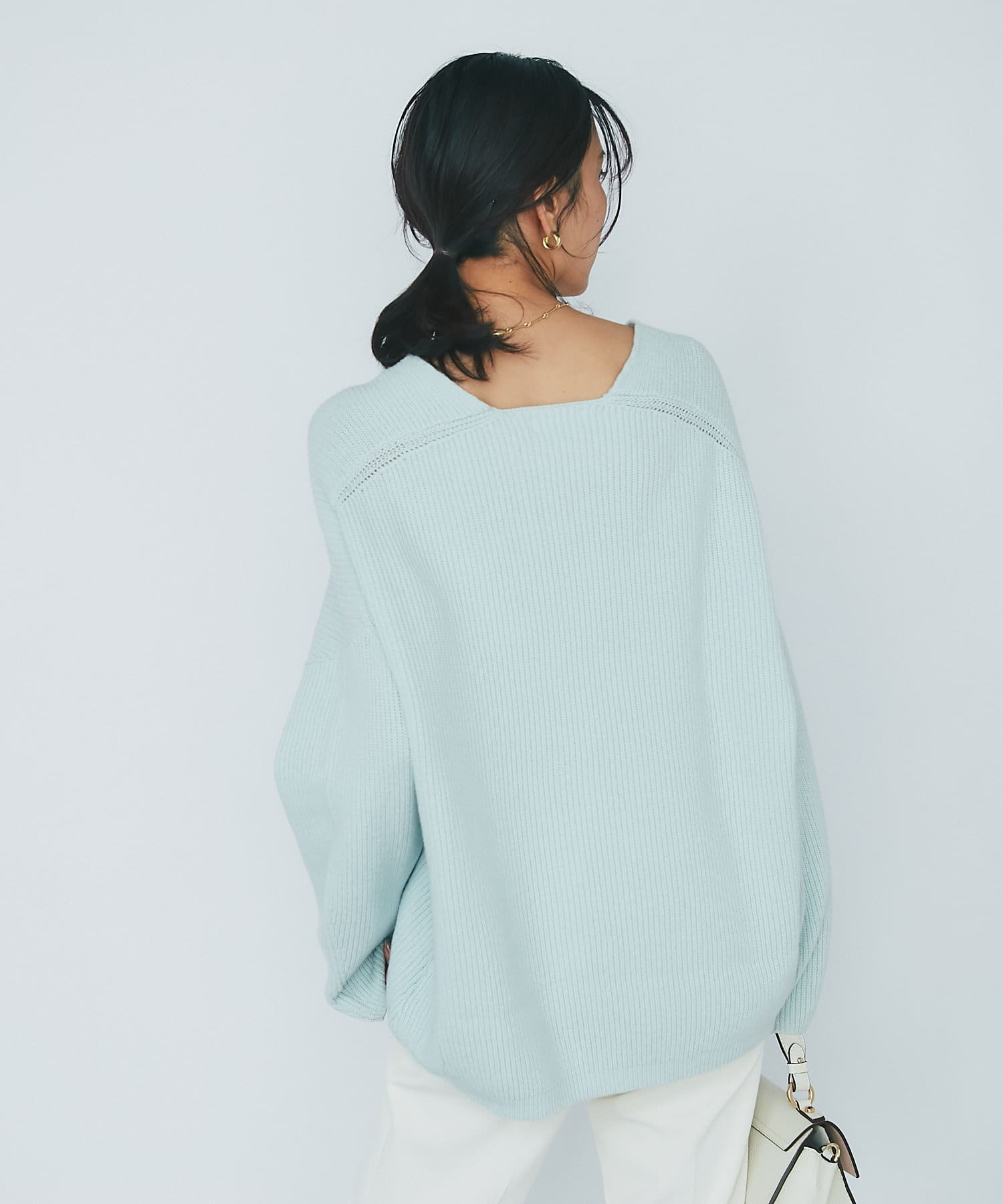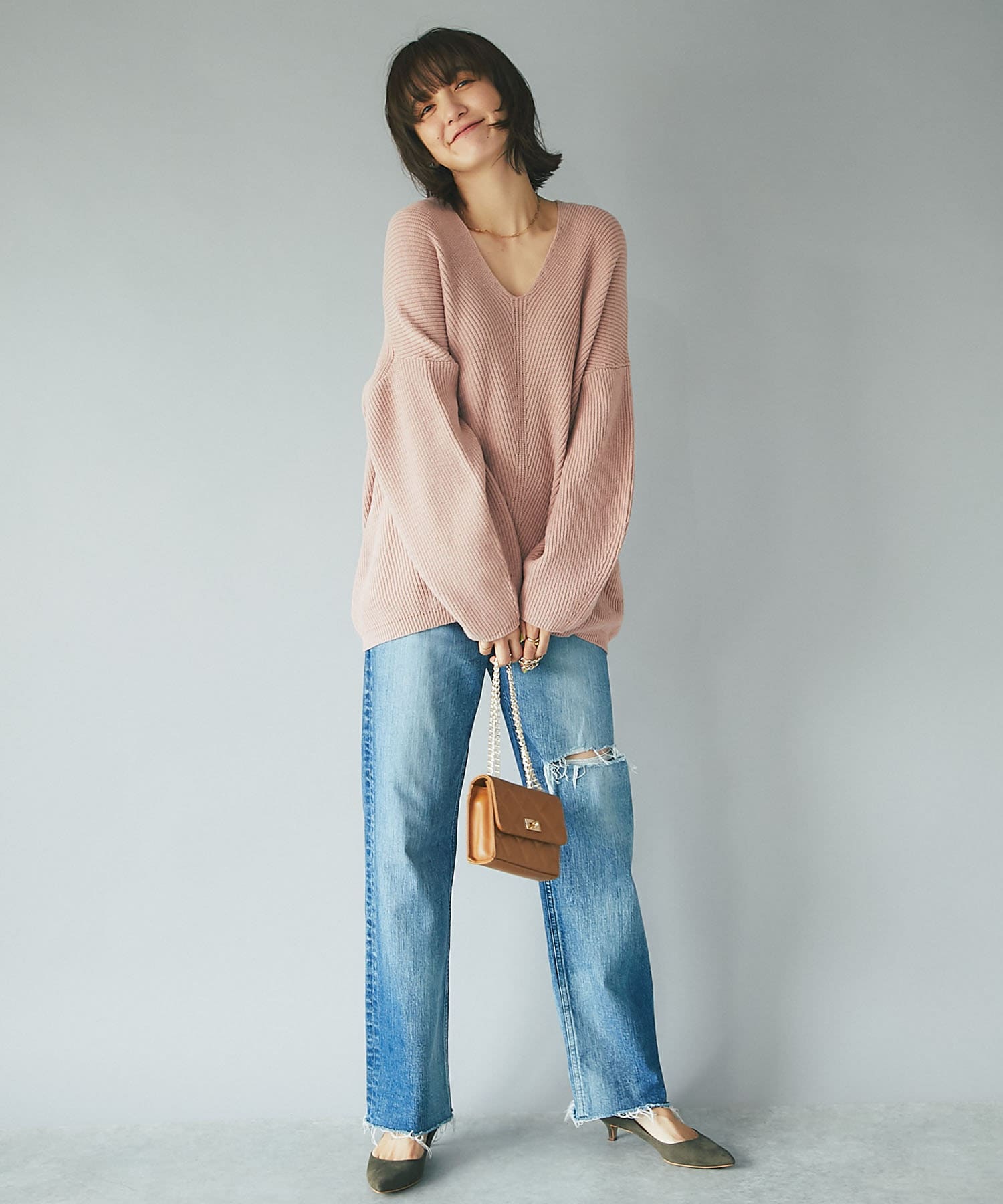ユルッとしたサイズ感と丸みを帯びた袖と裾のバルーンフォルムが女性らしいVネックプルオーバー。