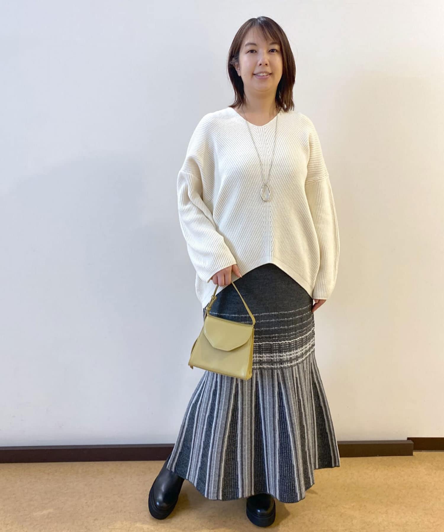 ⇒ウールの配合率が低い分、チクチク感は感じづらい素材感です。秋の初めからも着やすく、インナーやアウターの調整次第でロングシーズン着れるアイテムとなっております。ウールのチクチク感が苦手な方や暑がりさん、室内や車移動が多い方にもおすすめです。