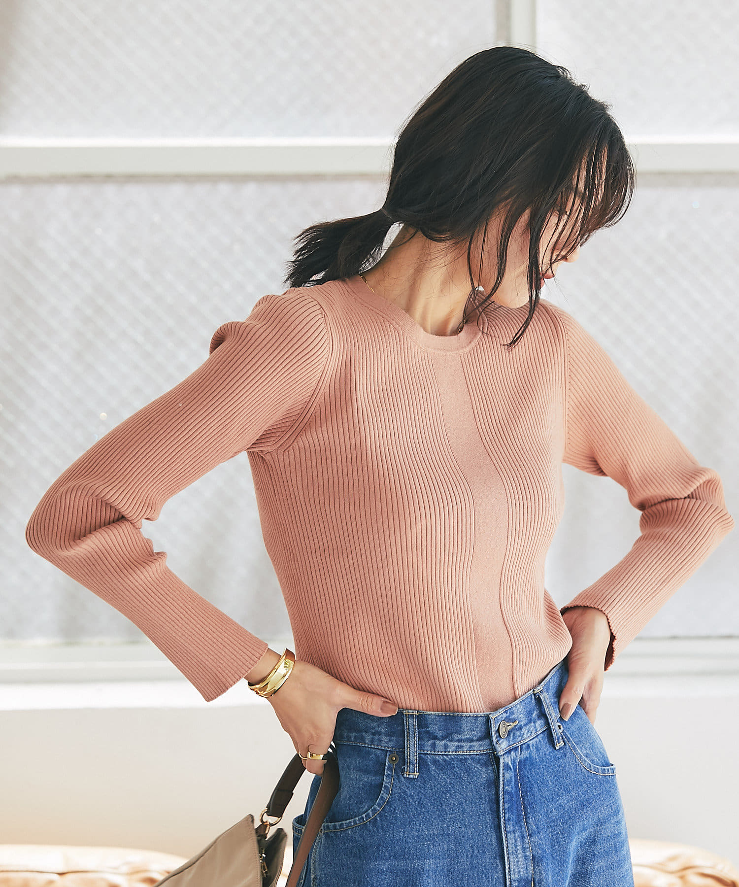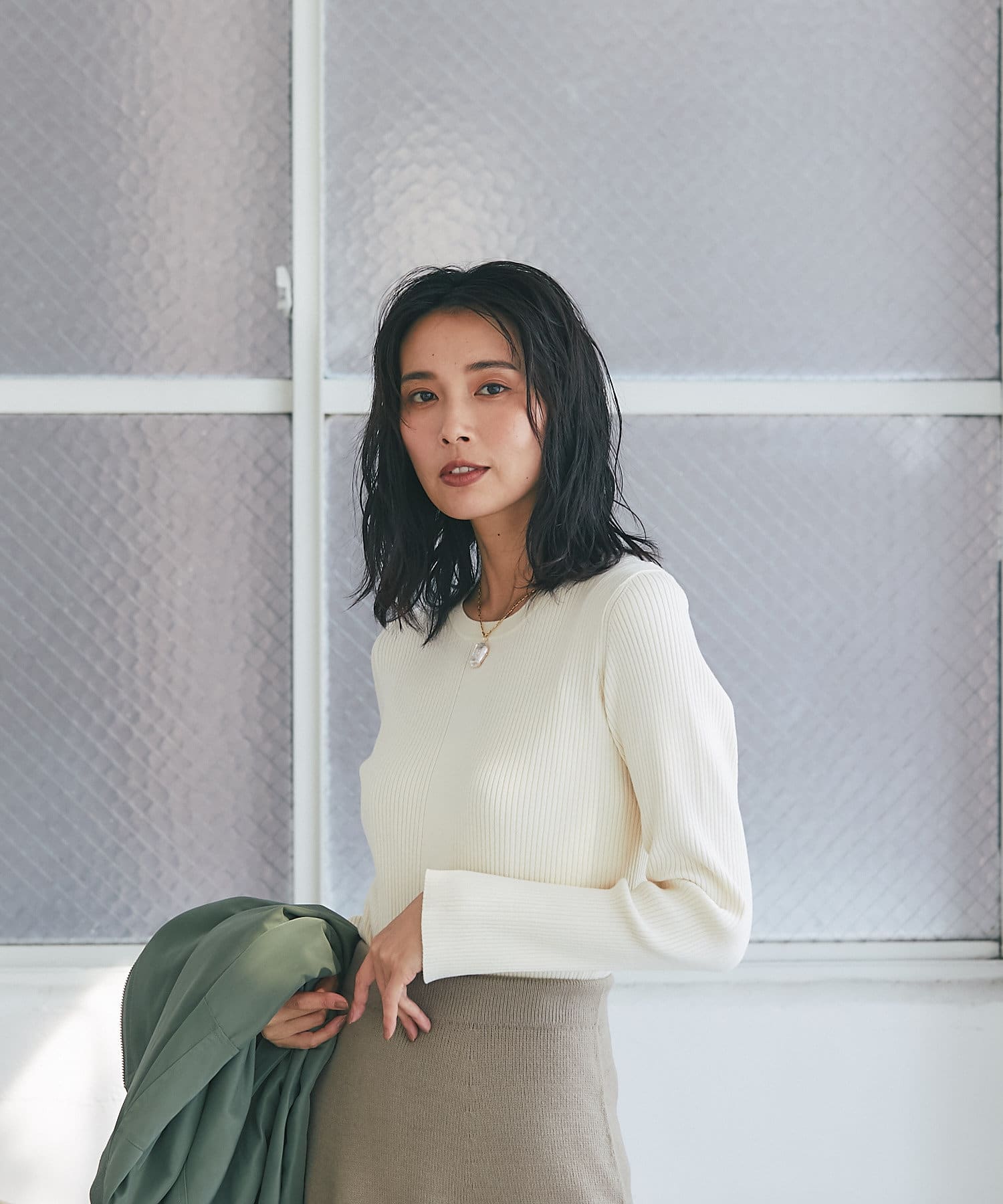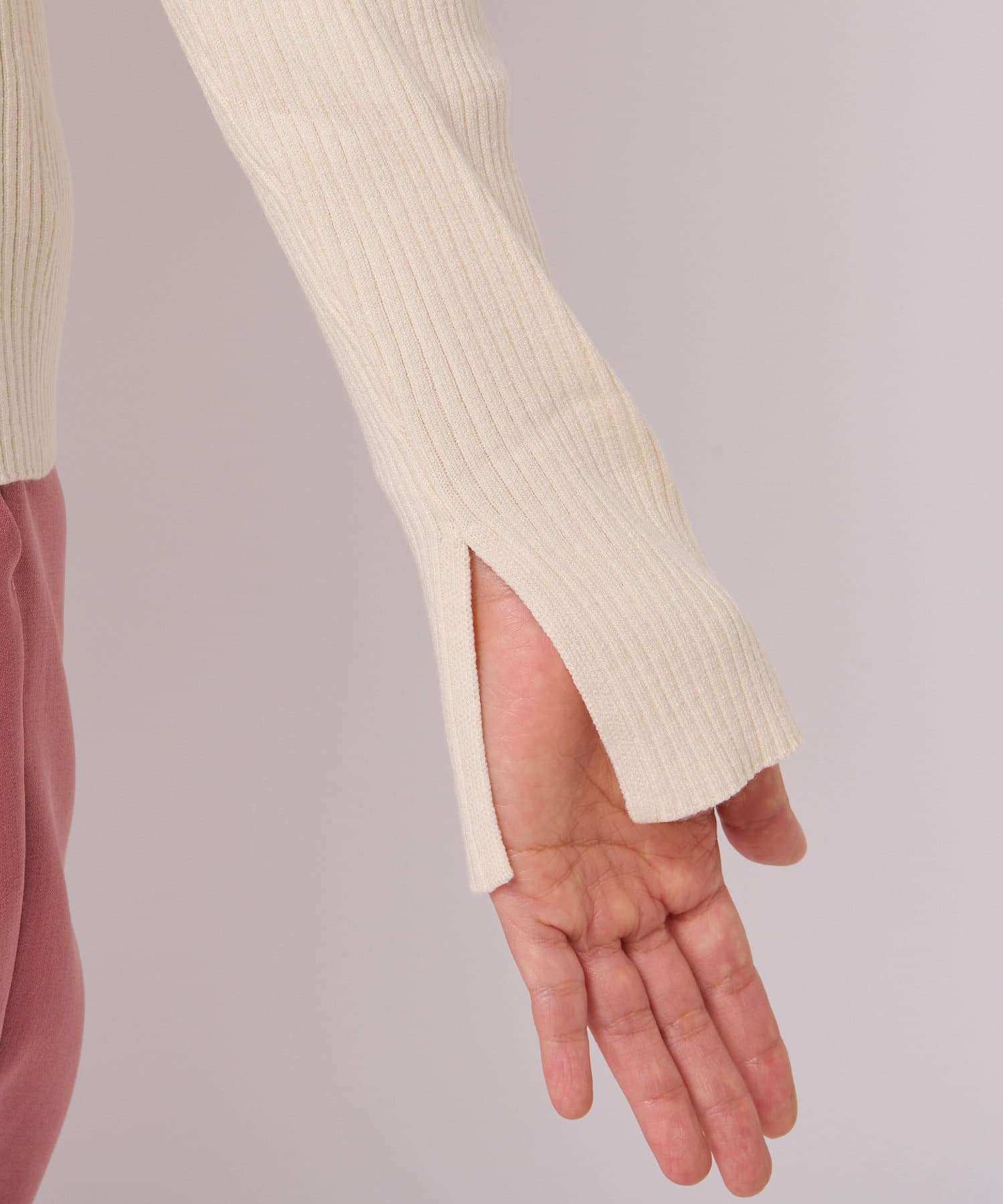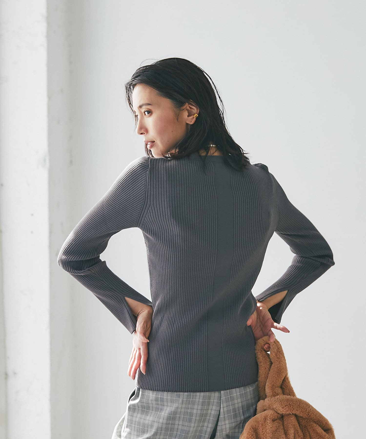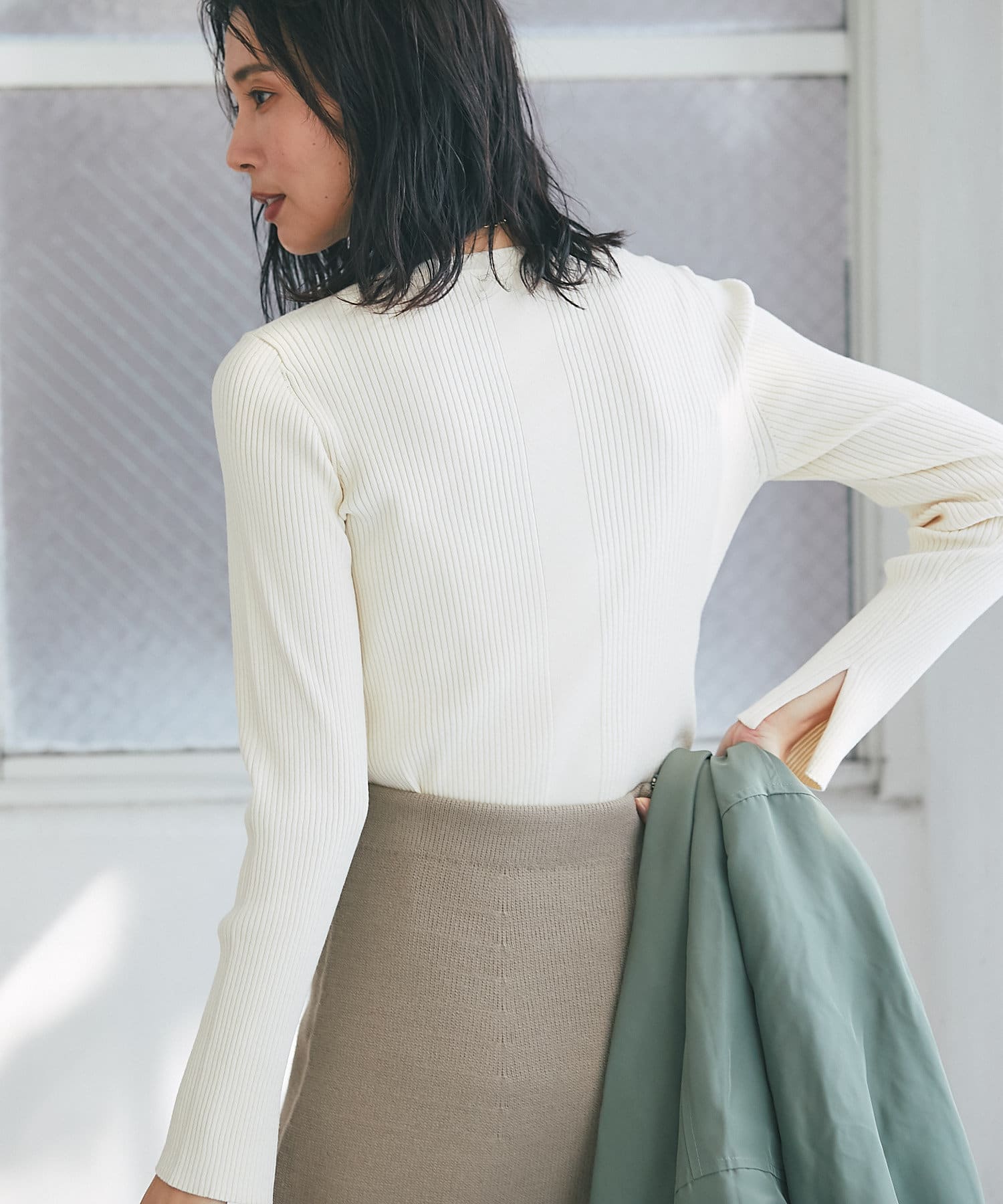 程よくフィットするサイズ感とセンターライン入りの編み地がボディラインをすっきり見せてくれるワイドリブニット。 やや長めの袖丈と袖口のスリットがフェミニンでこなれた着こなしを叶えます。