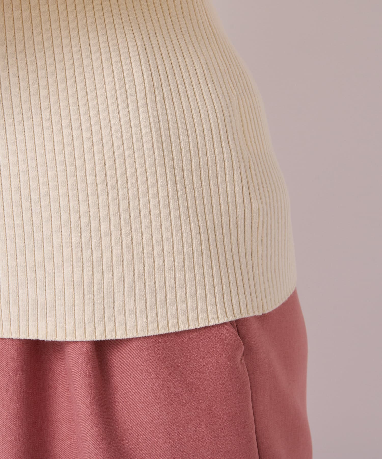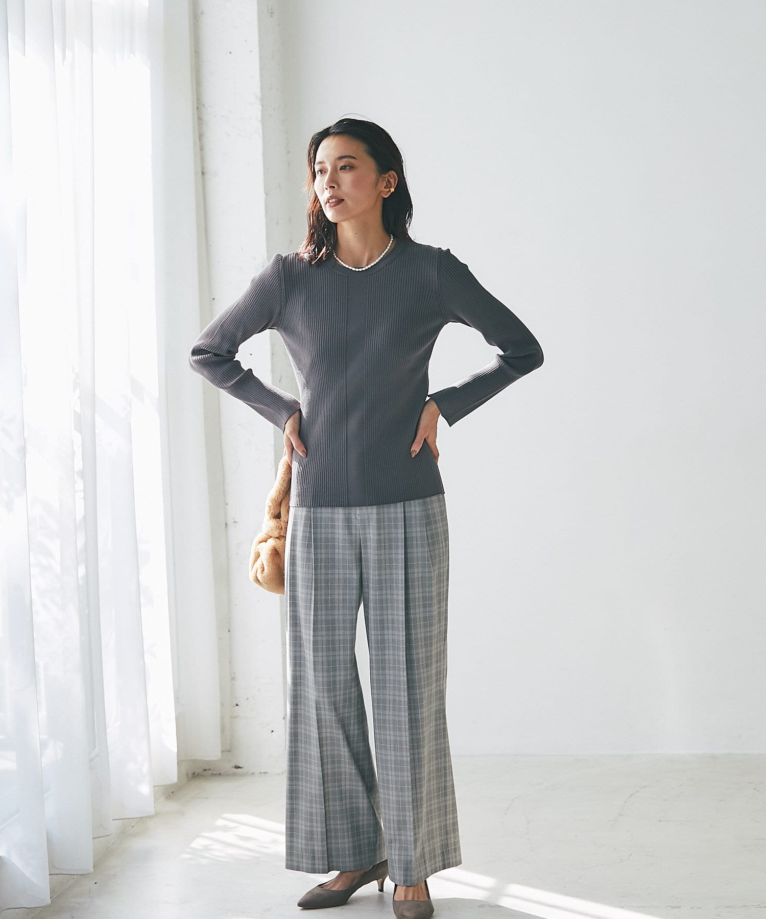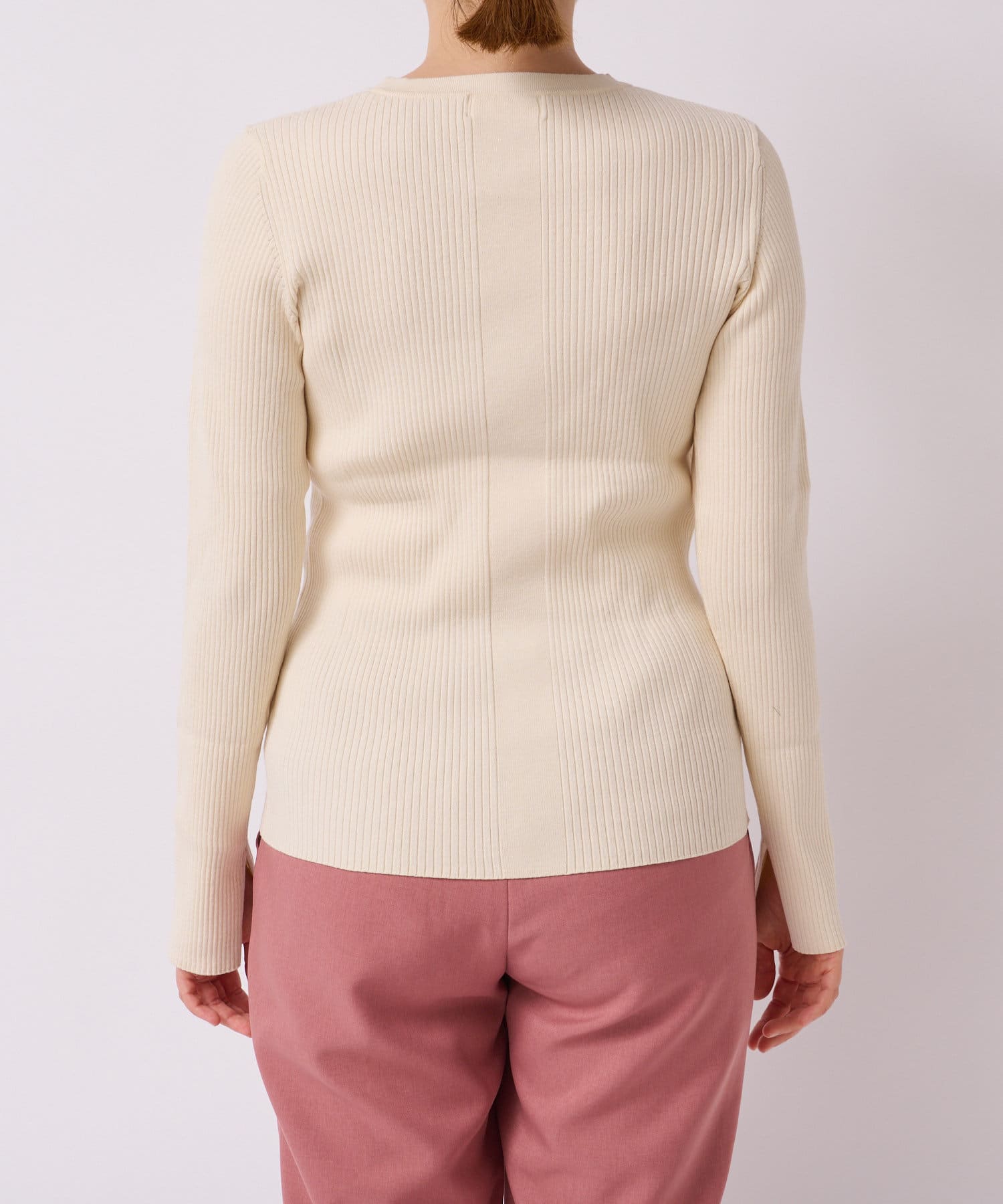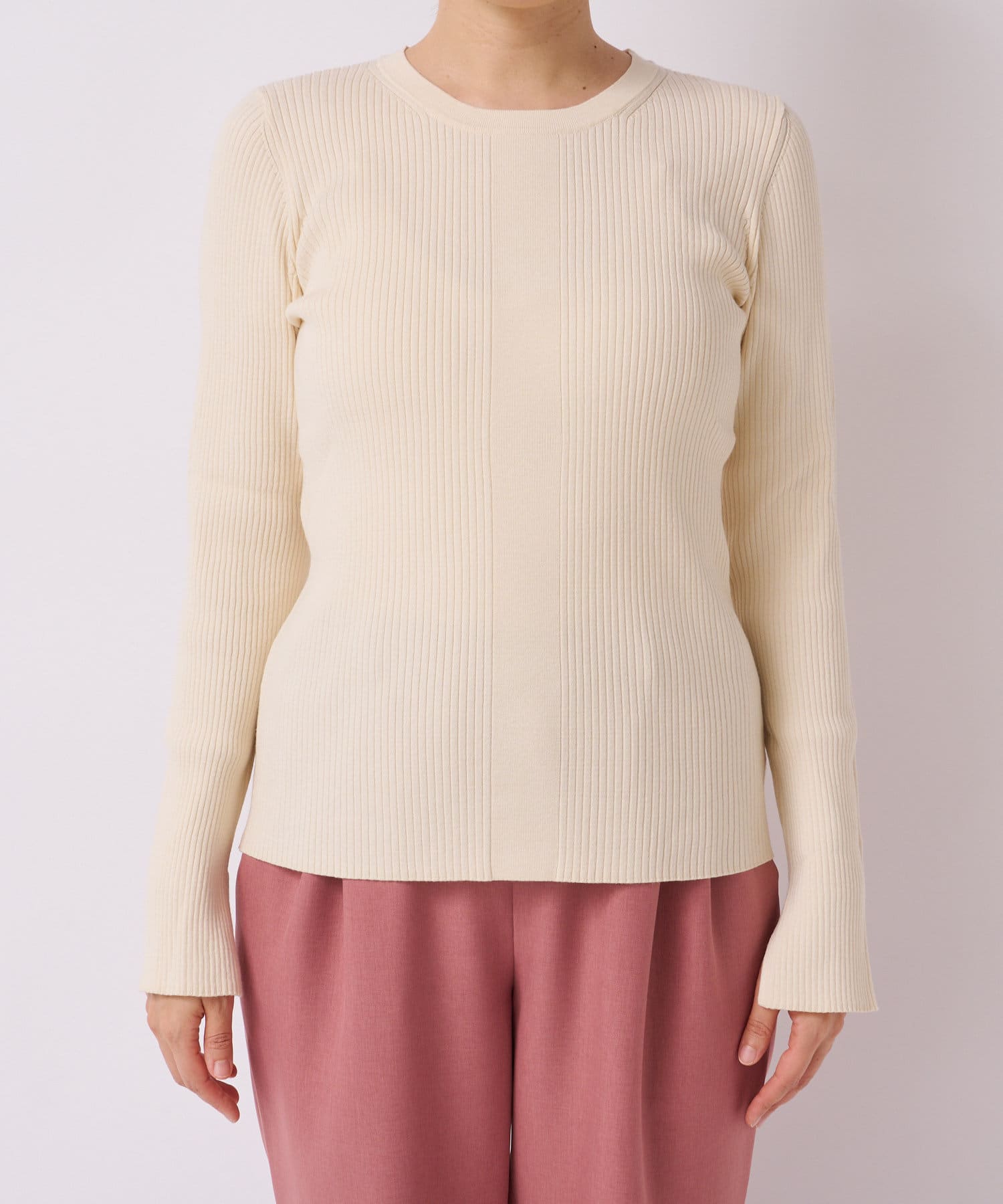 程よくフィットするサイズ感とセンターライン入りの編み地がボディラインをすっきり見せてくれるワイドリブニット。 やや長めの袖丈と袖口のスリットがフェミニンでこなれた着こなしを叶えます。