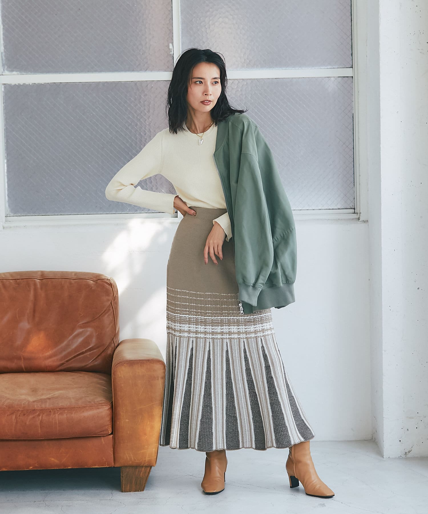 レディライクな着こなしにぴったりのニットなので、レーススカートなどで上品にまとめるとオフィスやお出かけスタイルにもぴったりなコーディネートに仕上がります。