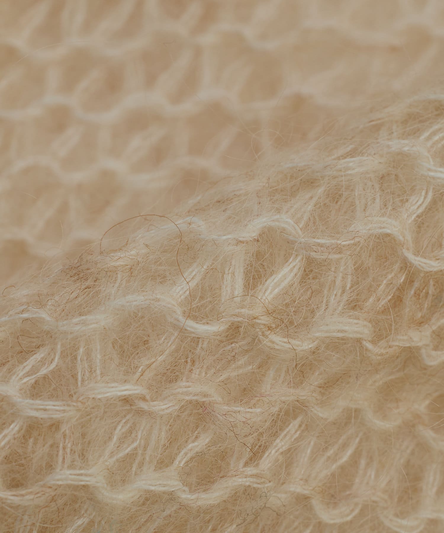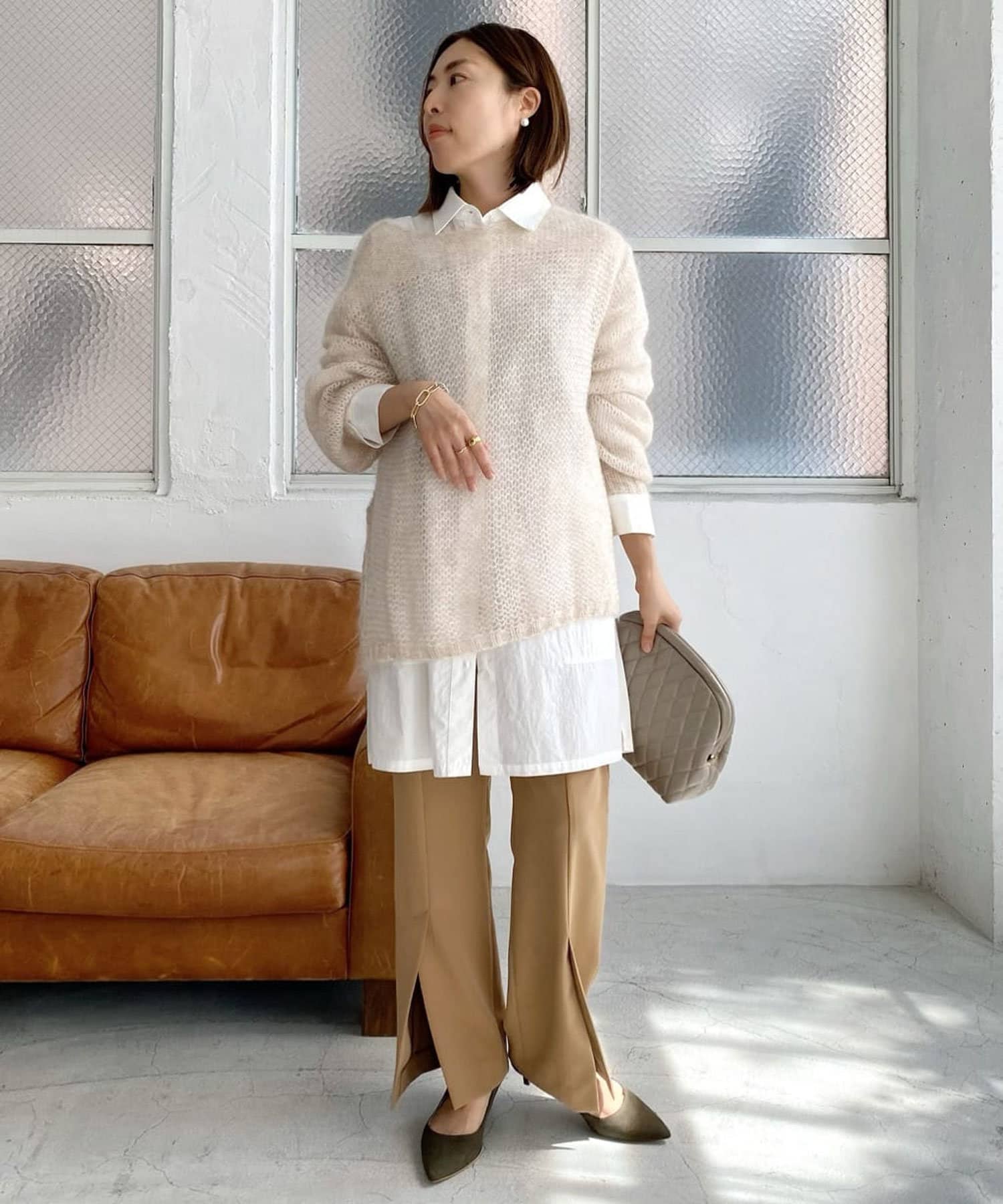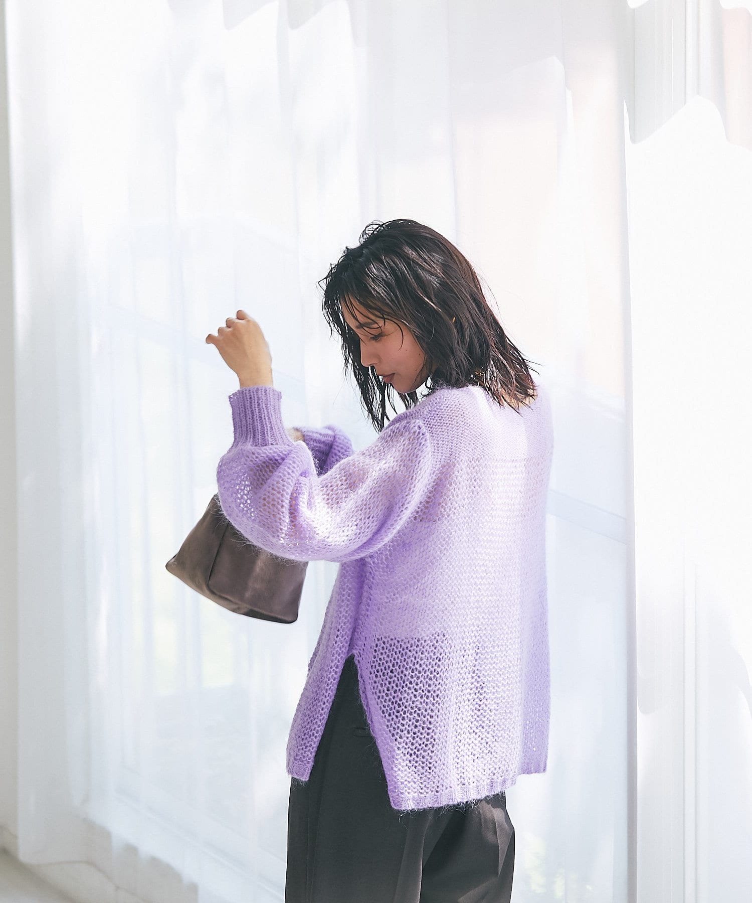 モヘヤの起毛感とトレンド感のあるのレイヤードスタイルも簡単に決まる一枚です。
