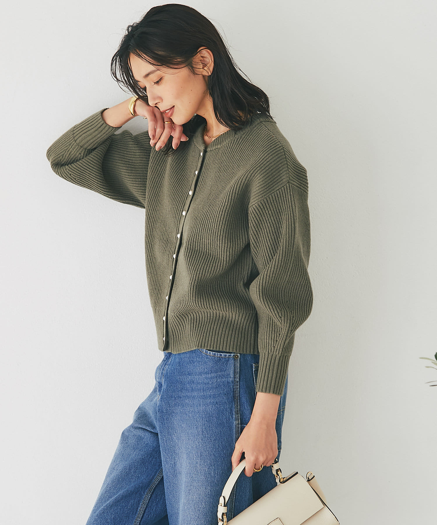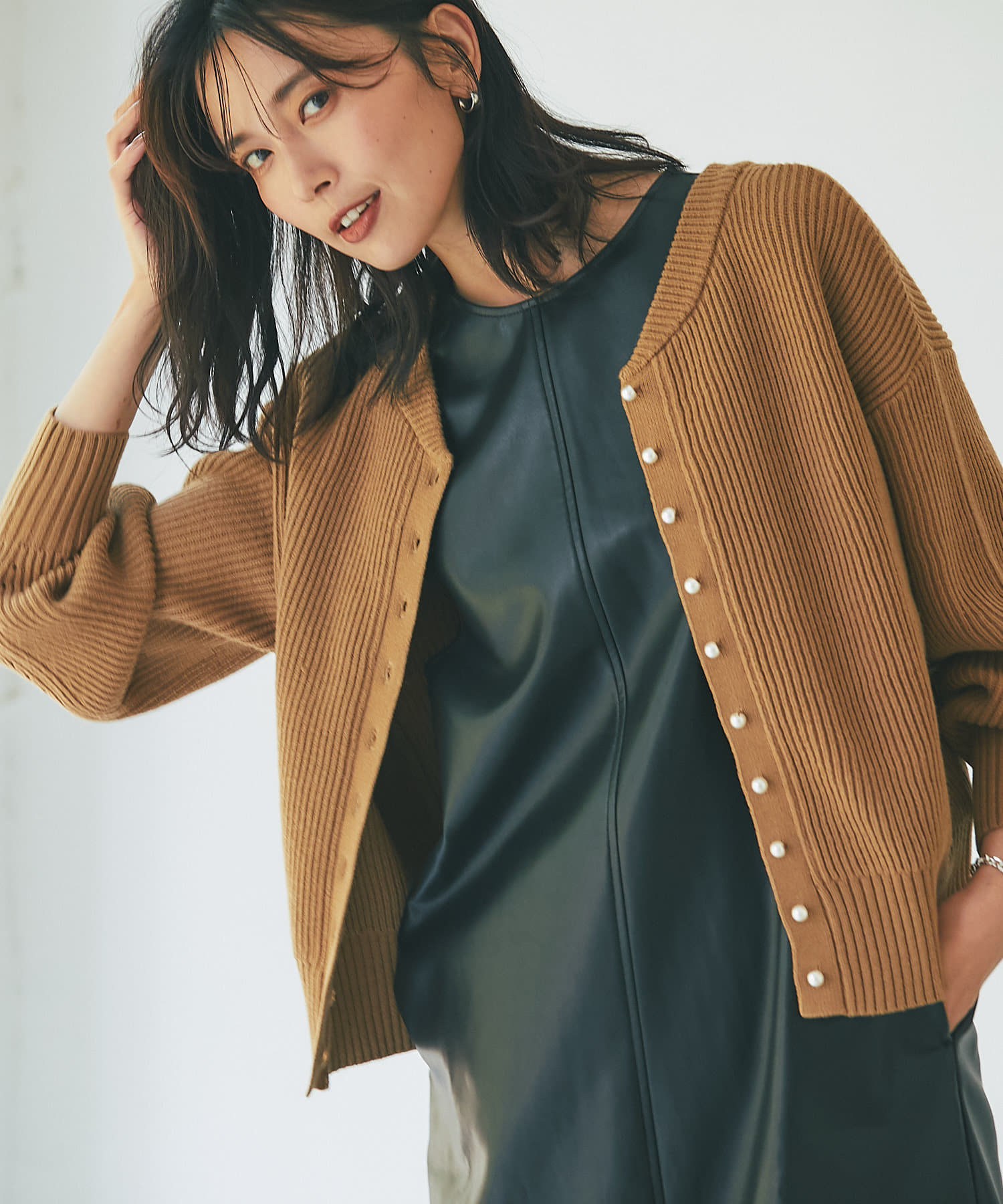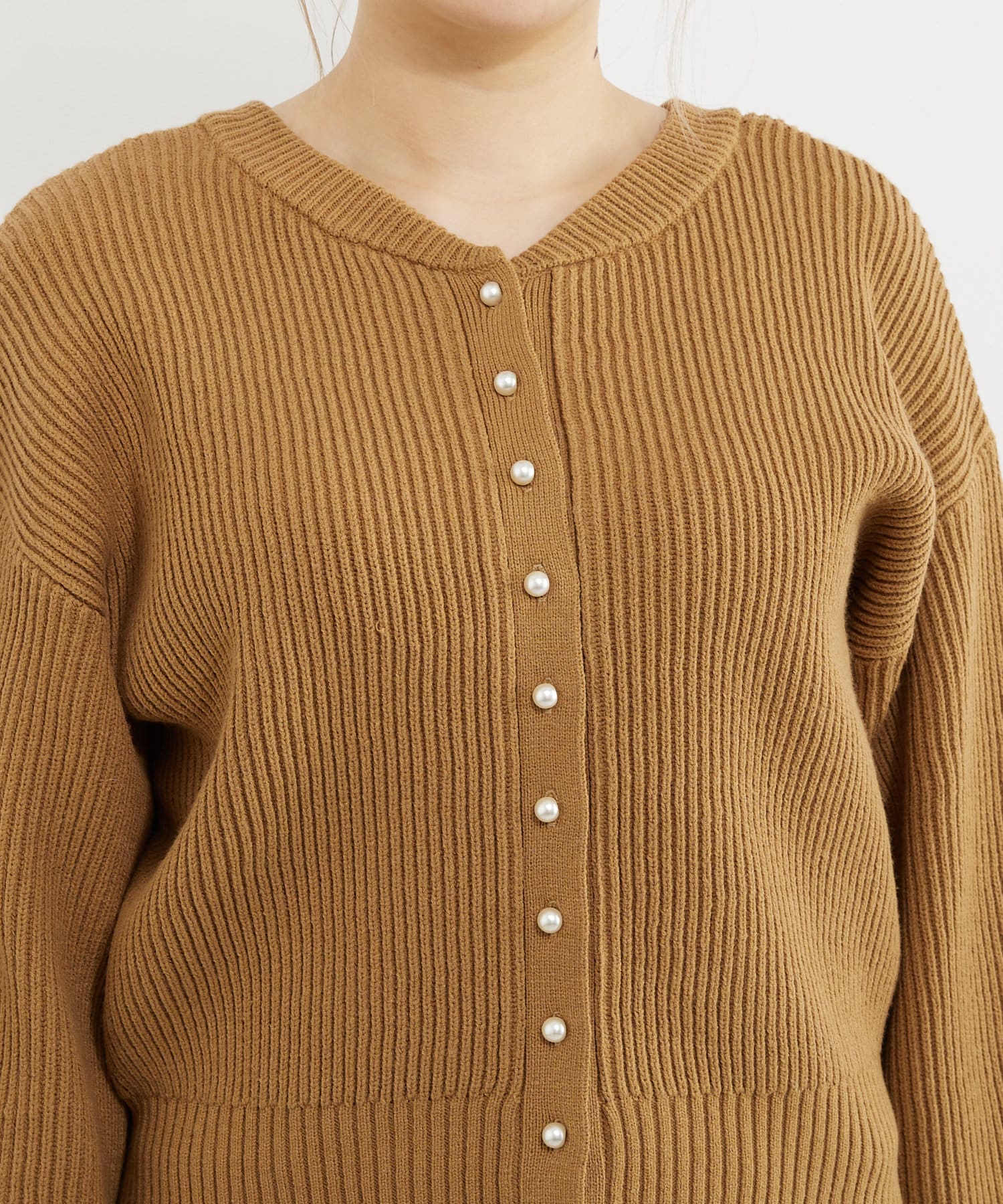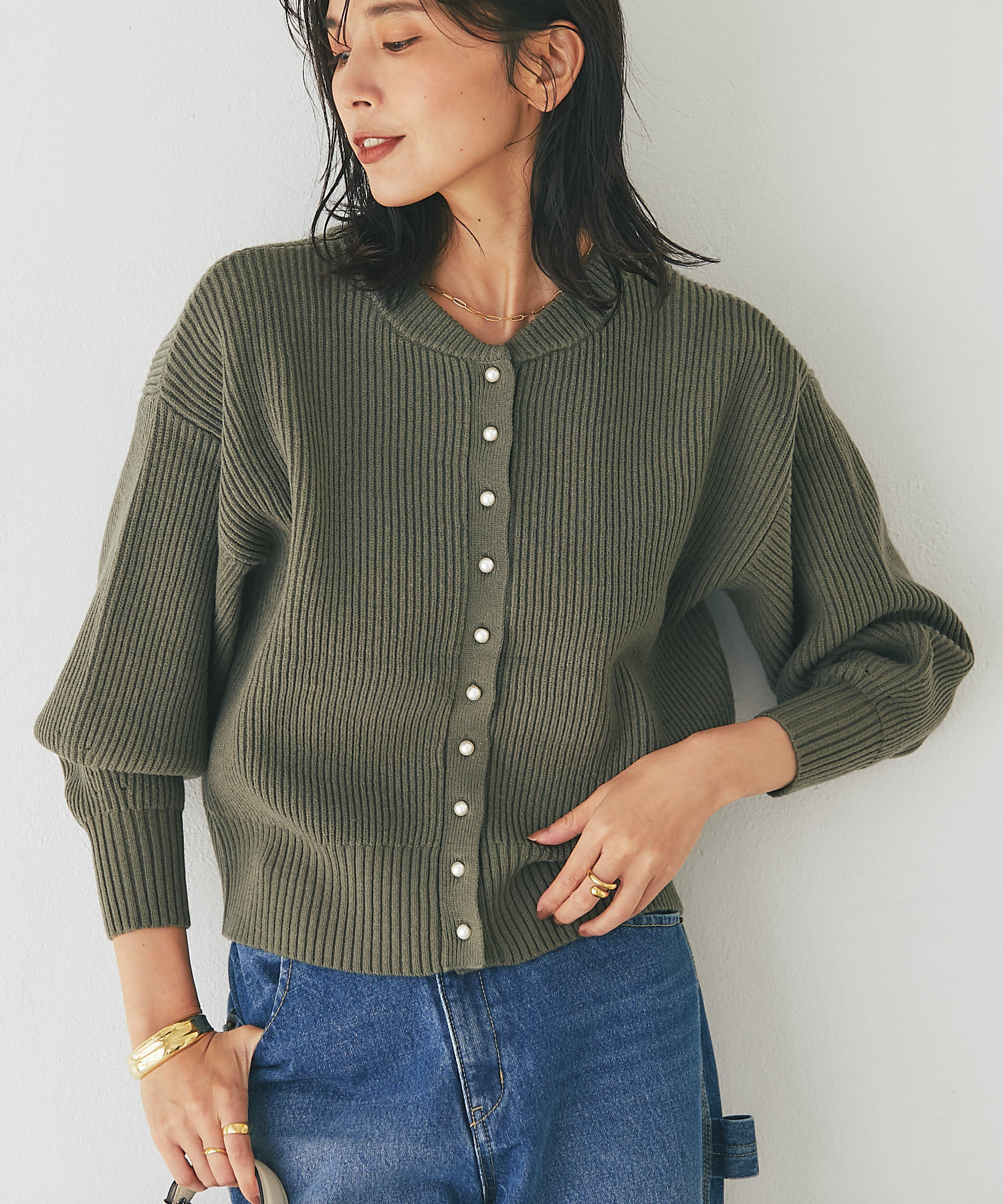 パールボタンがクラシカルな印象のニットカーディガン