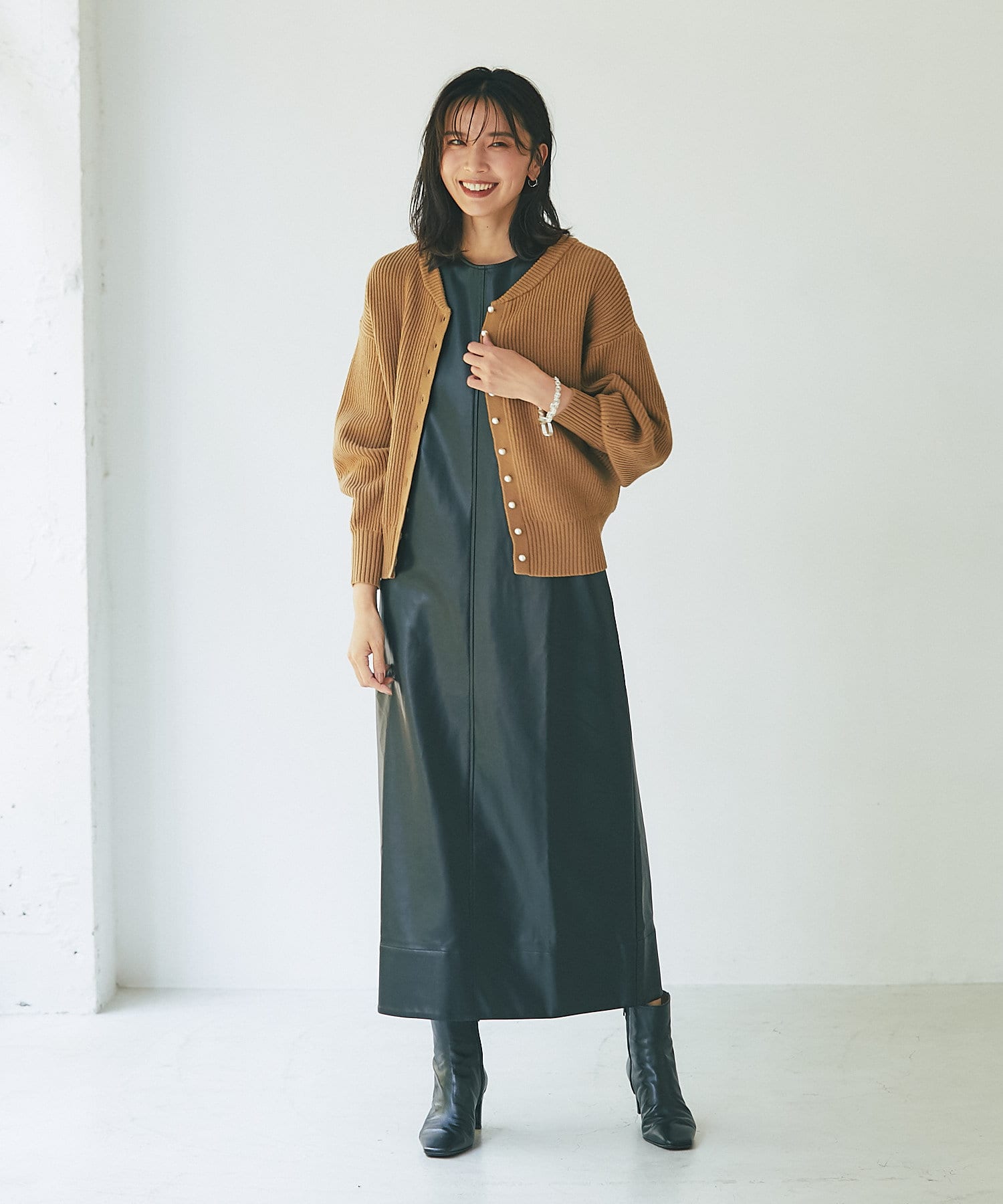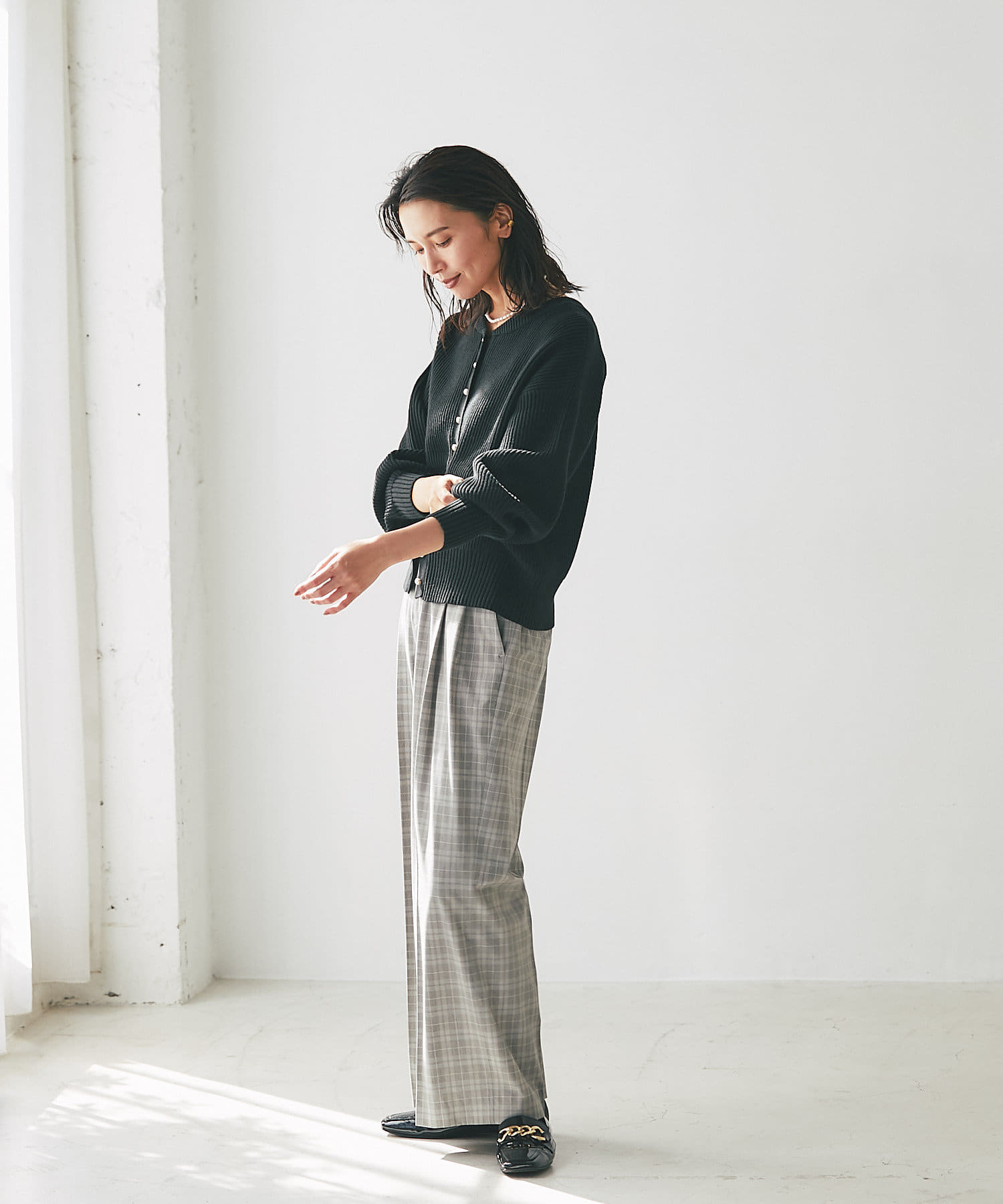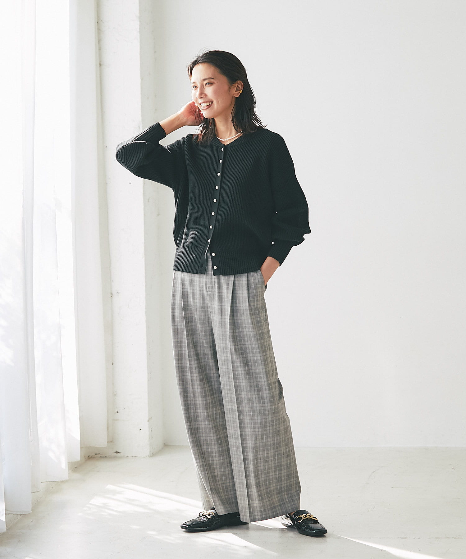 パールボタンがクラシカルな印象のニットカーディガン