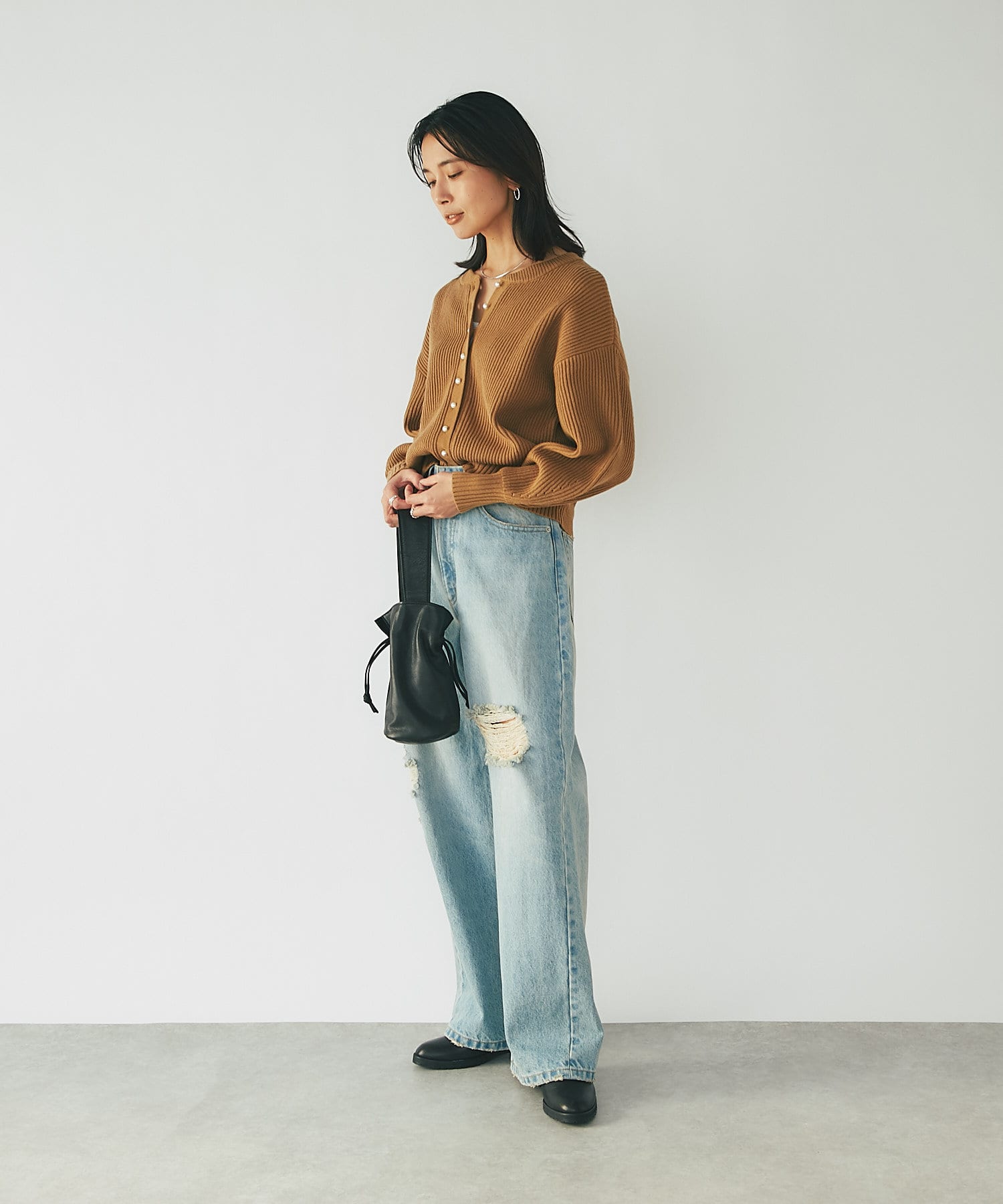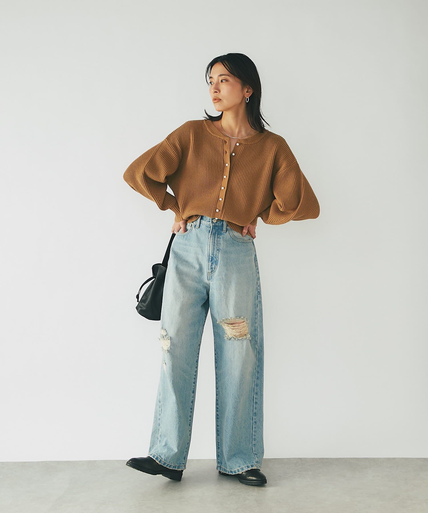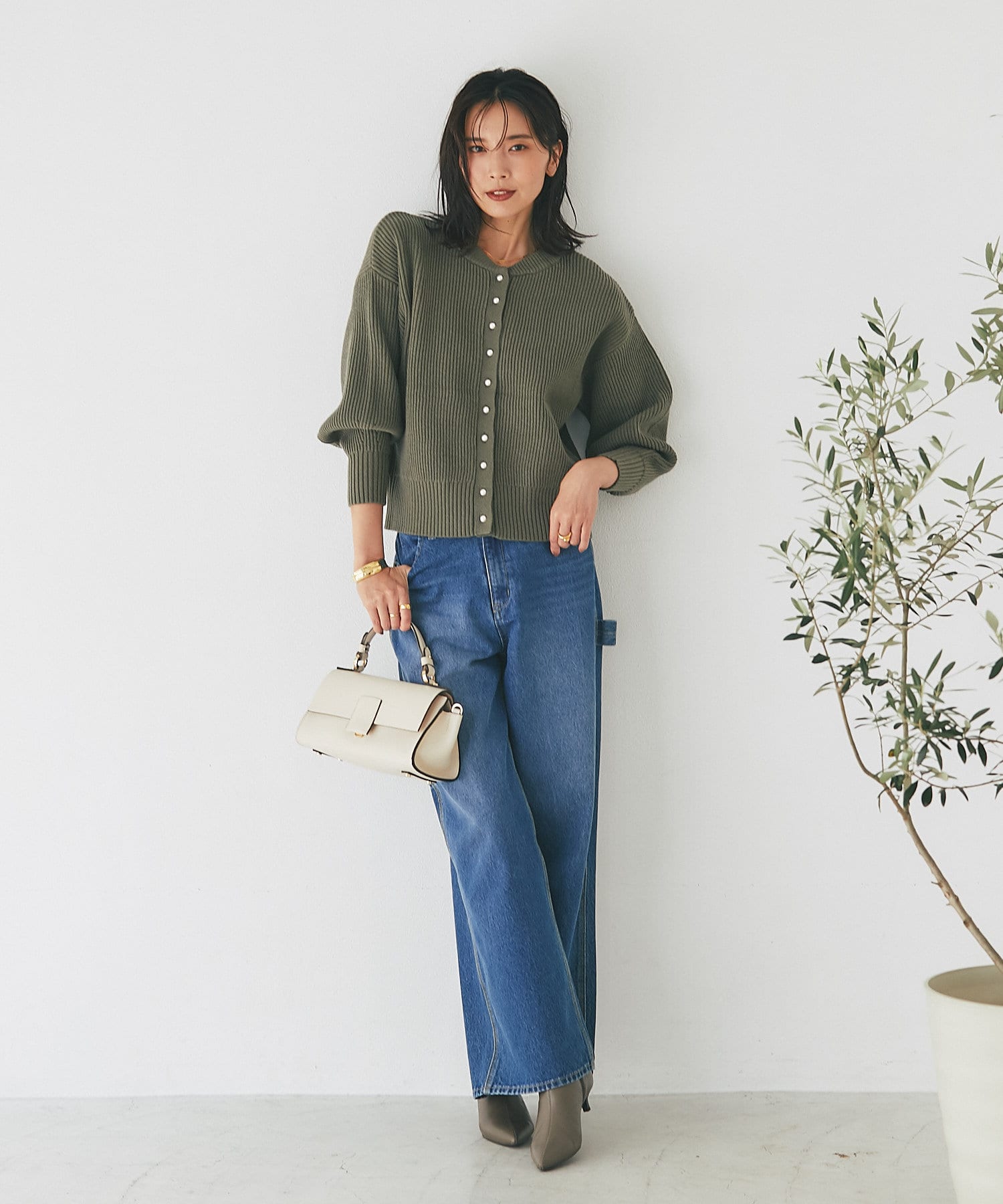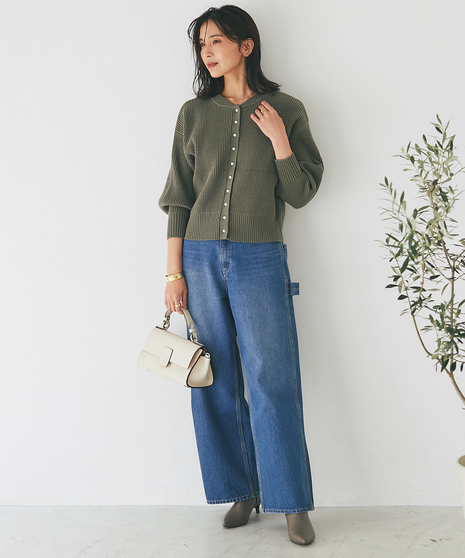 パールボタンがクラシカルな印象のニットカーディガン
