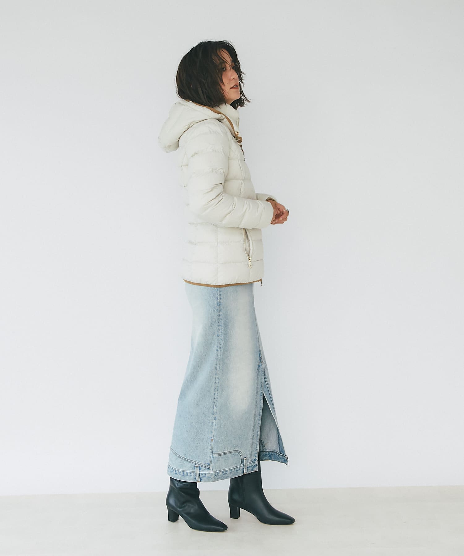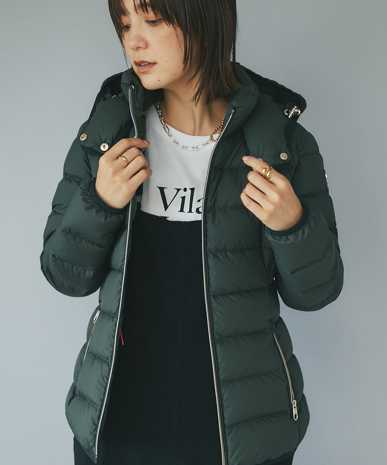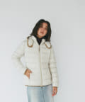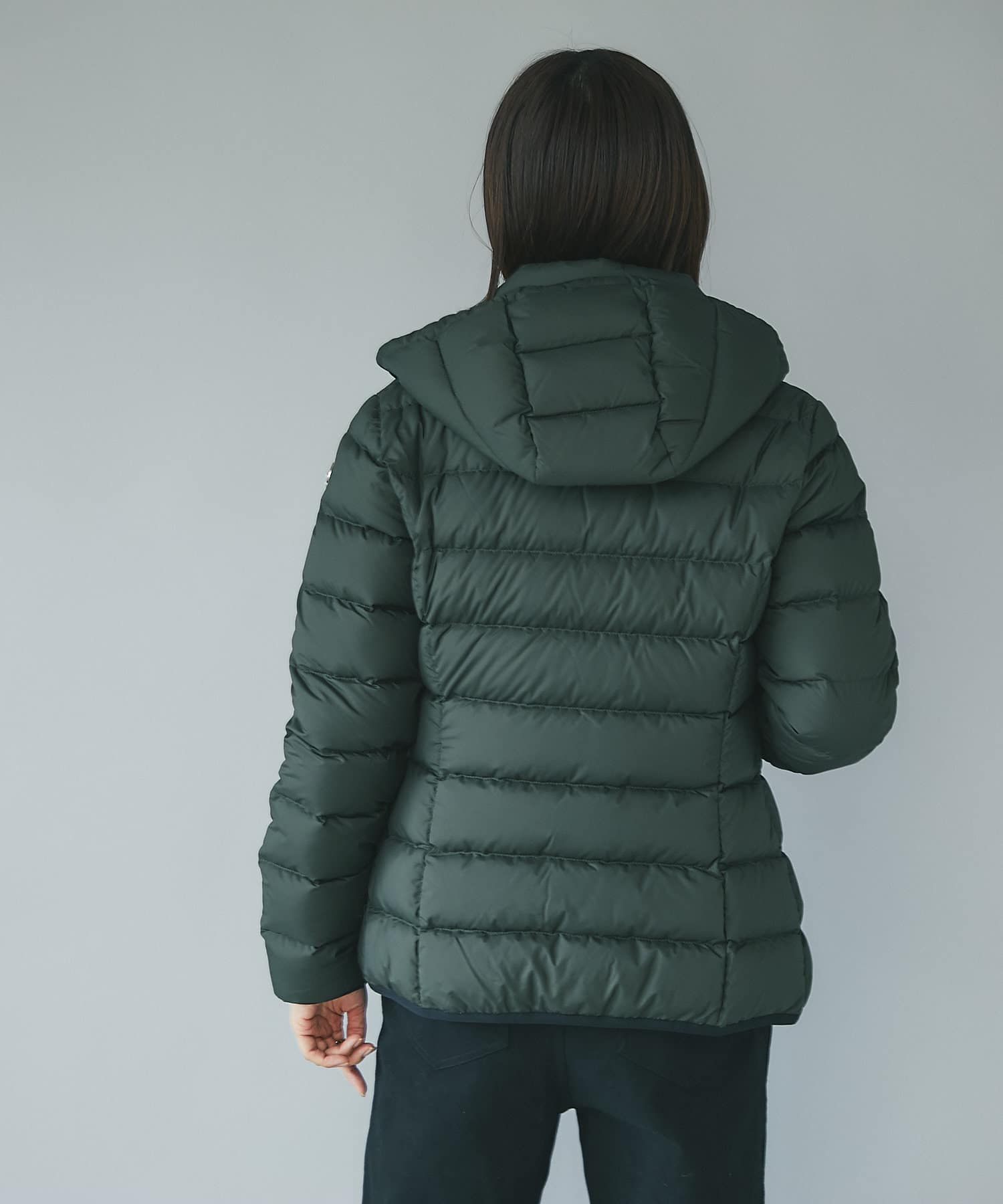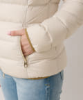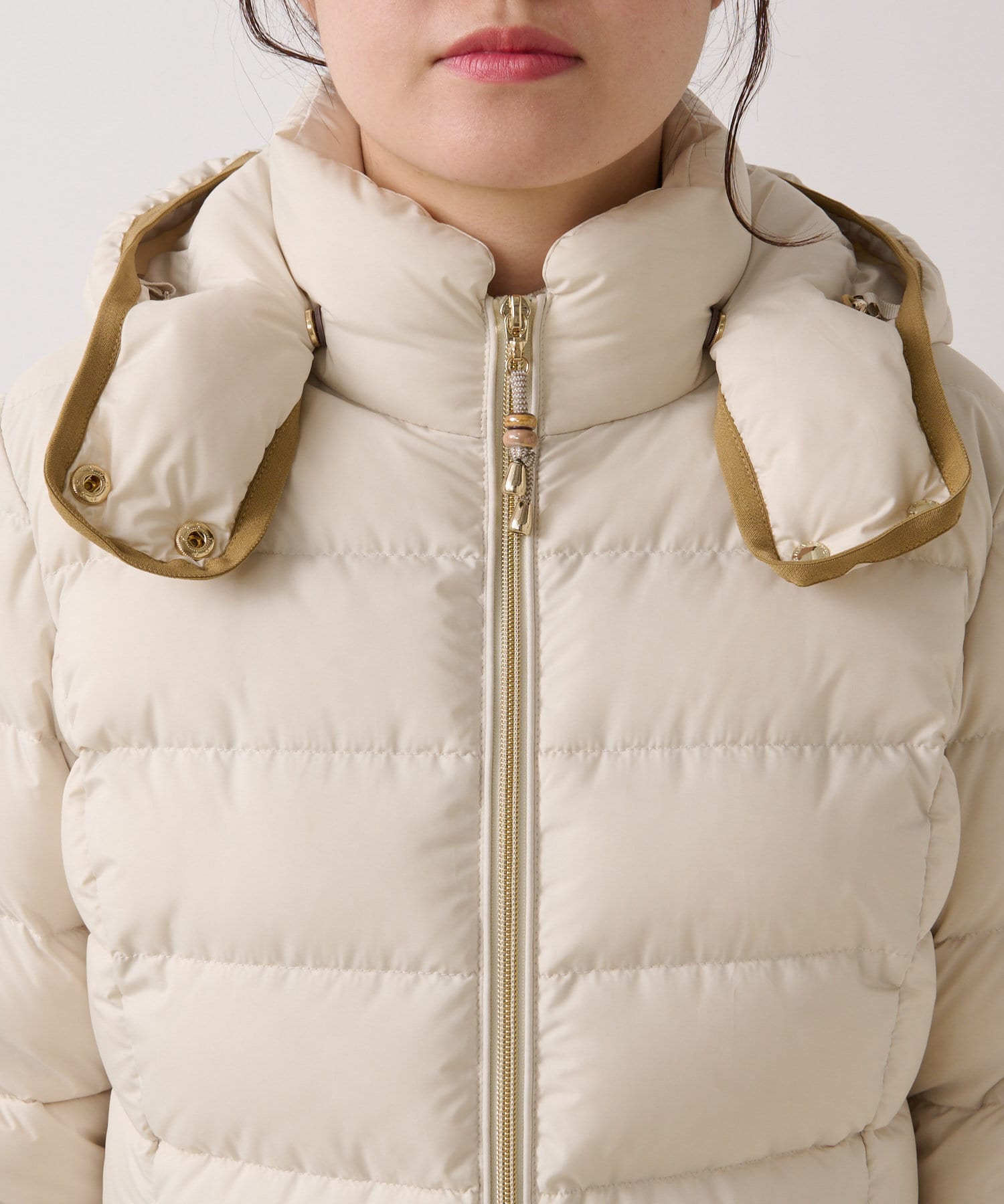 -10℃対応(ダウン800フィルパワー)。スタンドカラー(着脱式)で首まわりも防寒できます。フードは取り外し可。