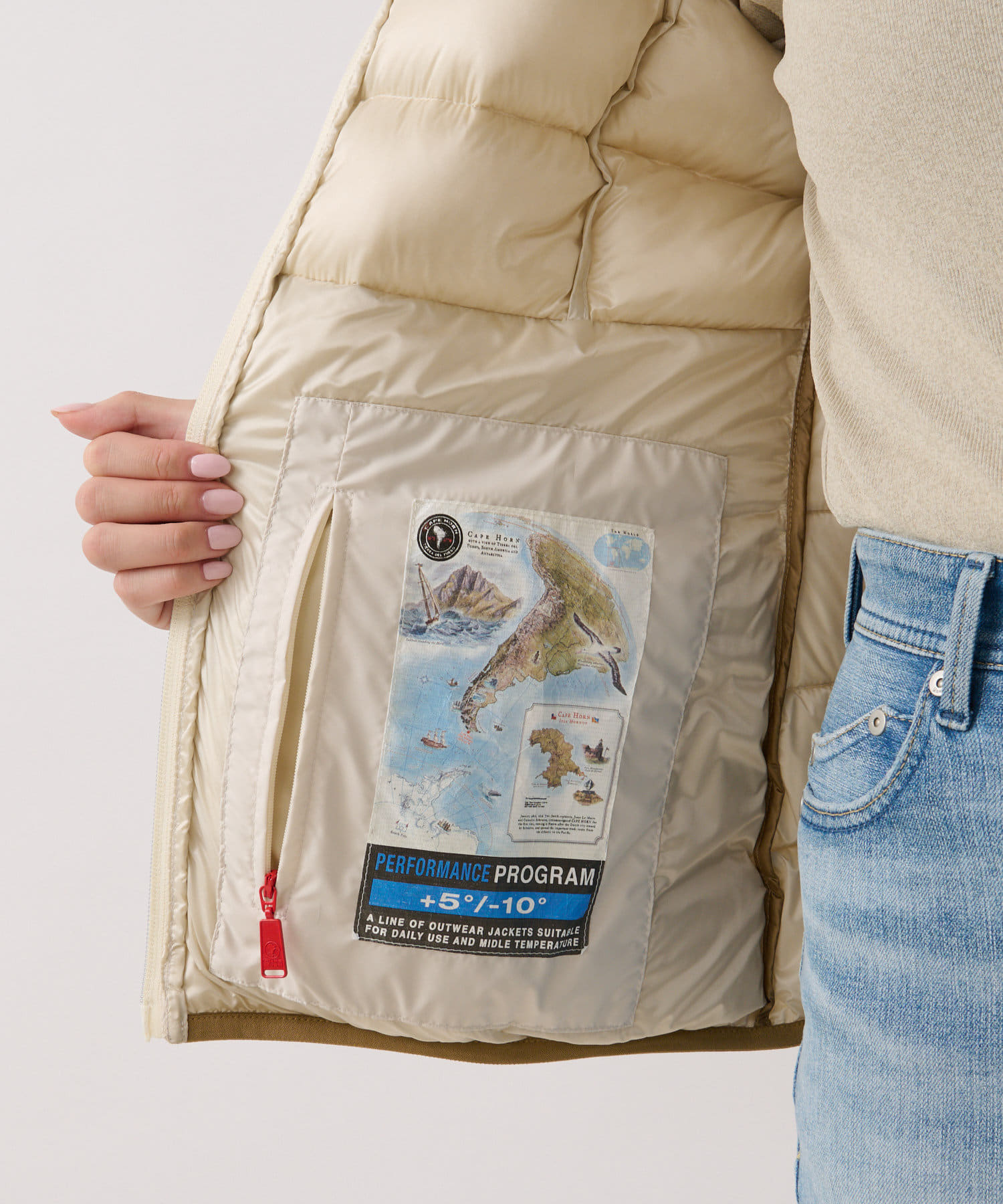 ポケット裏地スーパーマイクロファイバー仕様。袖口からの空気の侵入を防ぐテーピング仕様。