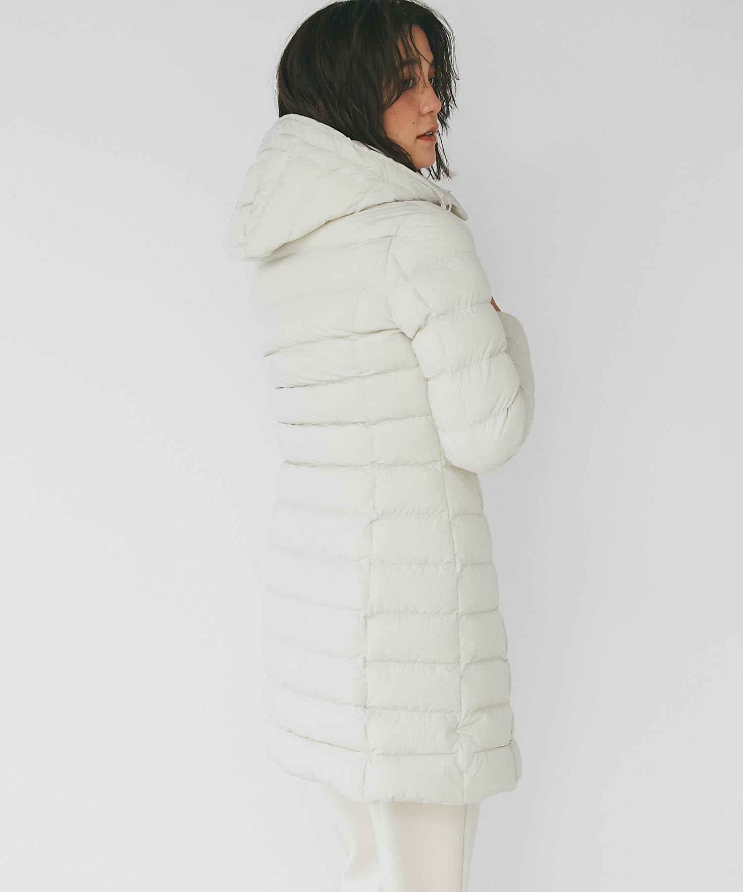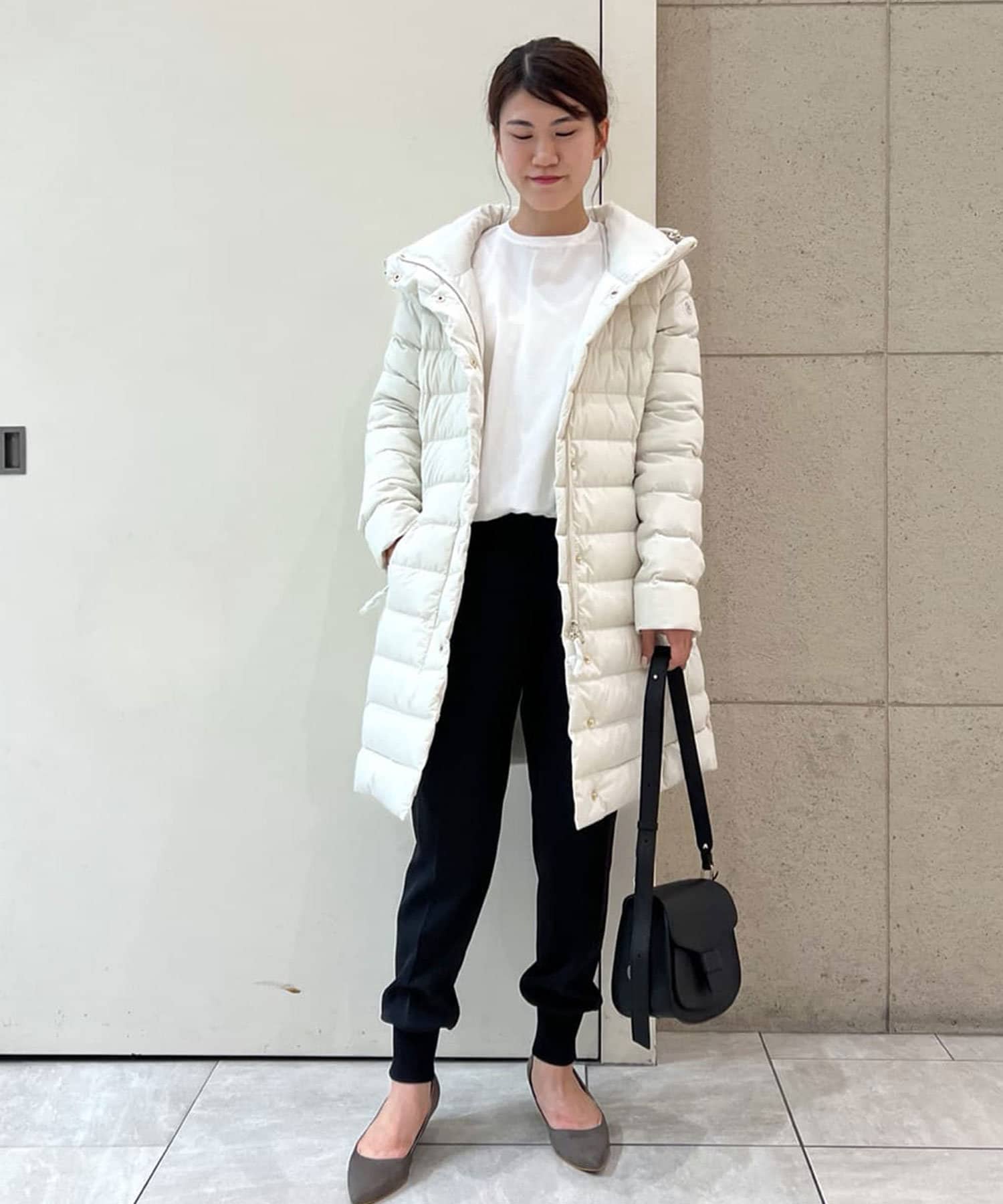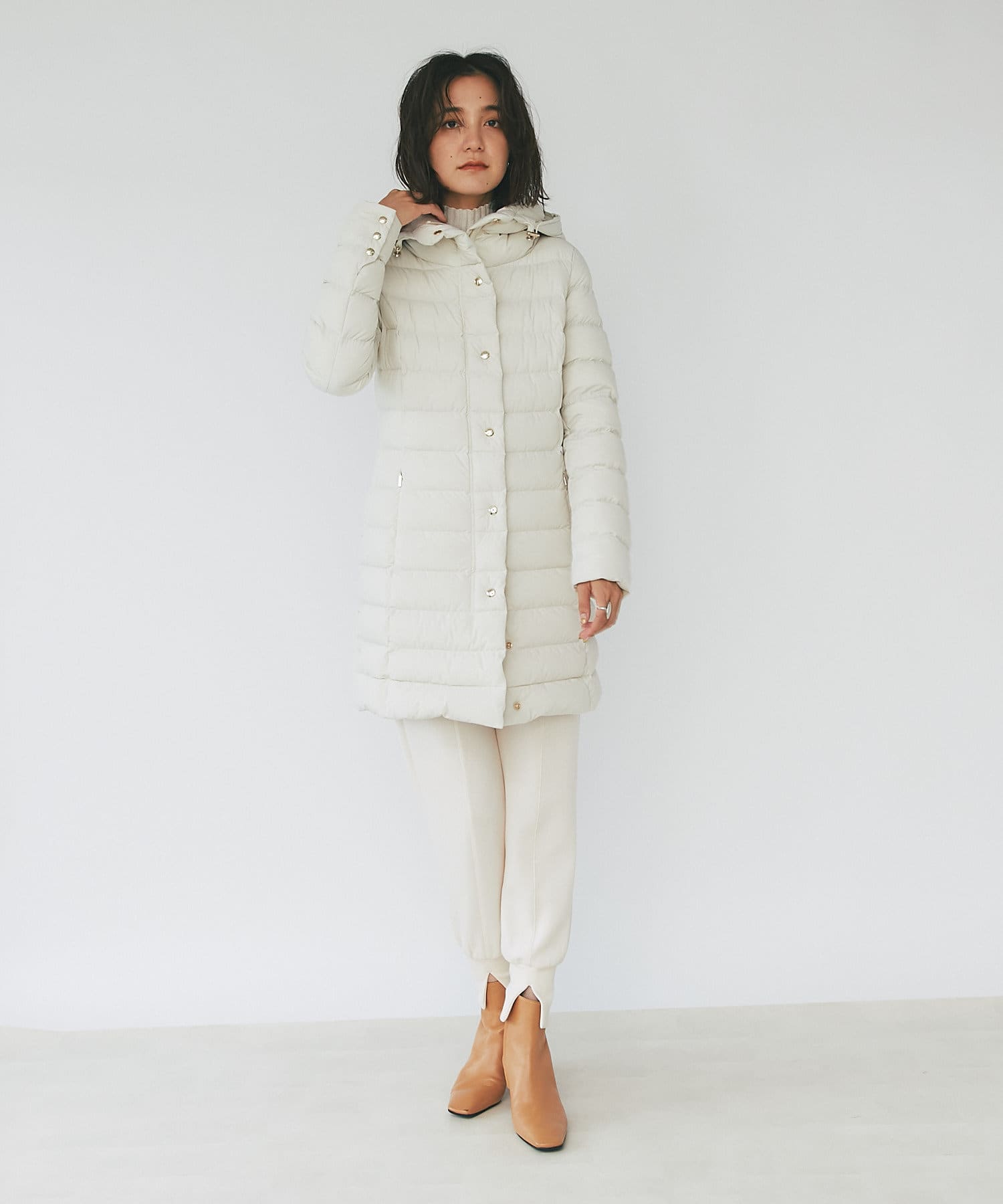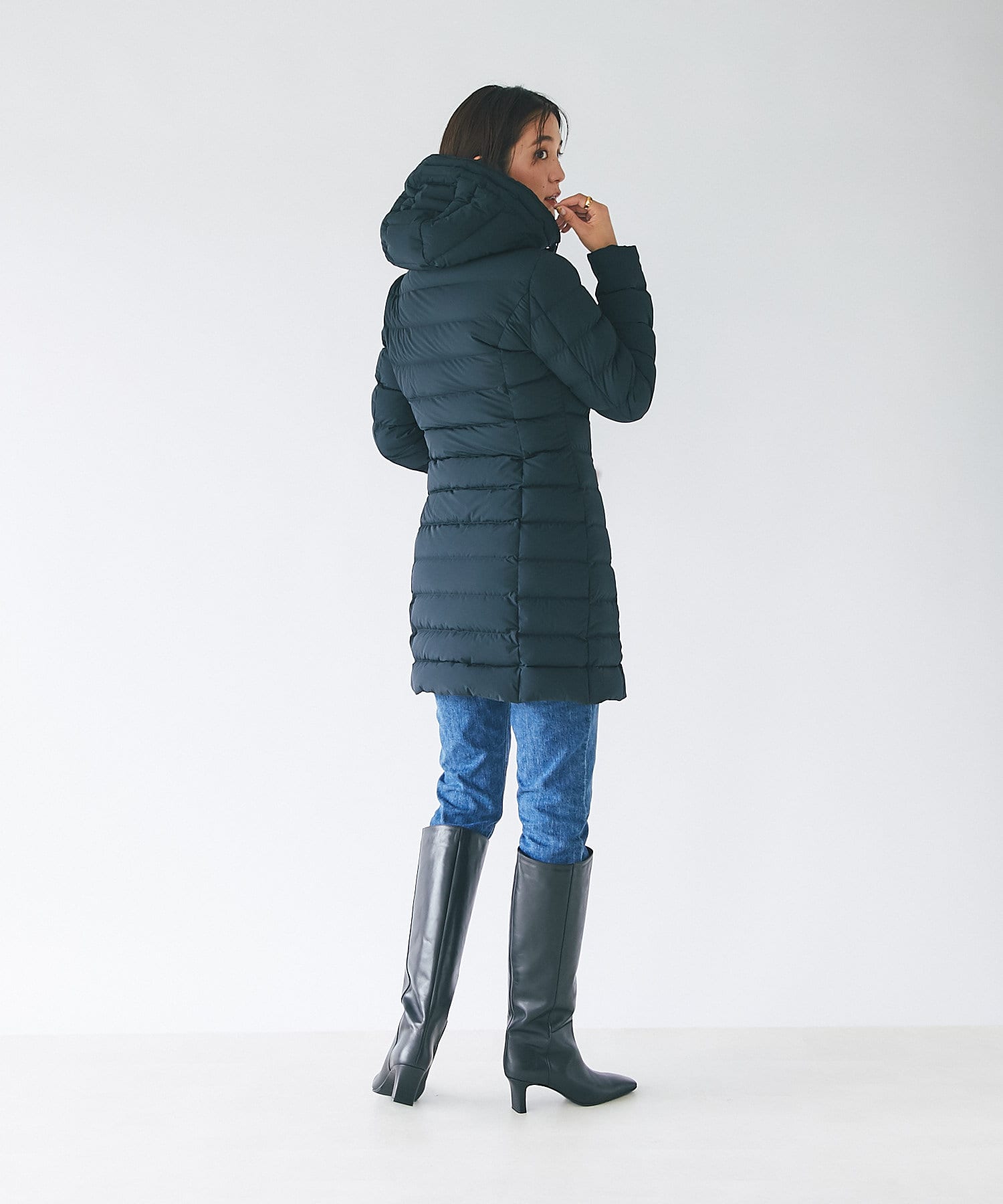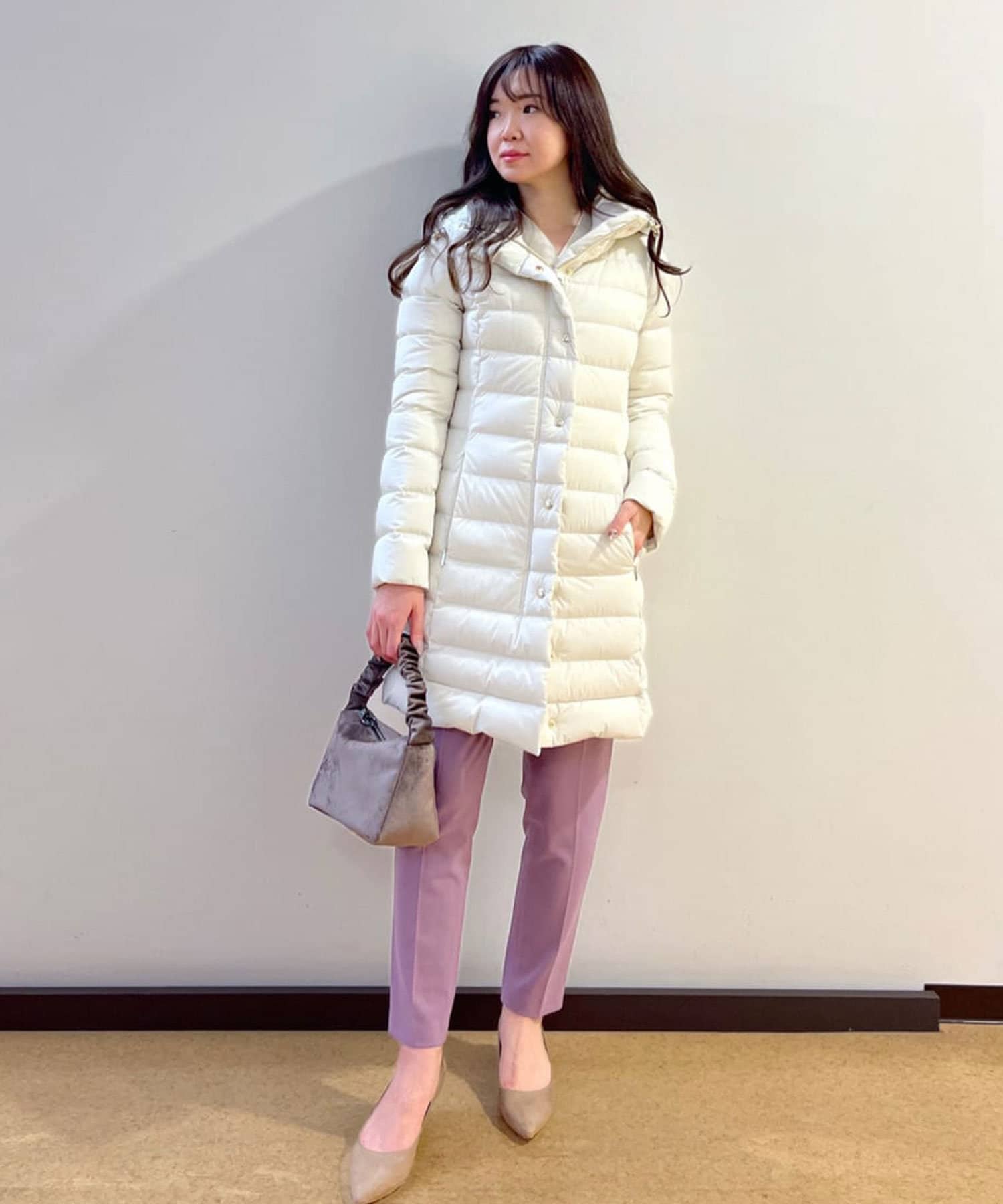 ヒップがしっかり隠れる丈、細めのダウン幅、高めのウェスト位置でスタイルアップを叶えます。