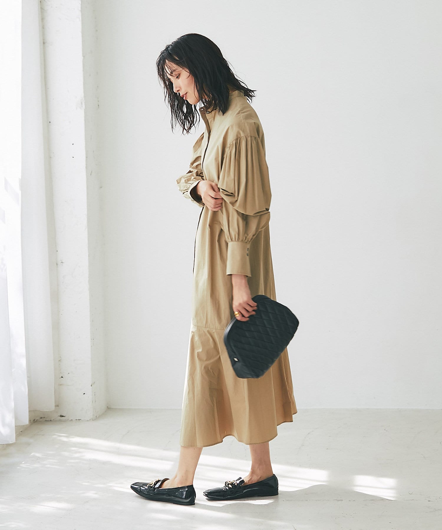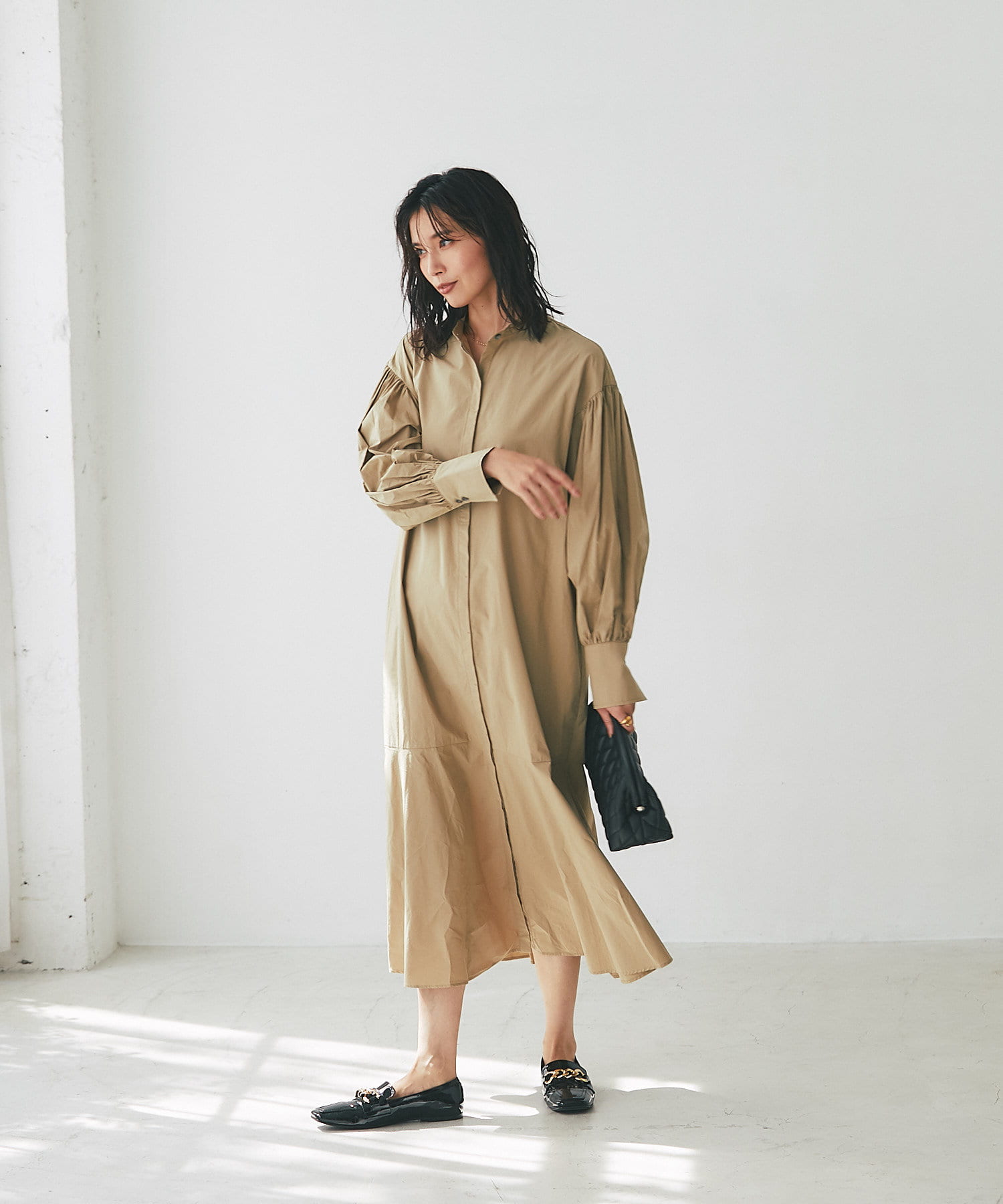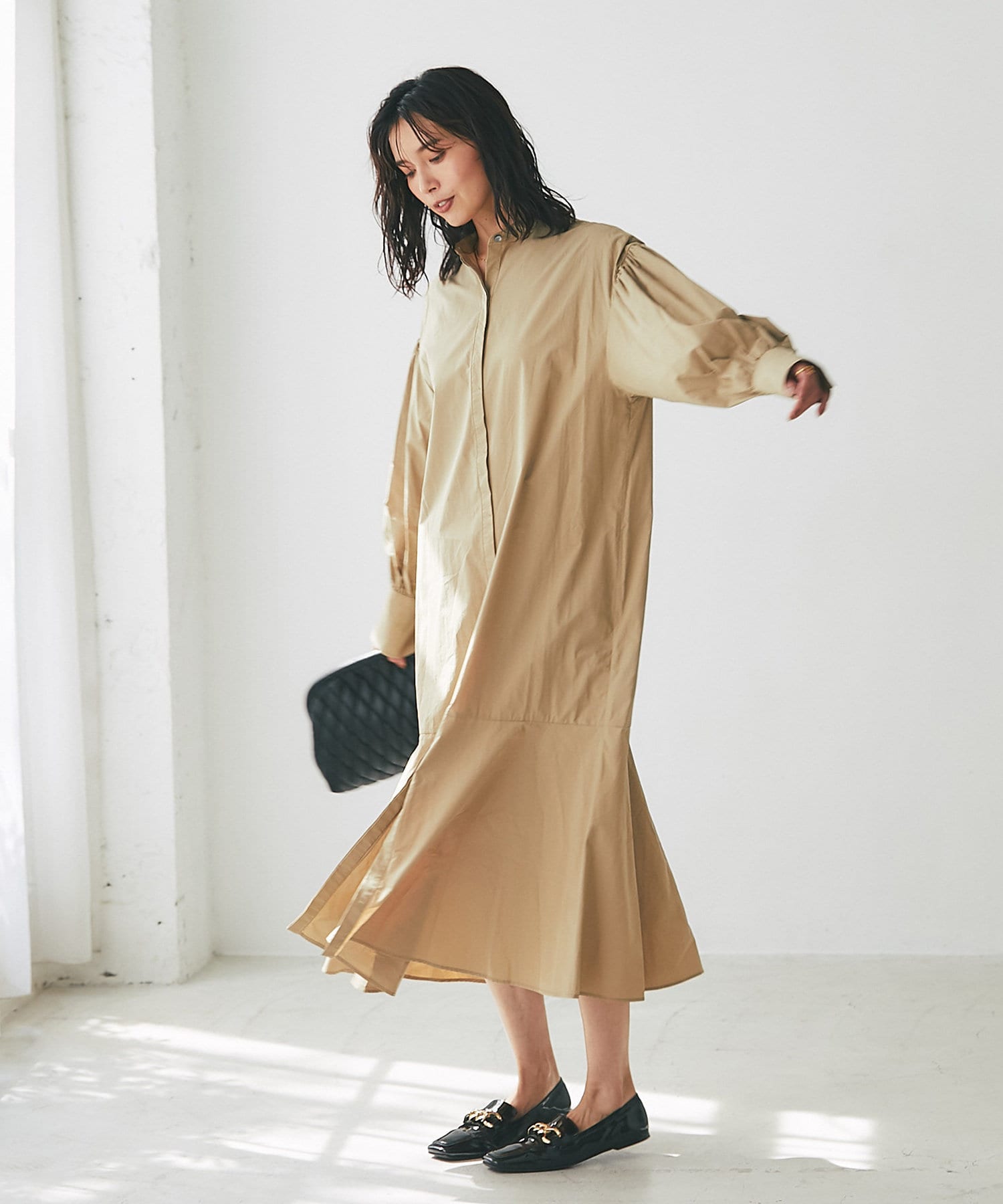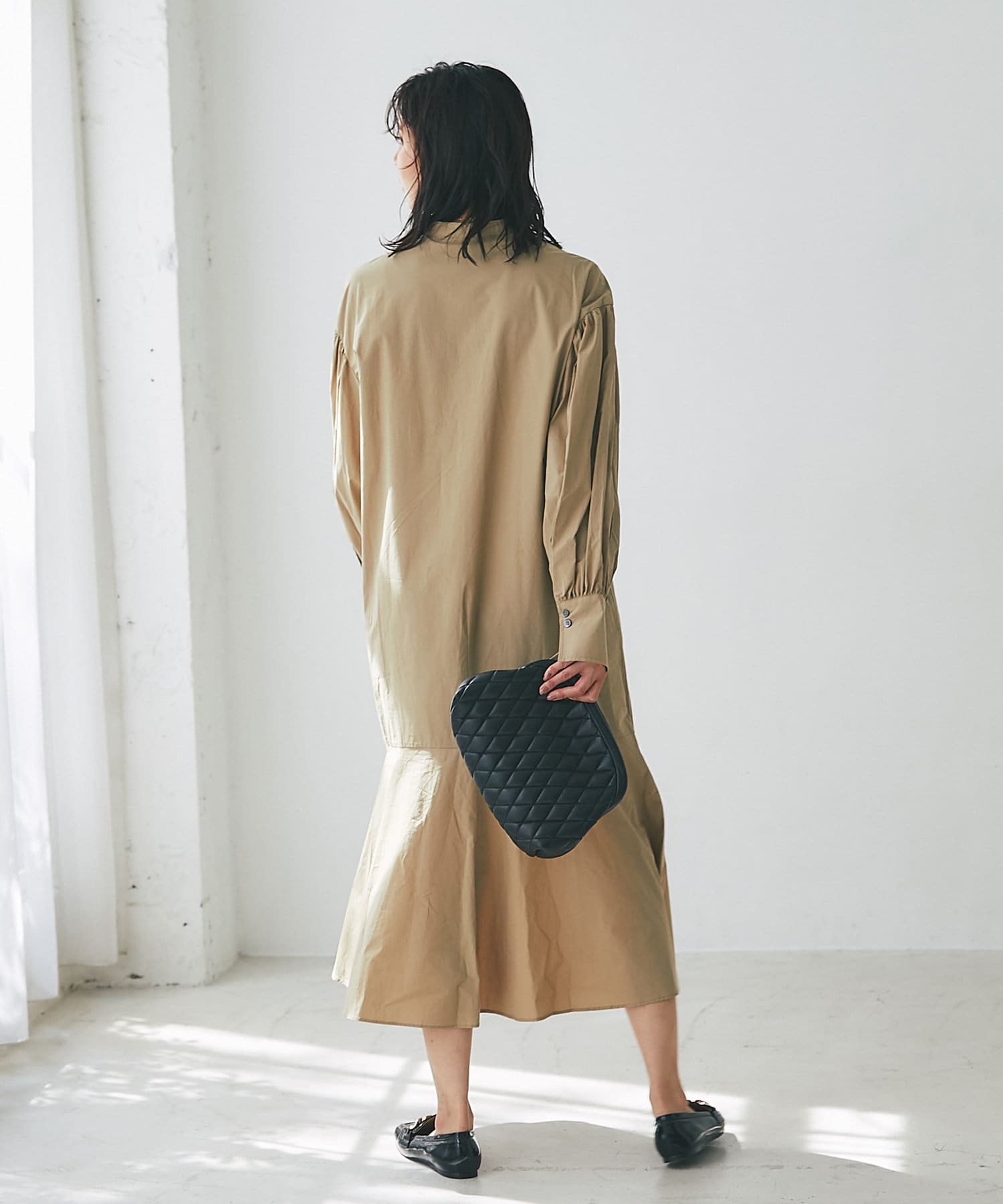 裾を切り替え、シルエットにこだわったシャツワンピース。