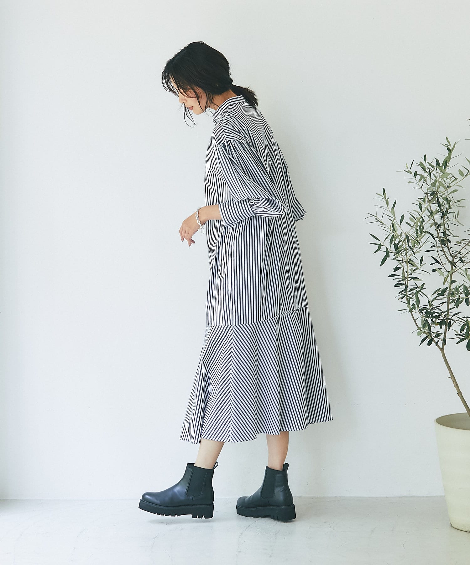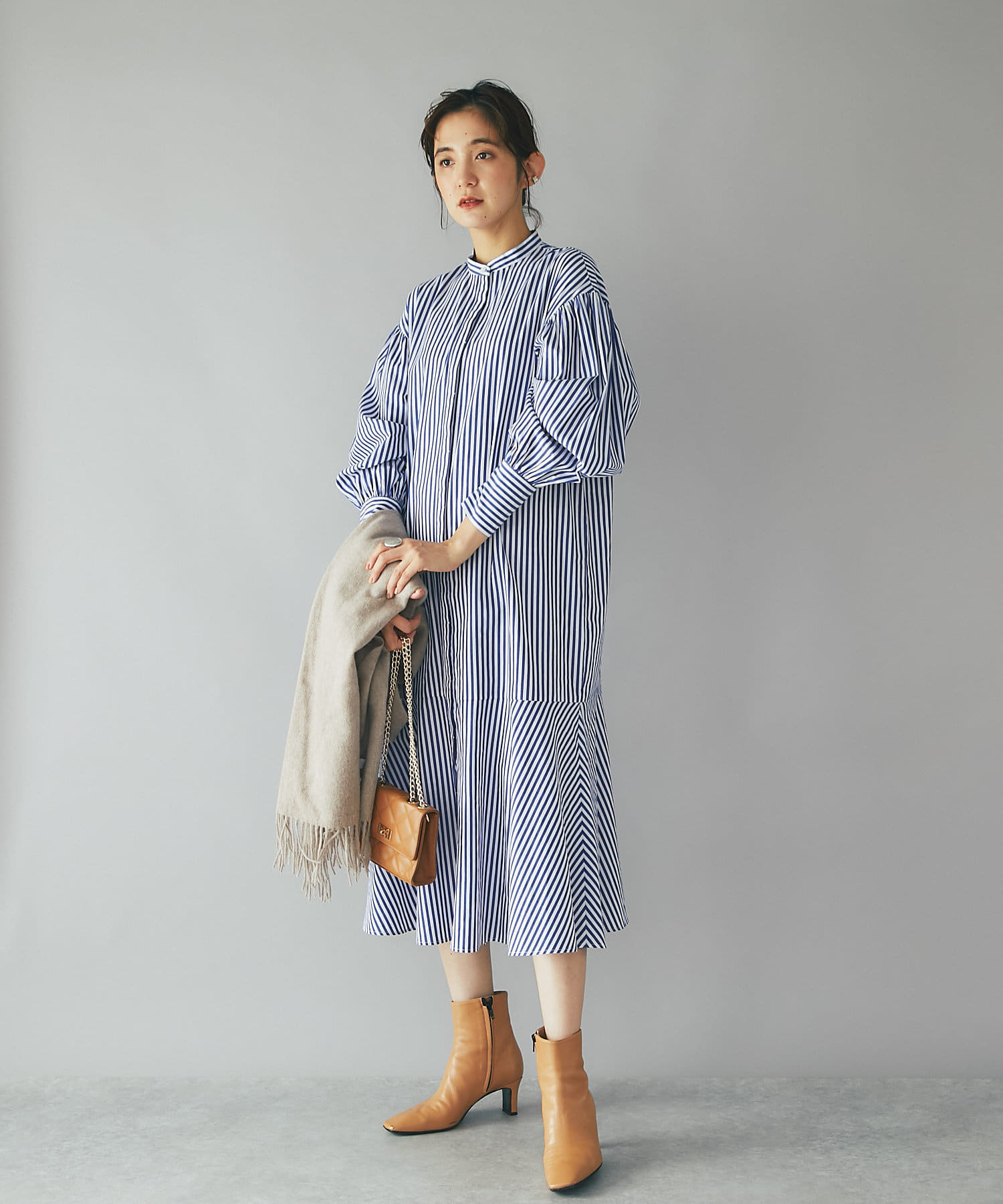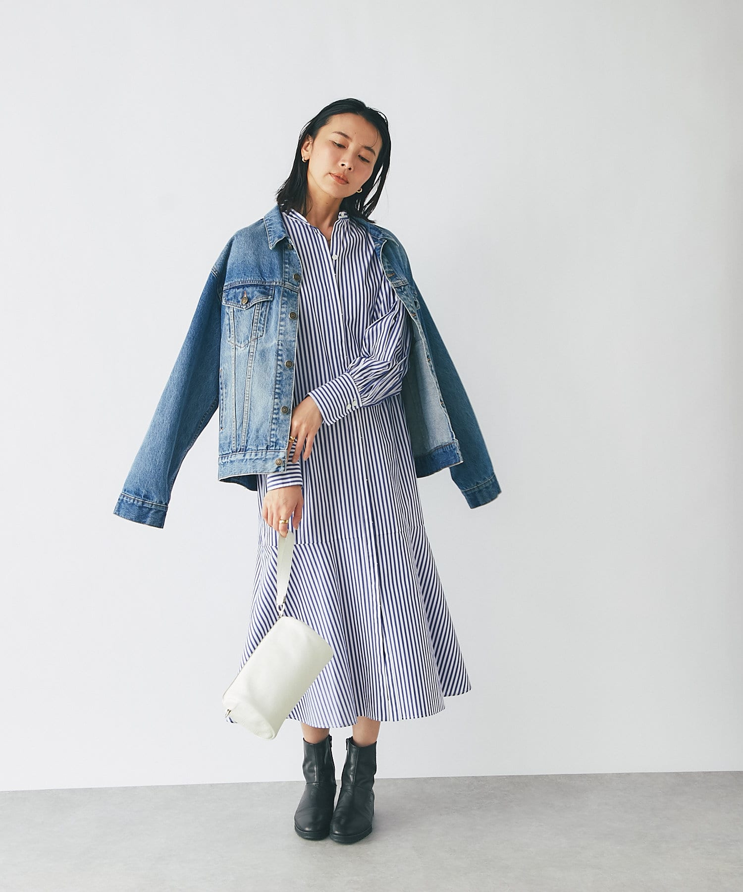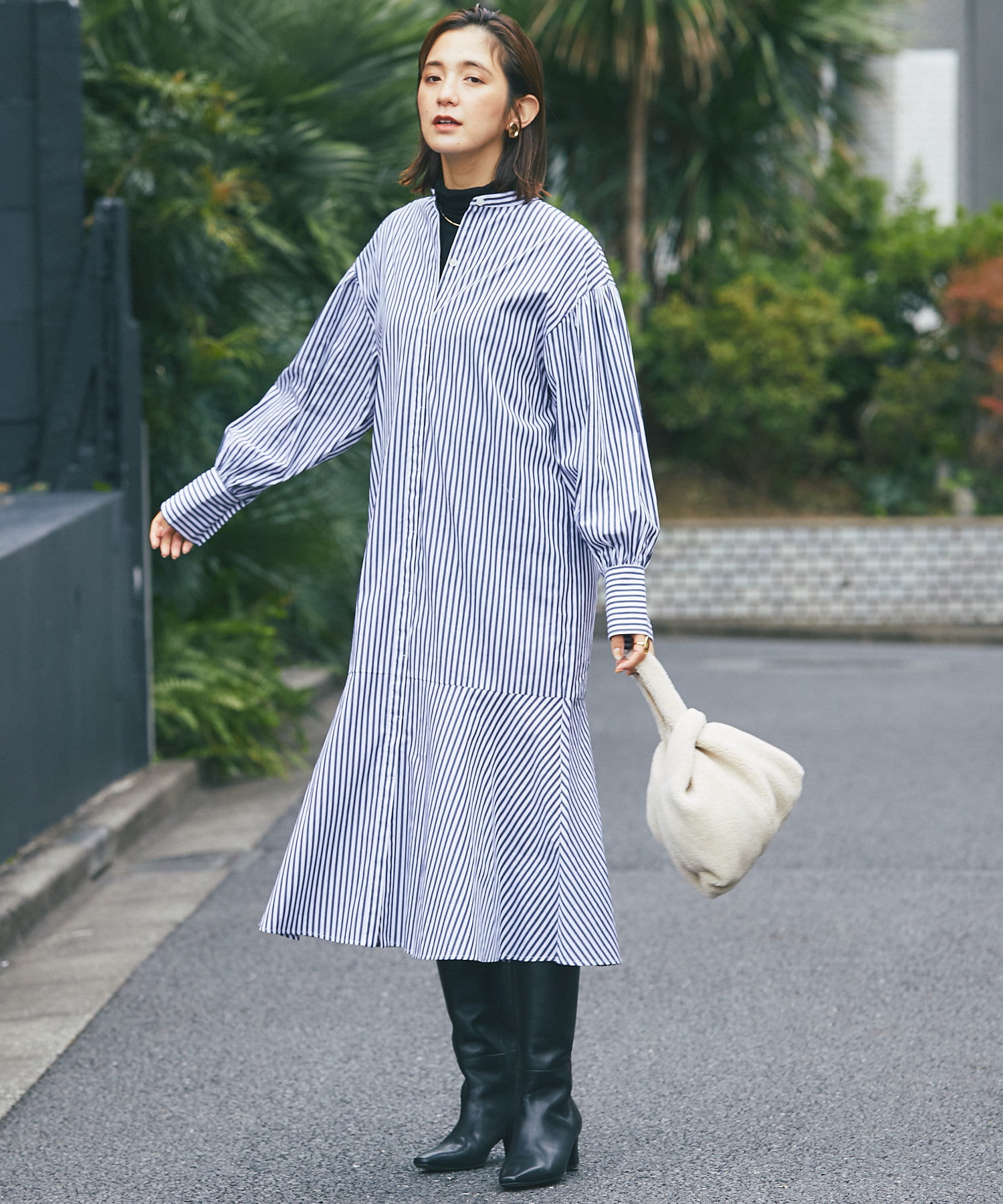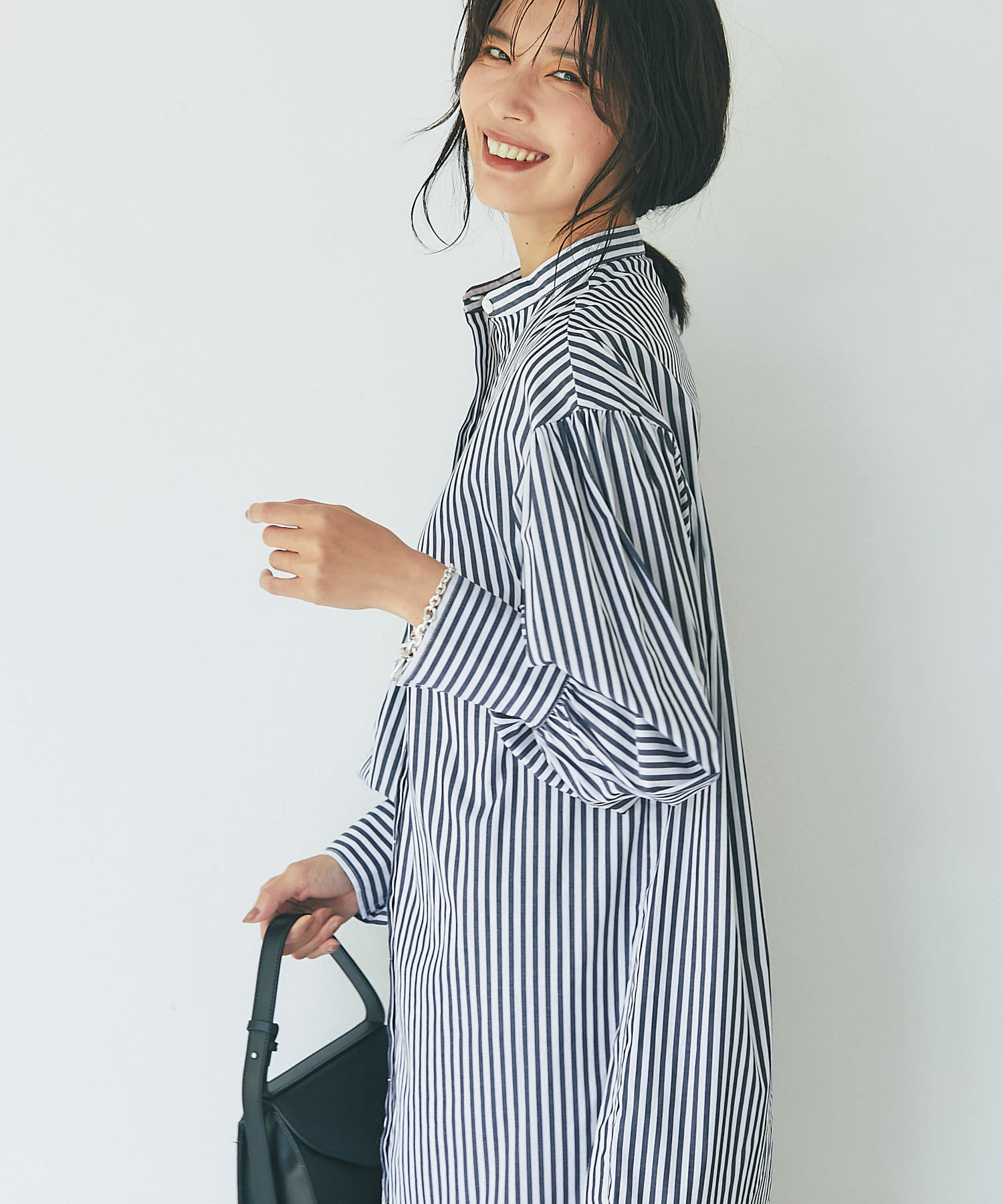裾を切り替え、シルエットにこだわったシャツワンピース。