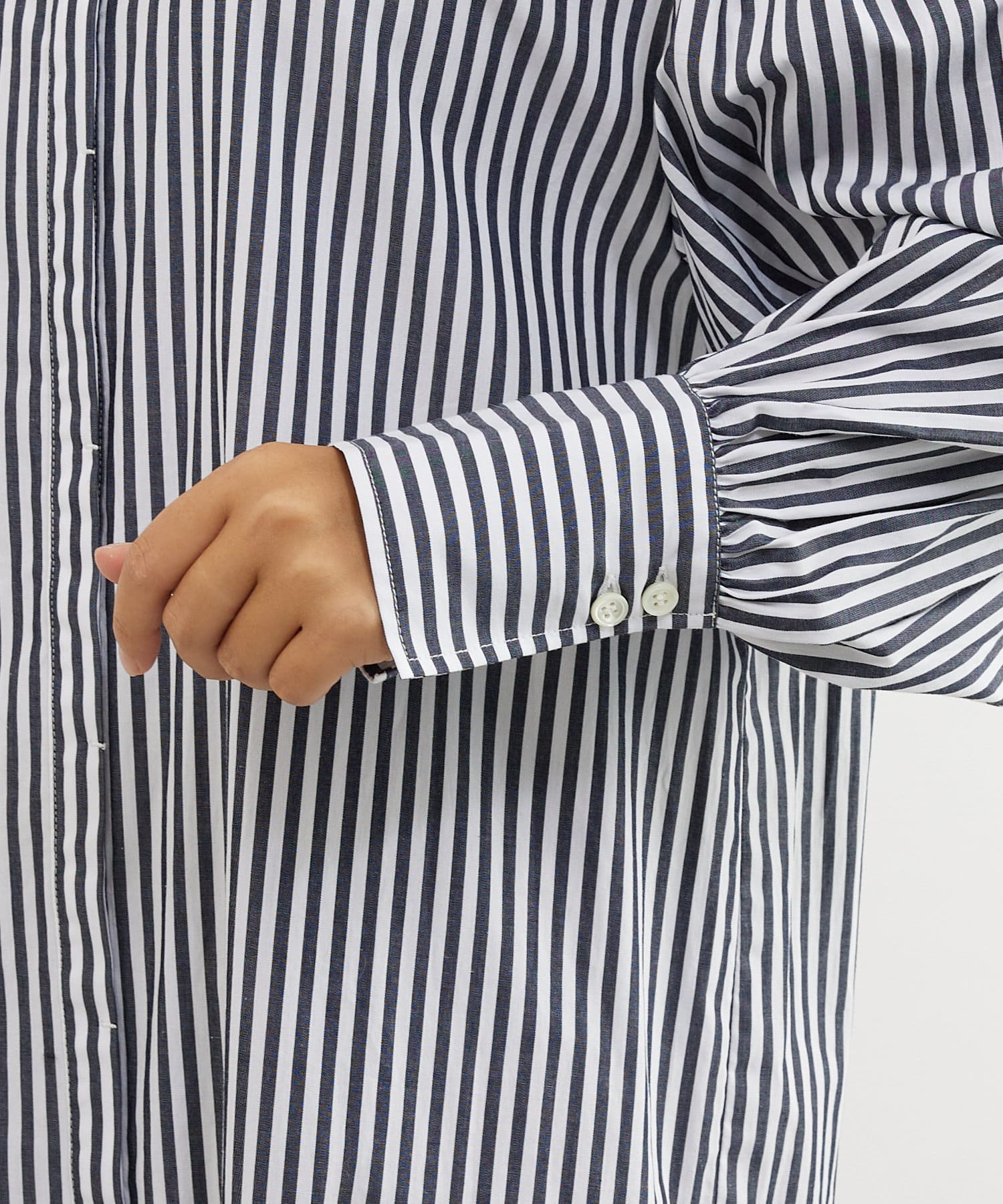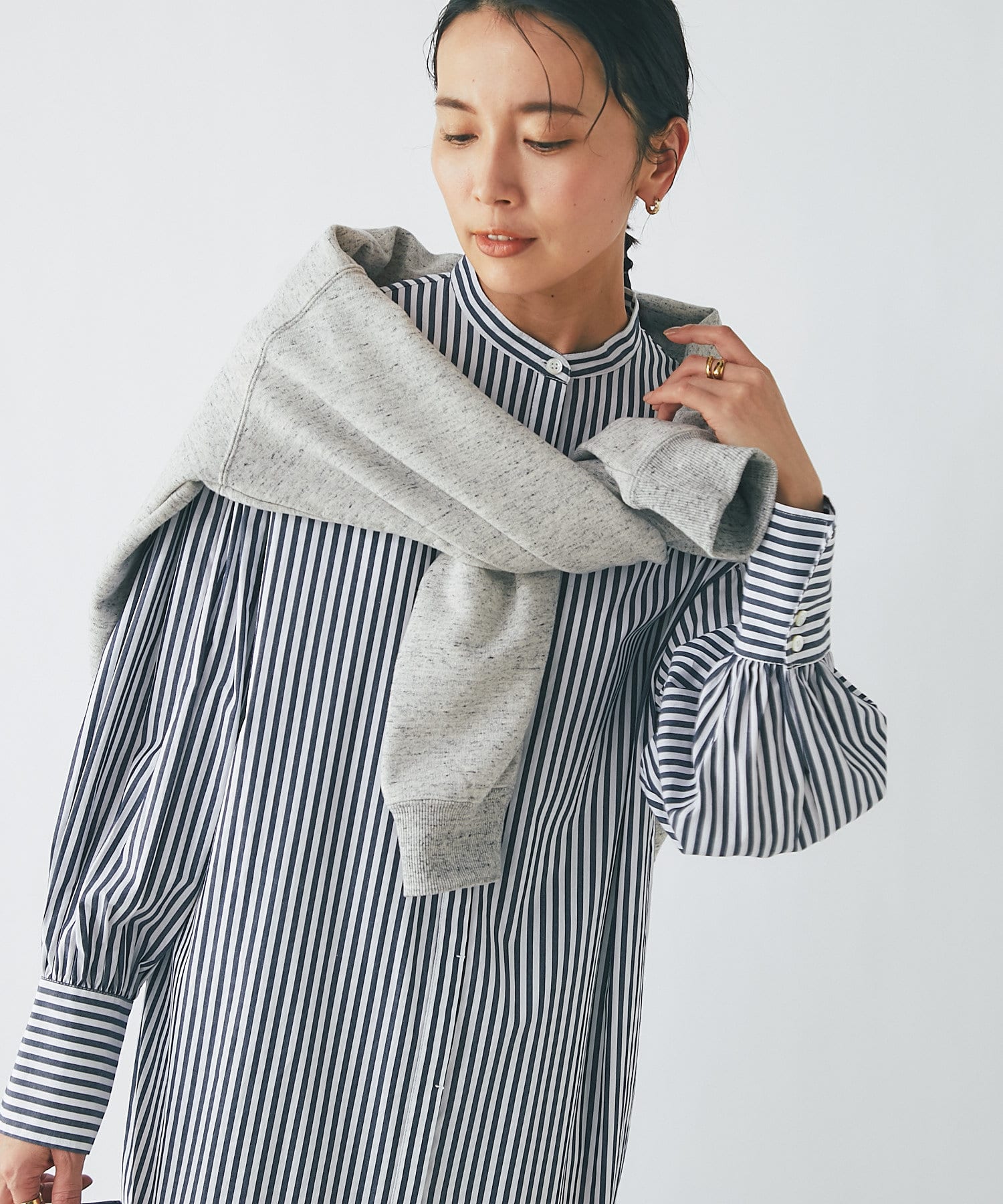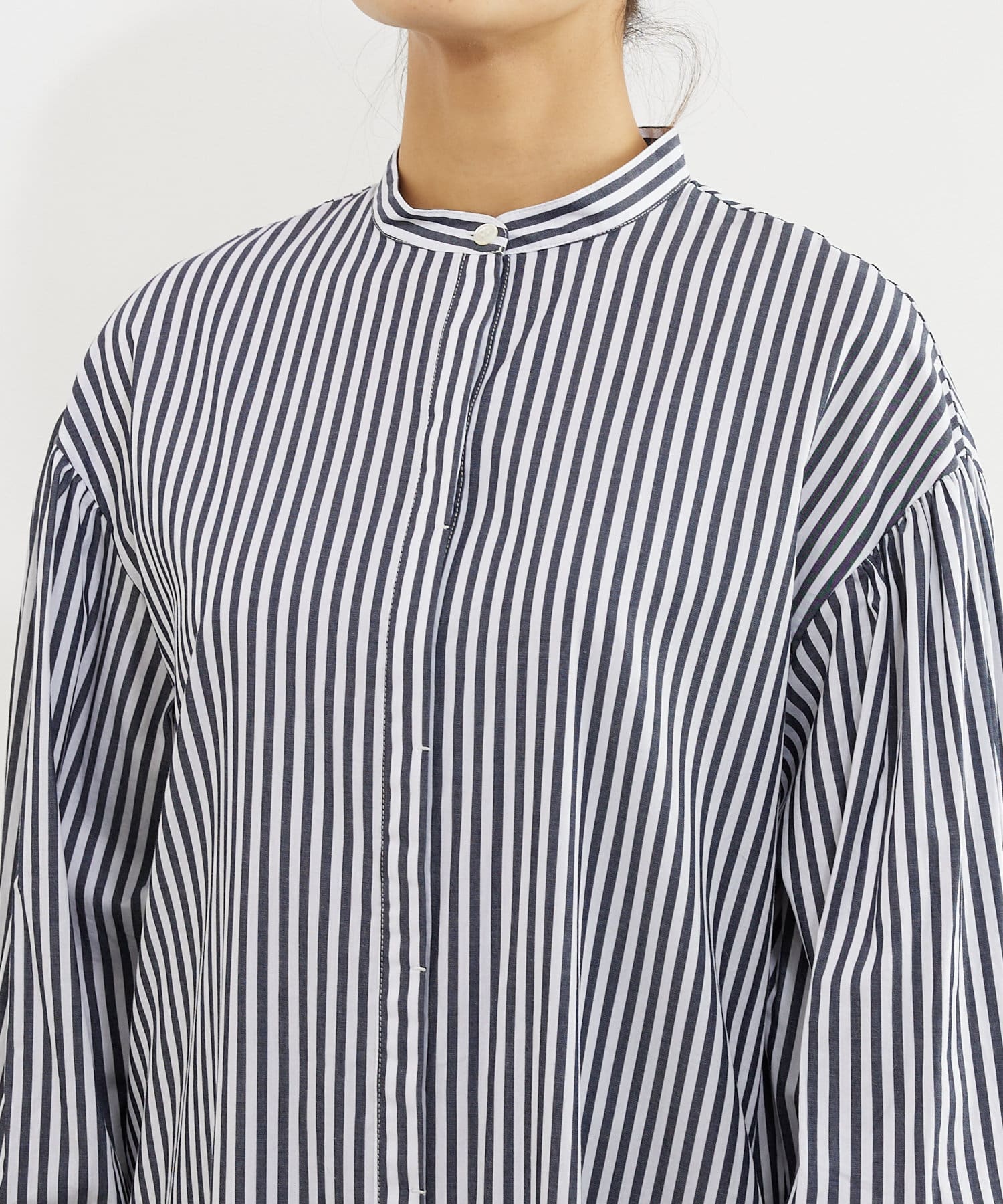 袖にはギャザーを施し、程よいボリューム感を加え、一枚でも着映えするようにデザインされています。