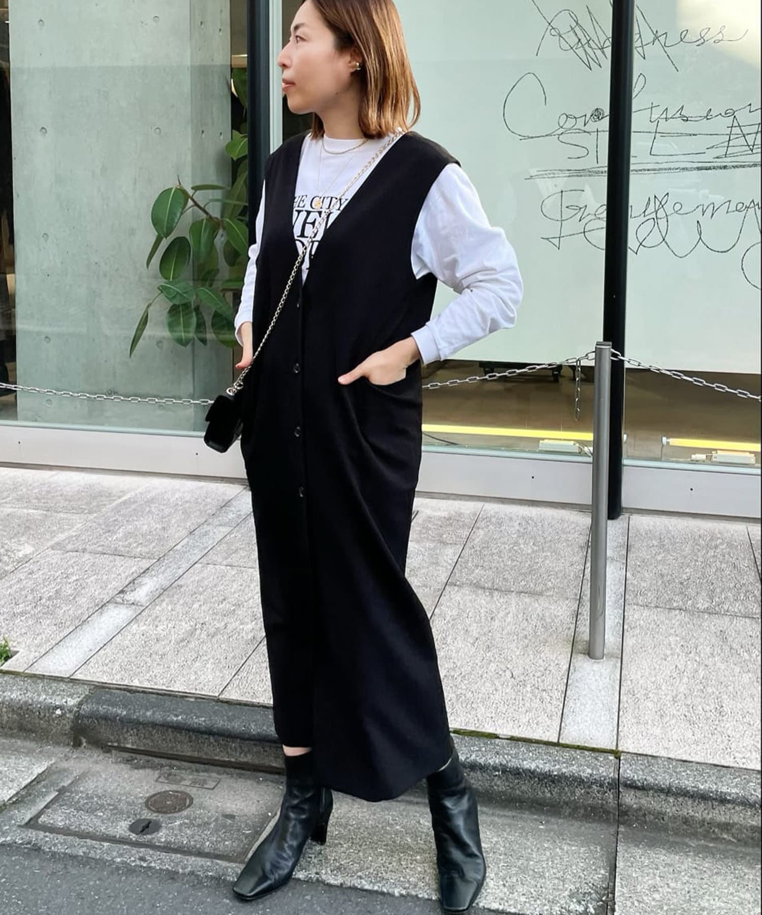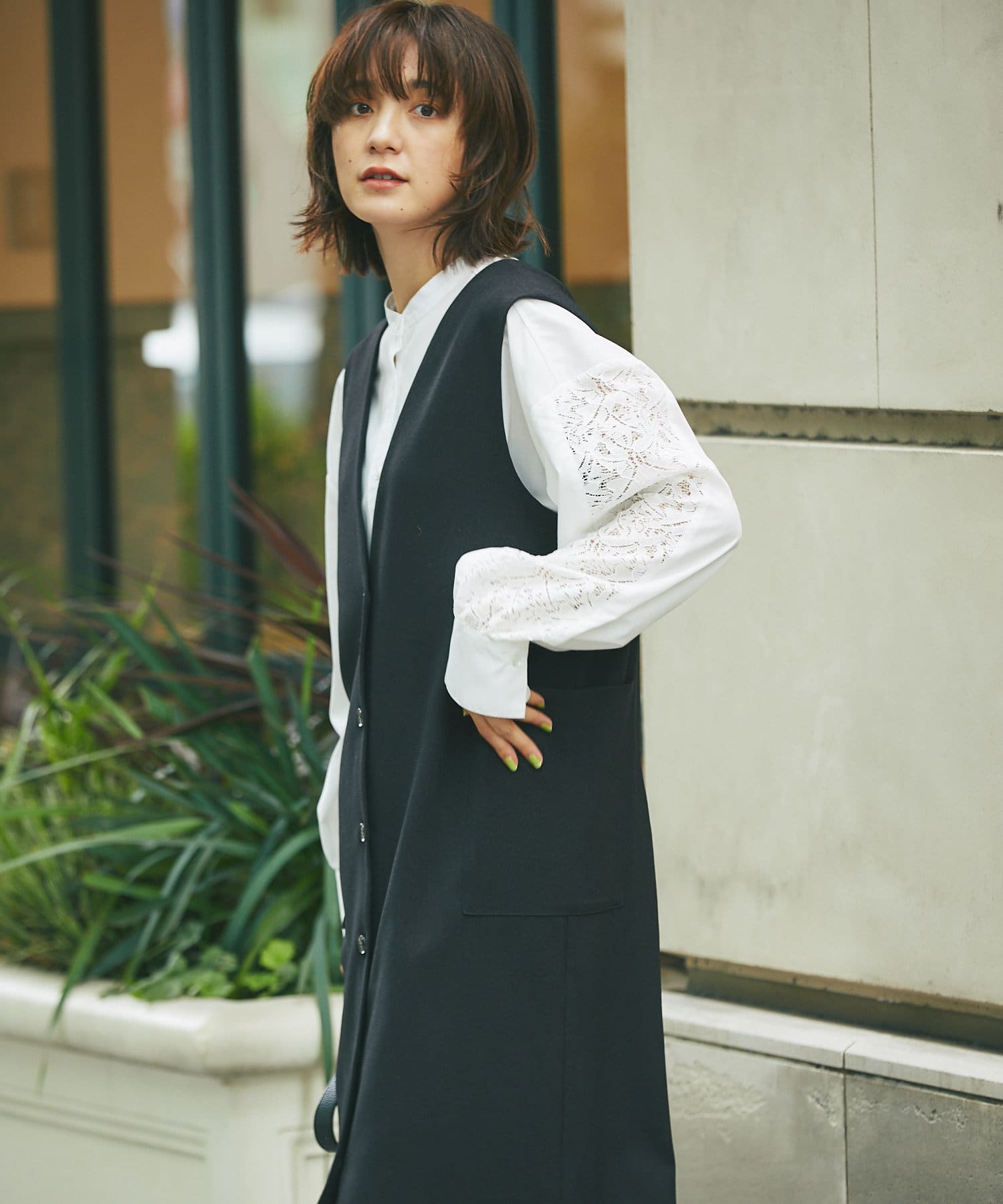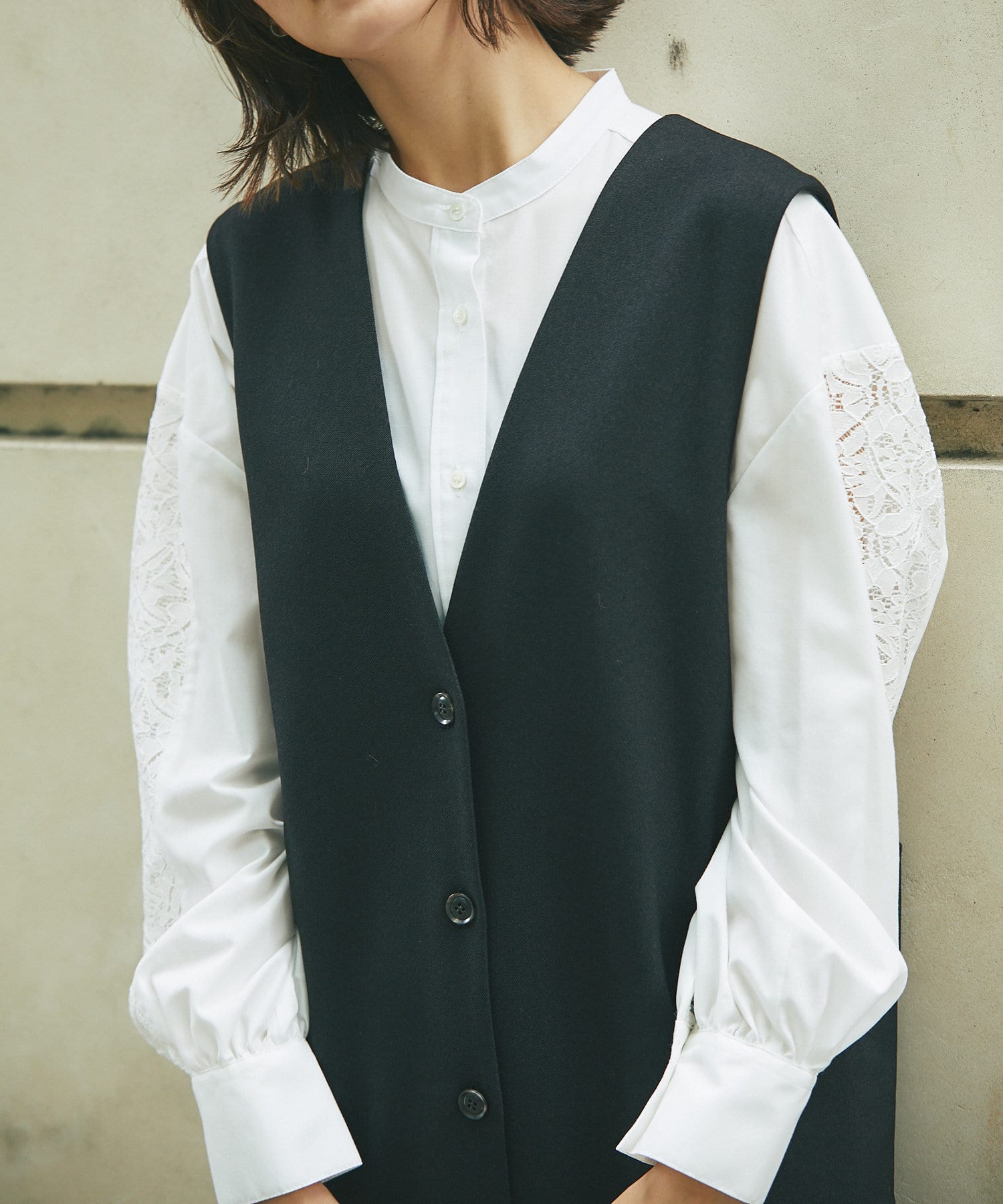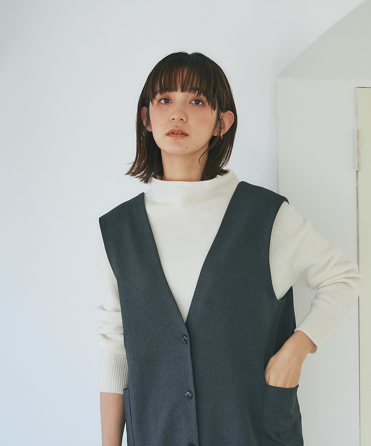 また、ロンTやカジュアルニットなどで合わせると普段使いもしやすく、デザイン性のあるインナーにプラスし、ジレとしても着こなしもオススメです。
