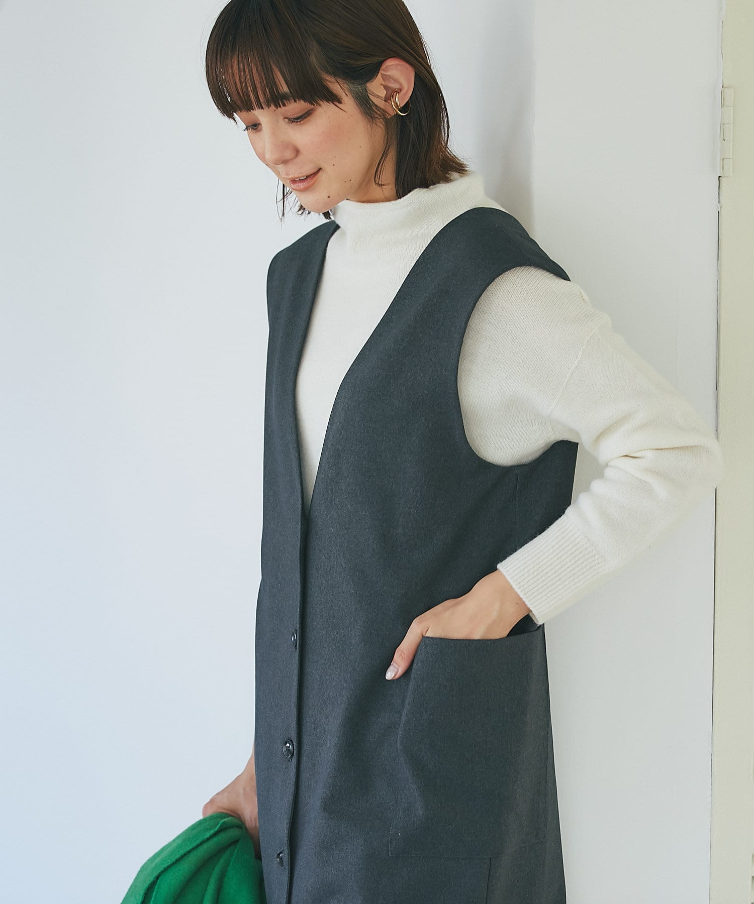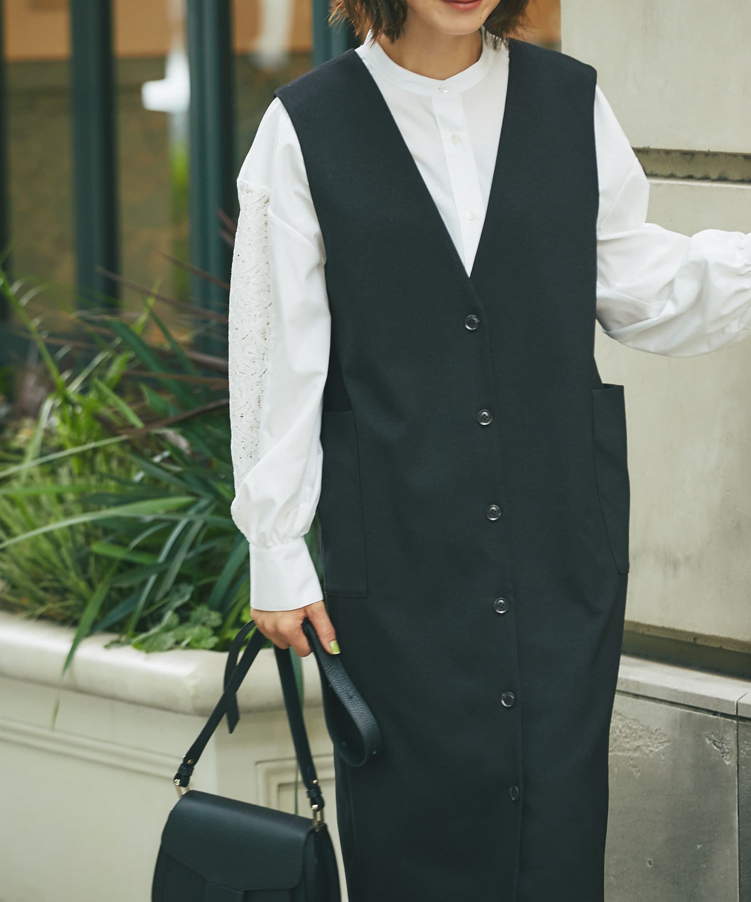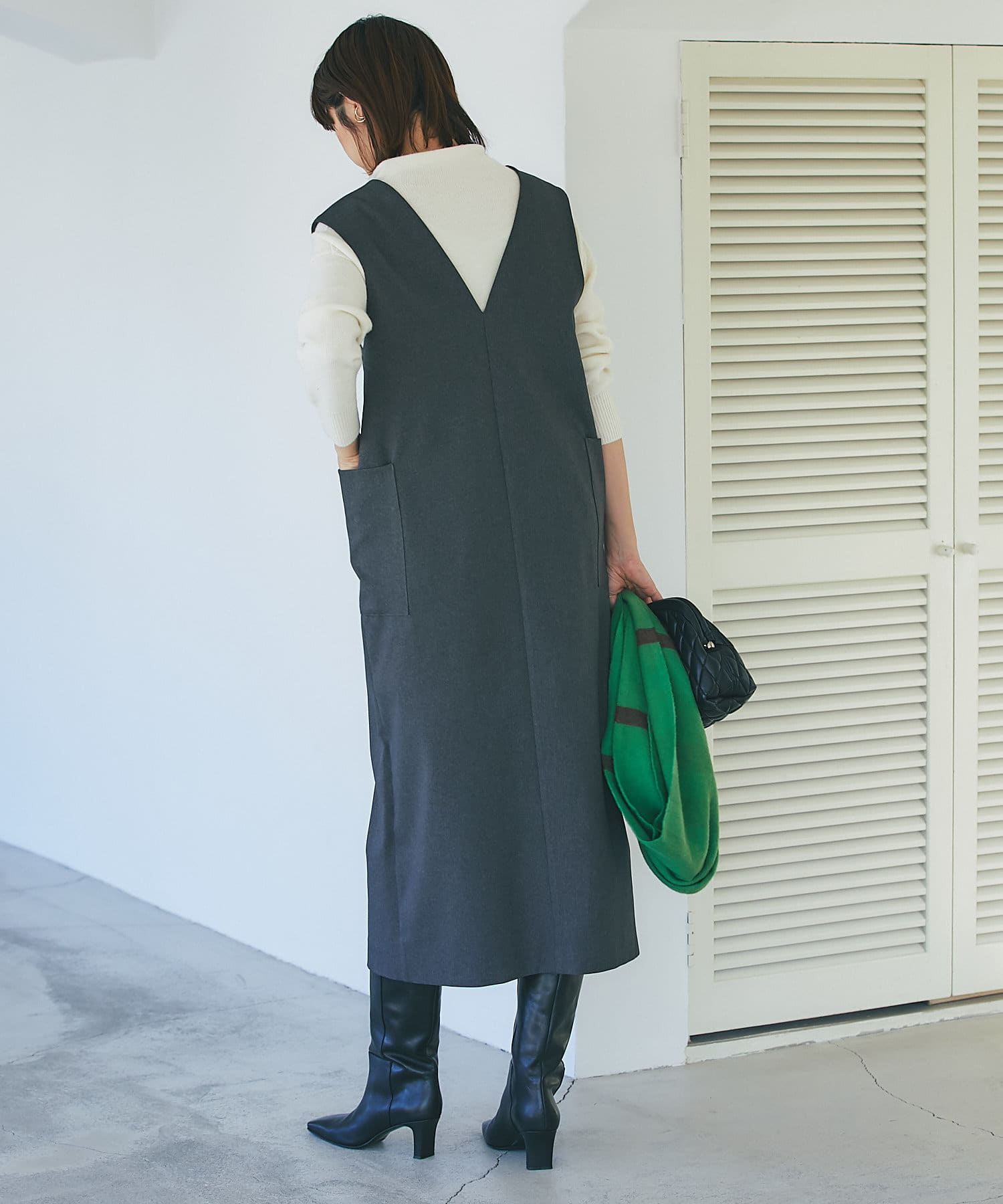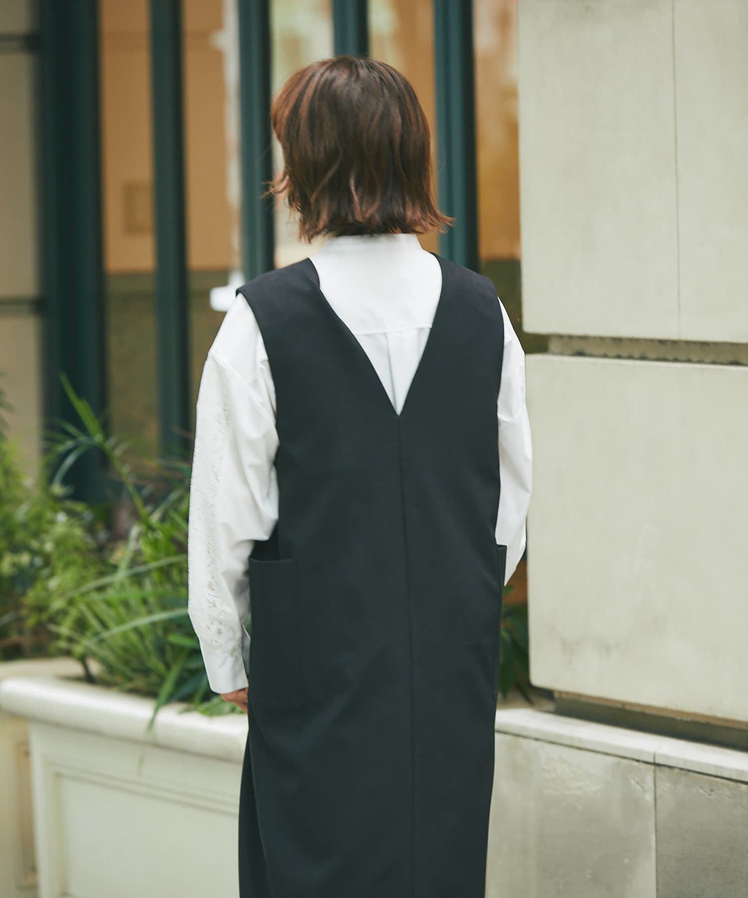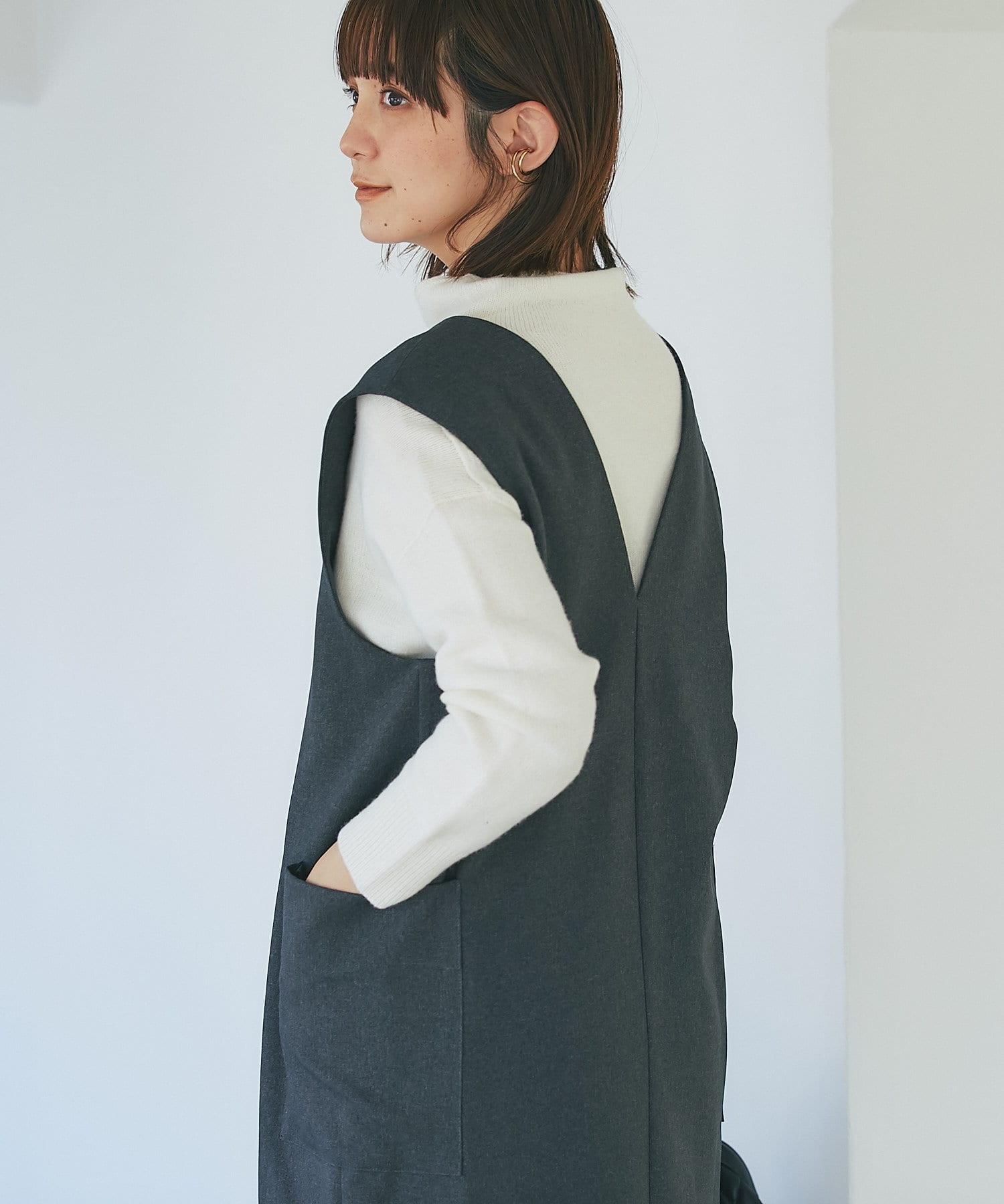 また、マルチWAYになっておりますので、前後で着用できるのはもちろん、今季らしいジレでのコーディネートもオススメ。