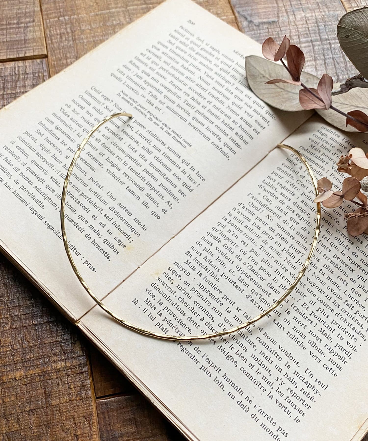 首に沿うような華奢さで女性らしく付けられ線曲げチョーカー。