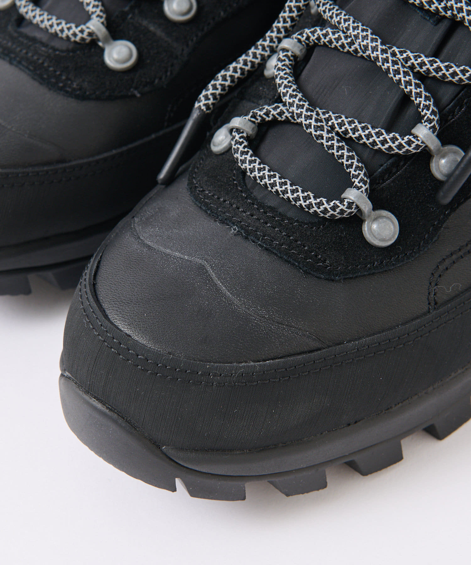 耐久性に優れたレザーとリサイクルポリエステルを組み合わせたアッパーを採用し、衝撃を吸収するミッドソールやグリップ力の高いTPUラバーアウトソール、足を踏み出すたびに泥を逃す深いトレッドが特徴的です。