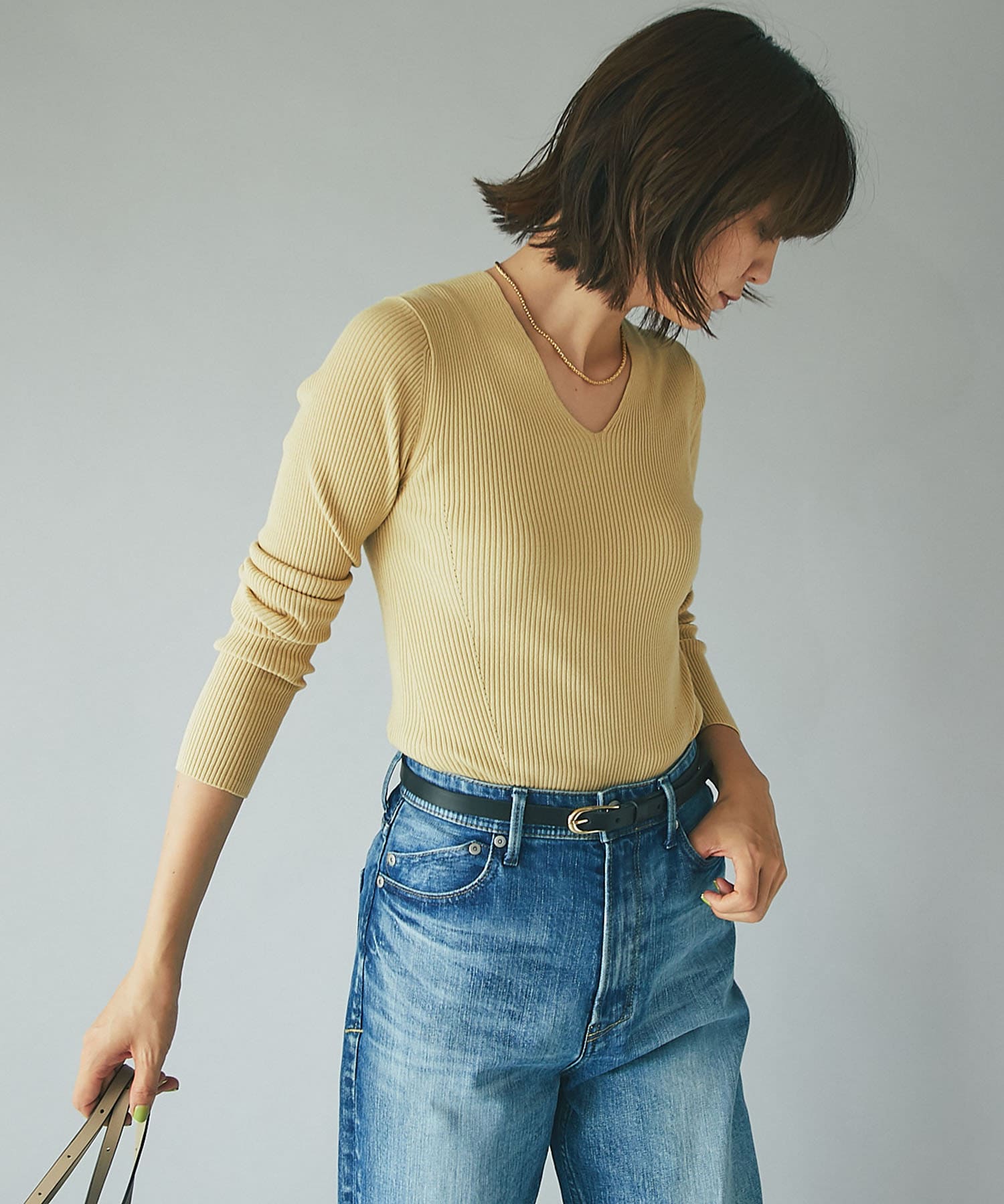 スカート、パンツにとボトムを選ばずに使えるシンプルなデザイン。