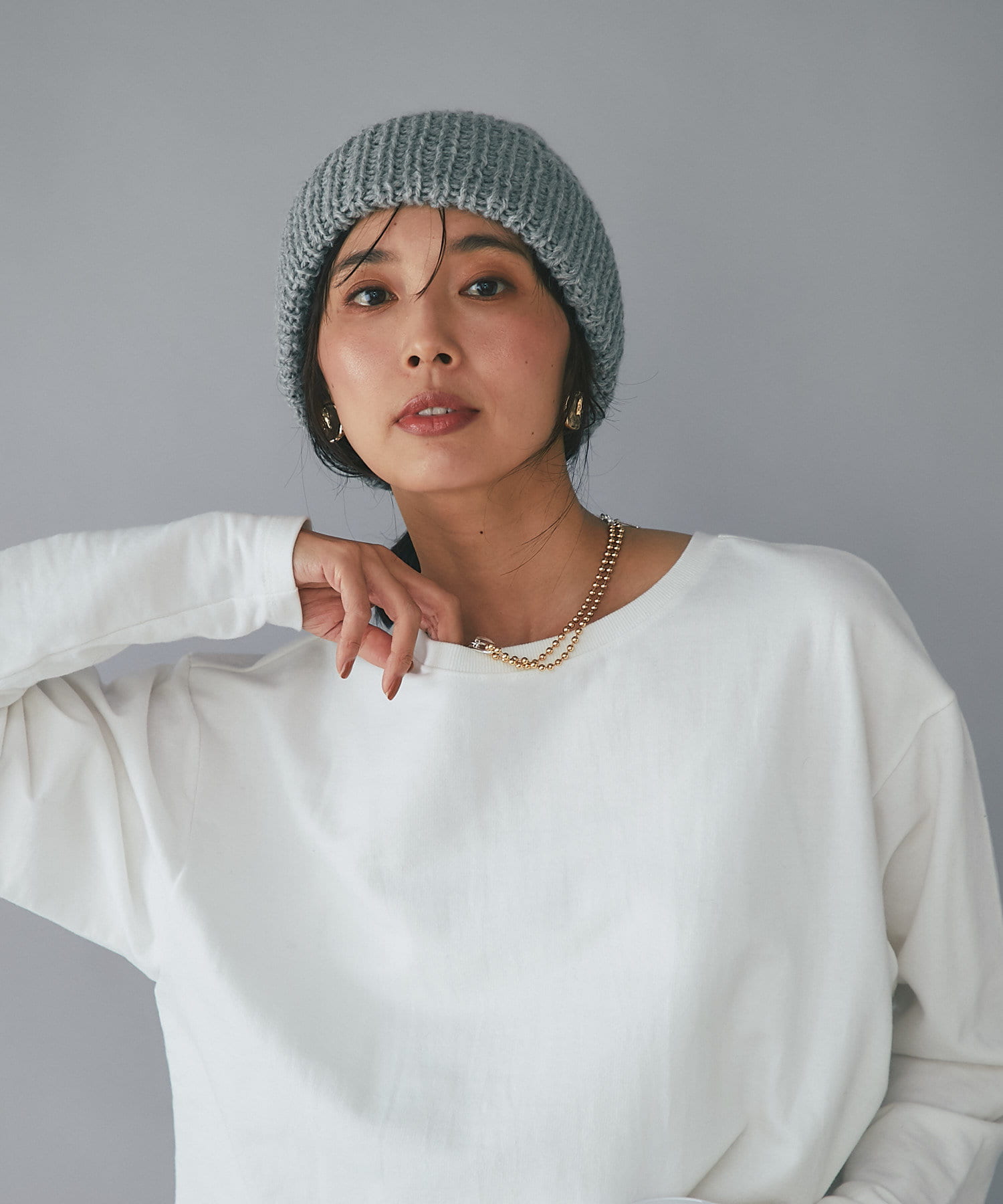 大人のコーディネートに取り入れやすい、グレー、サックス、ダークグリーンの3色展開。