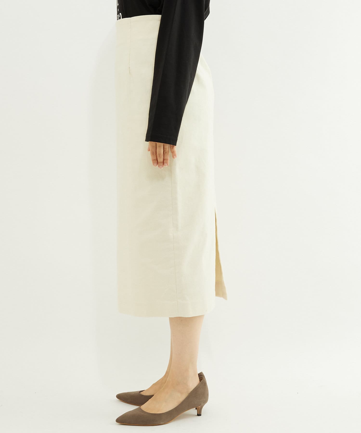 ハイウエストに仕上げ、裾に向かって少しつぼまったシルエットなのでスタイルアップ効果◎
