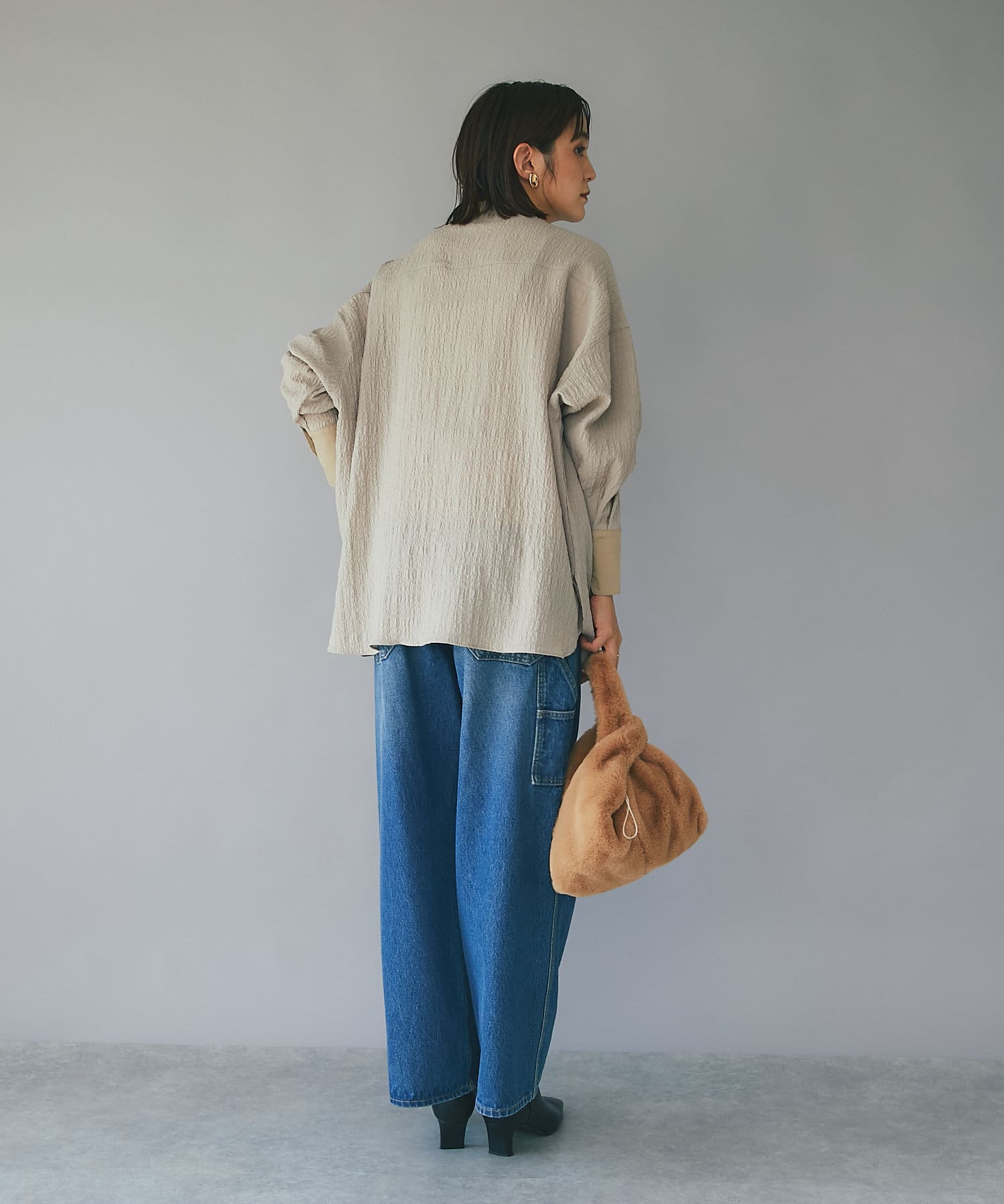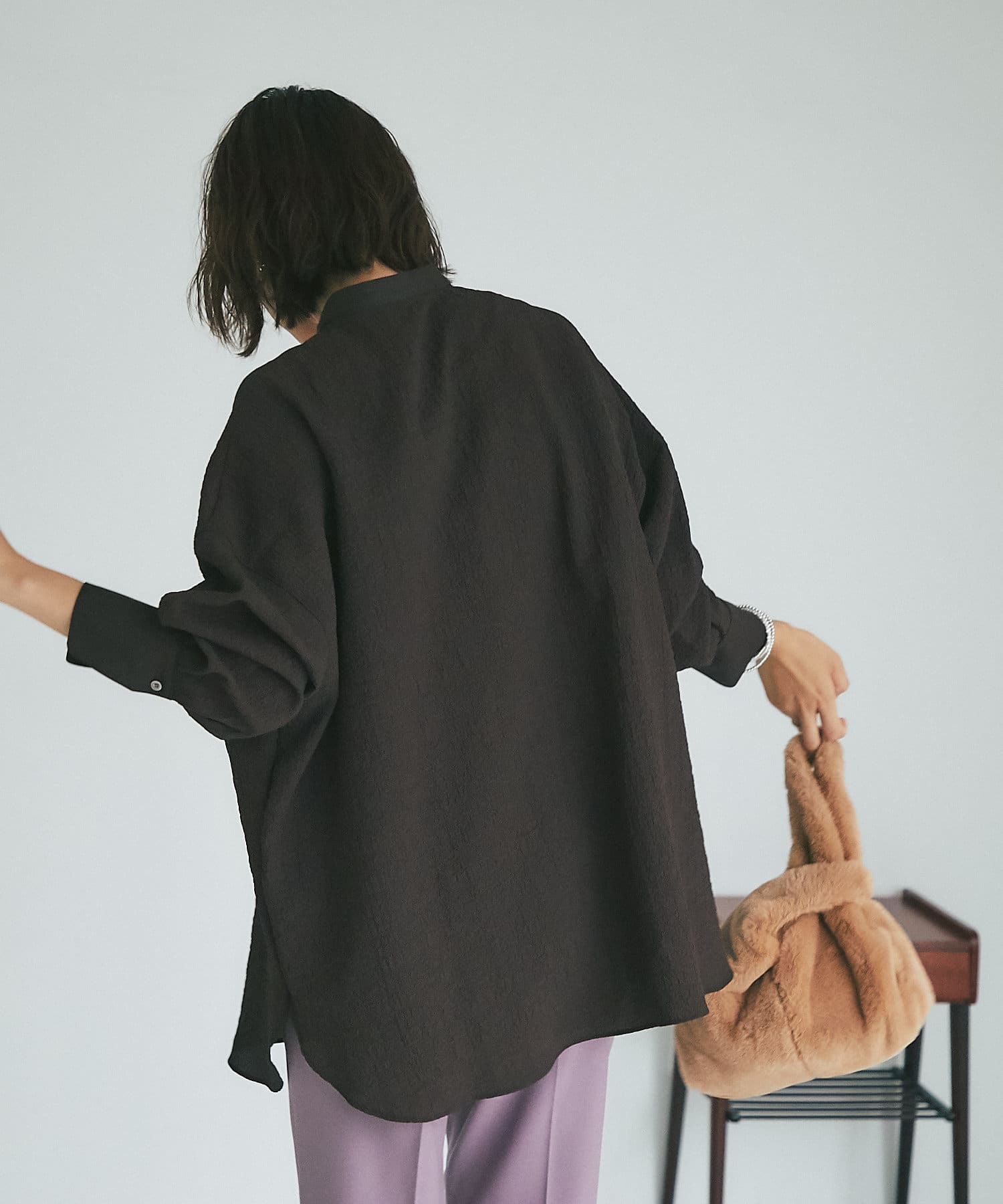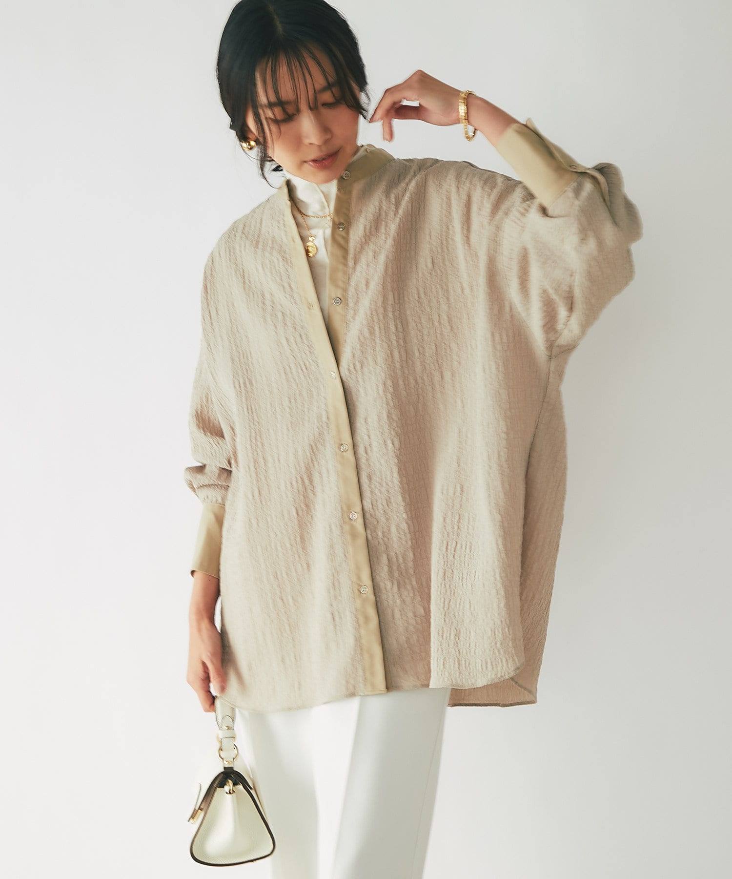 ポコポコとした表情豊かな素材が存在感を放つオーバーサイズシャツ。