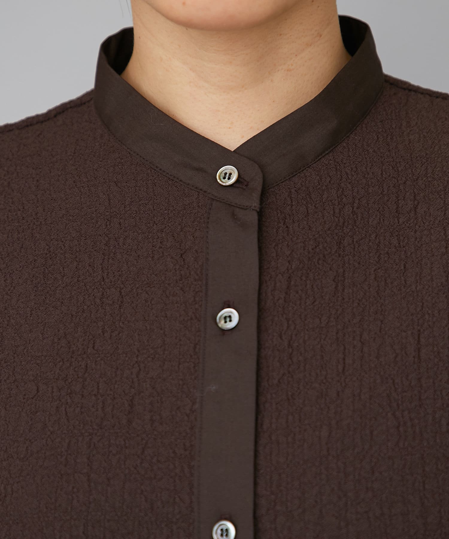異素材使いのバンドカラーと前立てがアクセントとなり全体の印象を引き締めてくれます。                                                                立体感がありながらキレイめな生地感とリラックスしたサイジングでカジュアルにもキレイ目めにも合わせやすいデザインです。                                                                                                                                                        シワになりにくくイージーケアも可能なところも魅力的なアイテム。