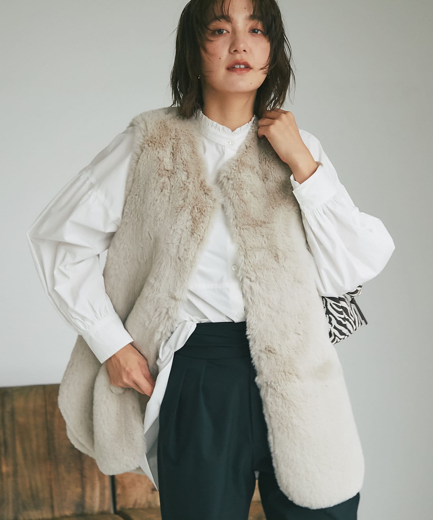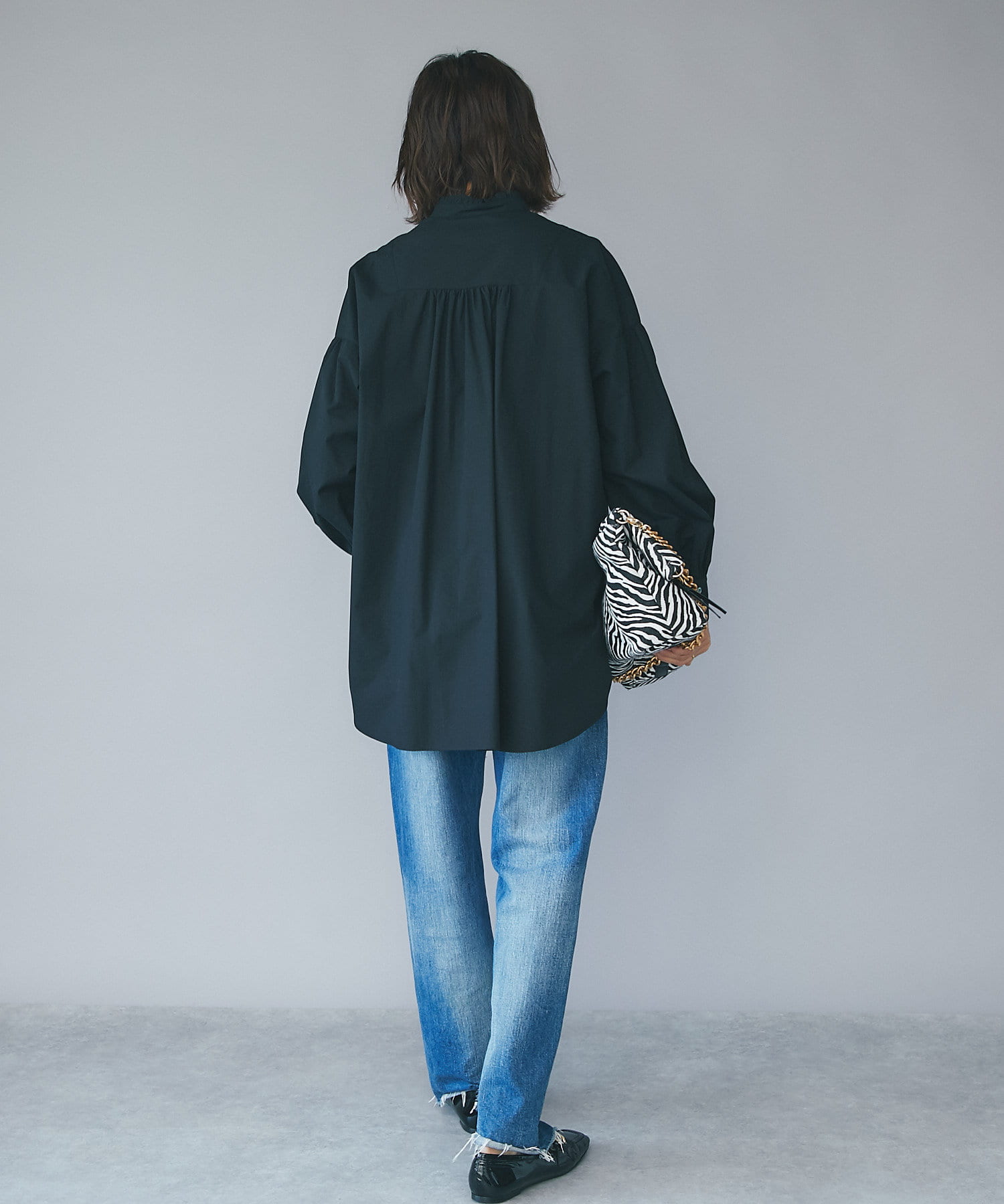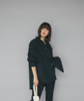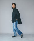 オーバーシャツとして1枚で着用するのも素敵ですが、フリルカラーをのぞかせたニットとの重ね着スタイルもおすすめ。