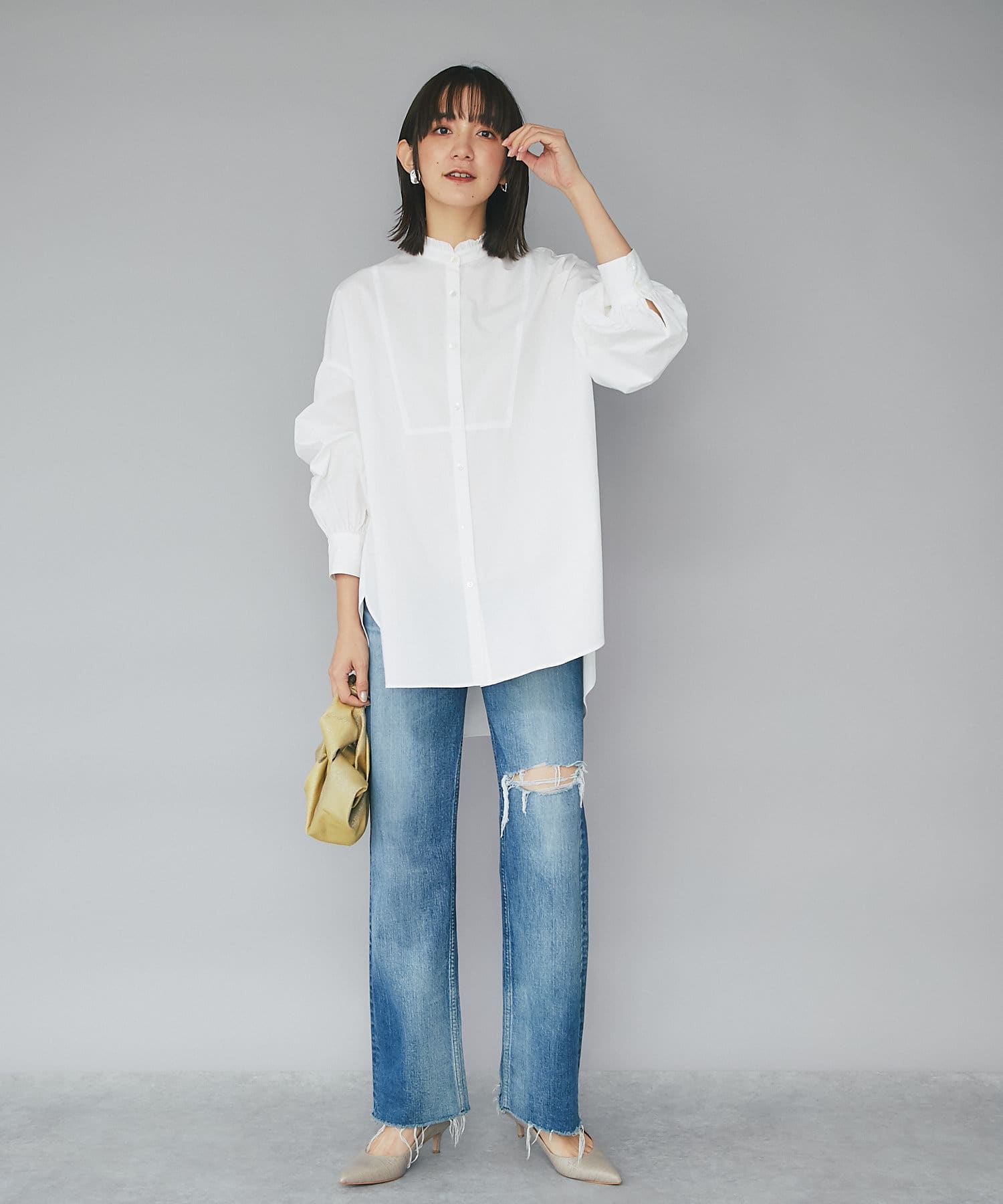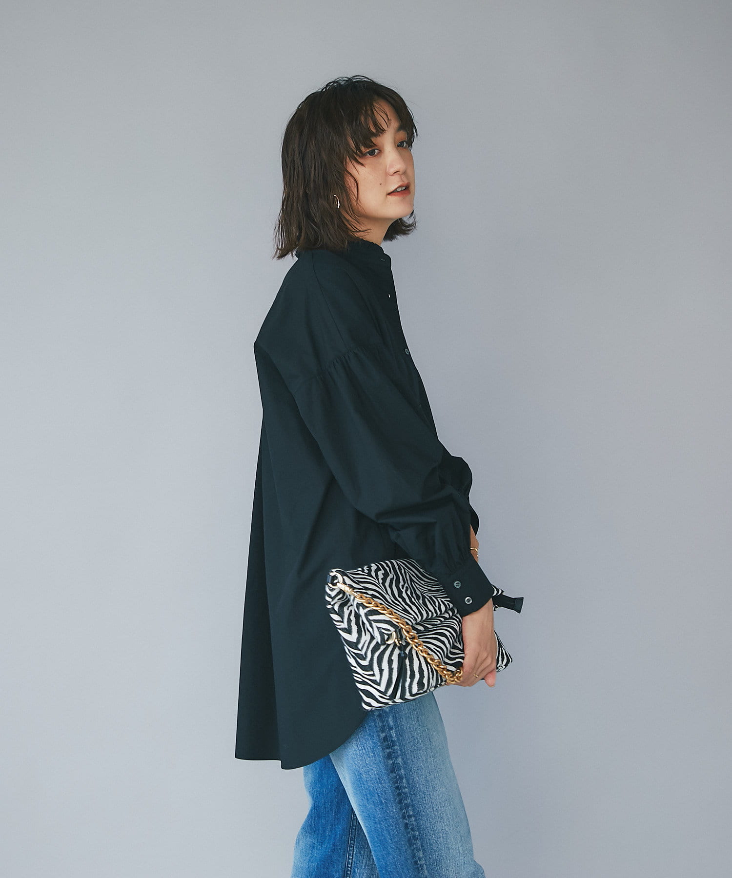 フリルカラーとボリュームスリーブが印象的なボザムシャツ。